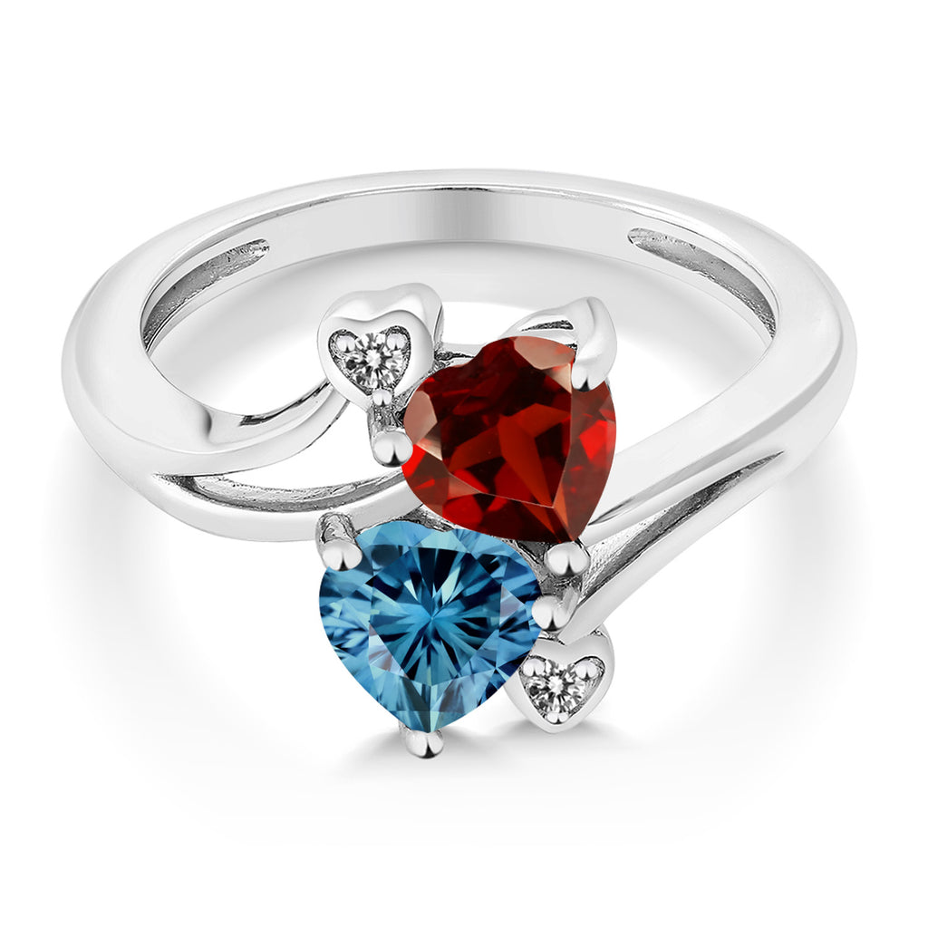 MEASUREMENTS: 6x6mm Heart Shape Red Garnet, 6x6mm Heart Shape Coated Persian Blue Moissanite1.5, x, 1.5, mm Round White Diamond. Total Carat Weight is 1.83 cttw