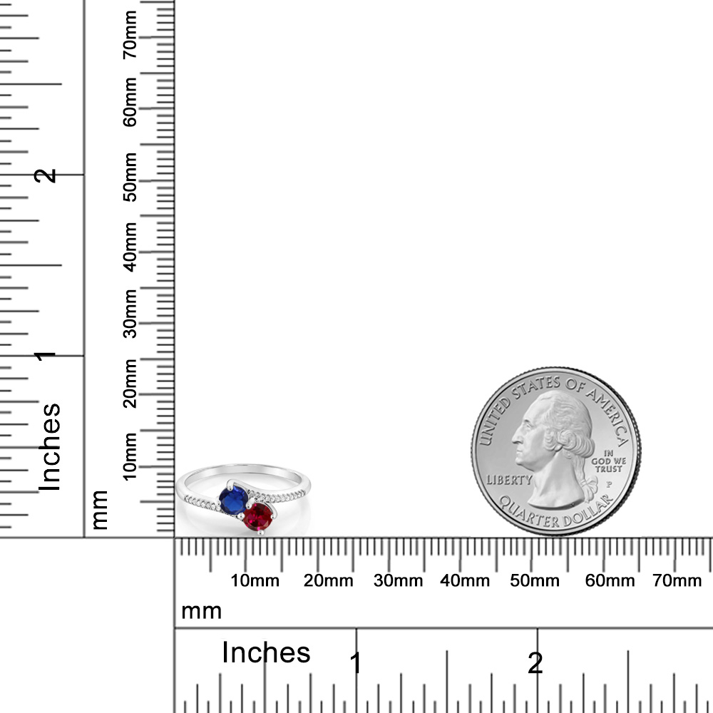MEASUREMENTS: 4x4mm Round Heat-Treated Blue Created Sapphire, 4x4mm Round Heat-Treated Red Created Ruby1, x, 1, mm Round White Diamond. Total Carat Weight is 0.67 cttw