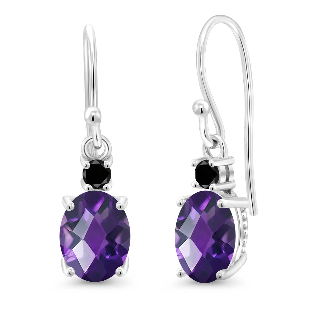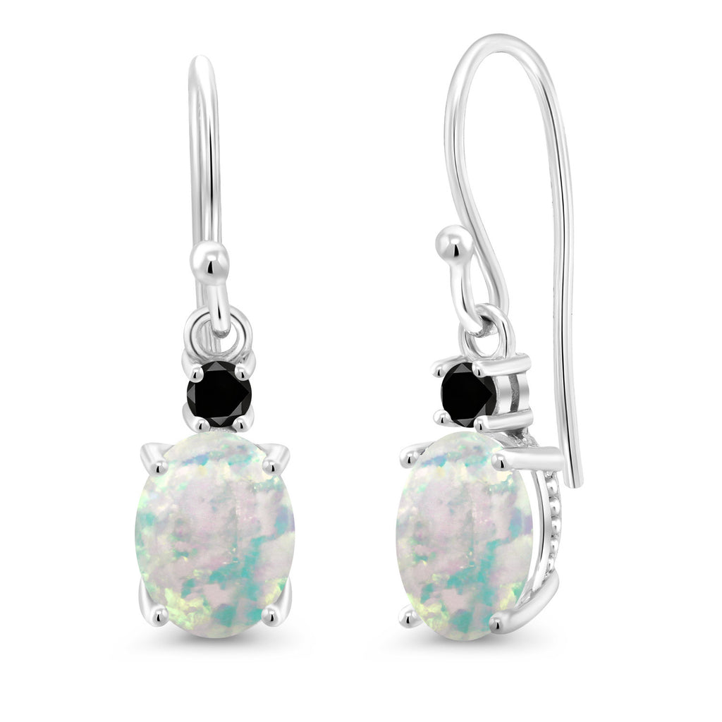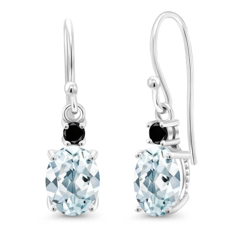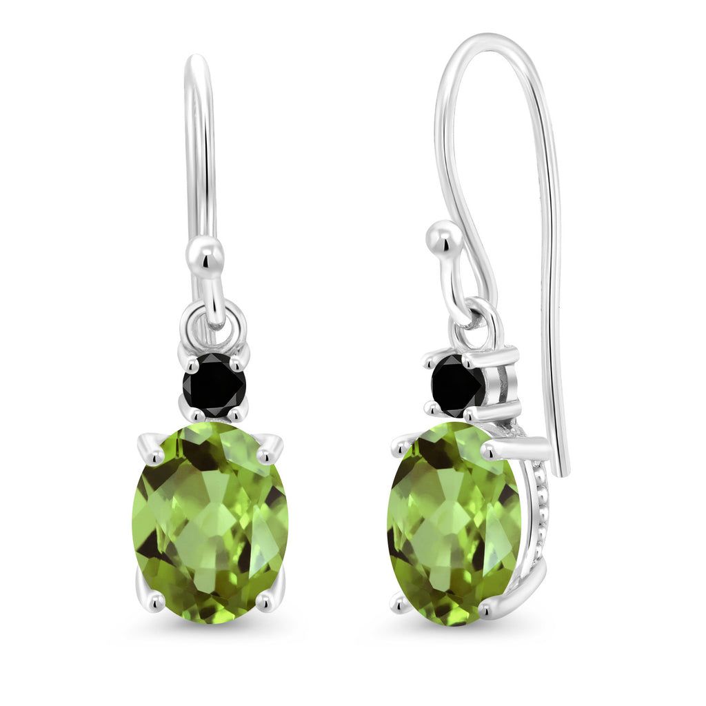 10K White Gold Gemstone Birthstone and Black Diamond Dangle Earrings For Women | Oval 8X6MM and Round 2.5MM | Elegant Drop Design with Classic French Wire Hooks | Fine Jewelry Earrings
