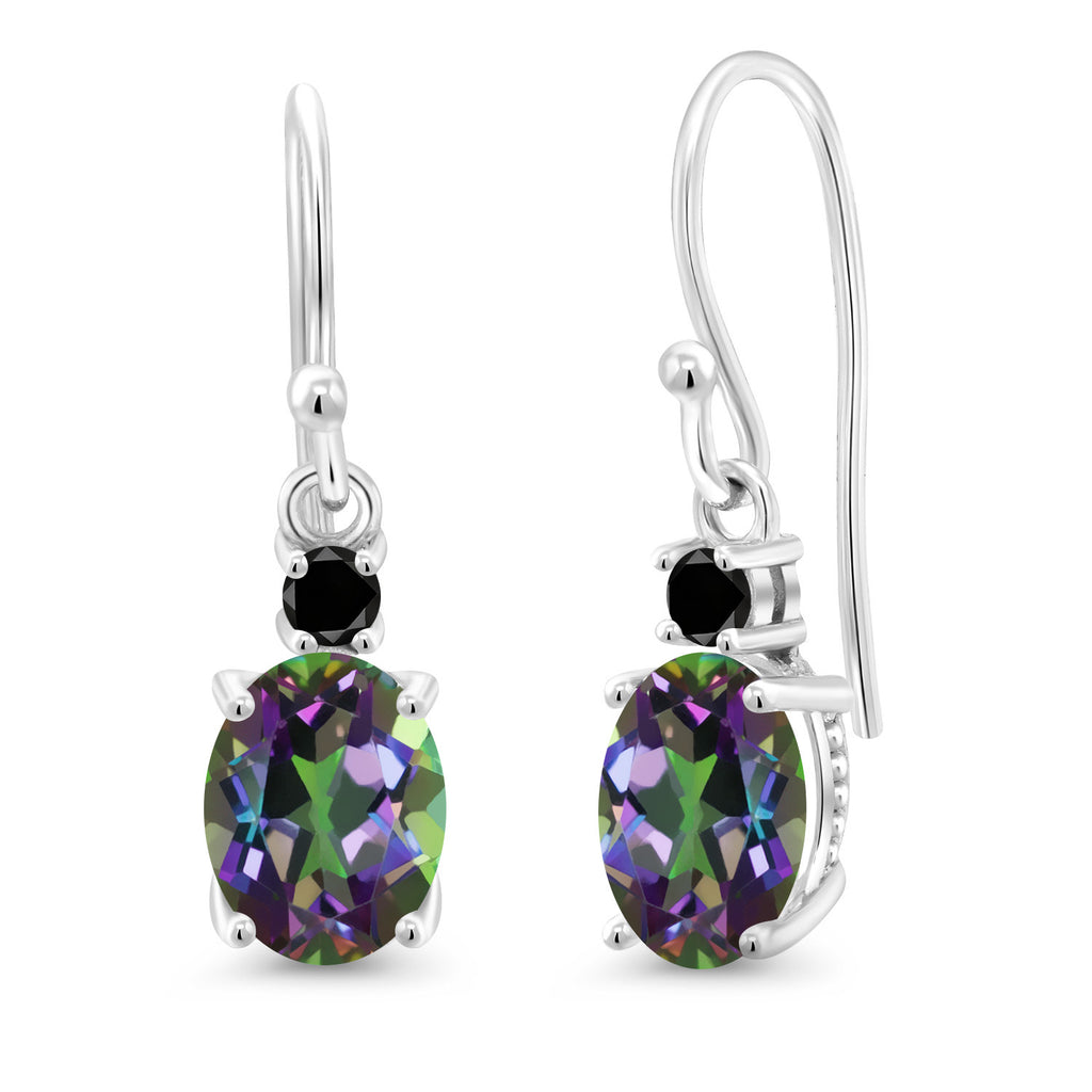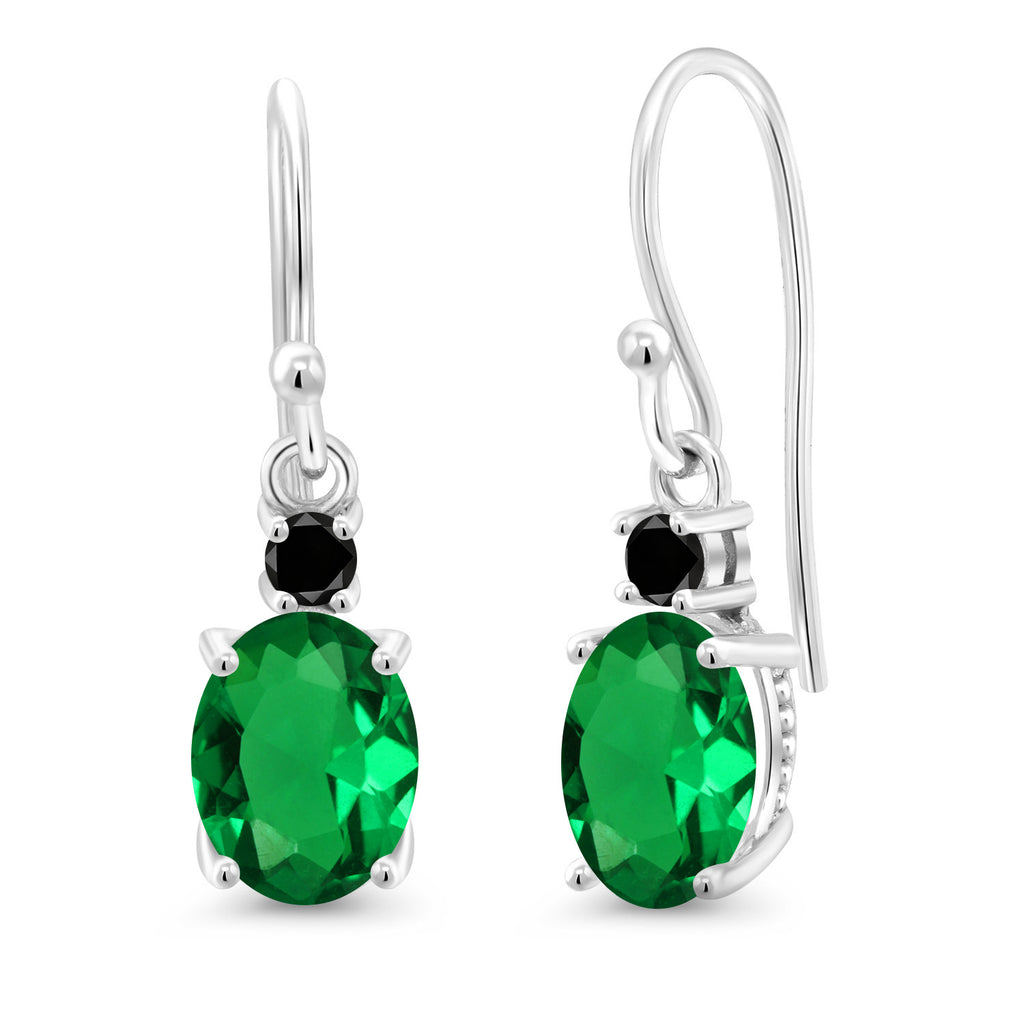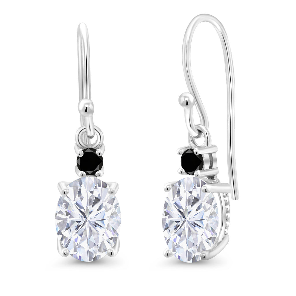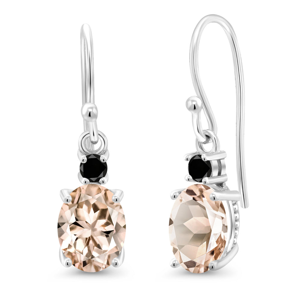 10K White Gold Gemstone Birthstone and Black Diamond Dangle Earrings For Women | Oval 8X6MM and Round 2.5MM | Elegant Drop Design with Classic French Wire Hooks | Fine Jewelry Earrings