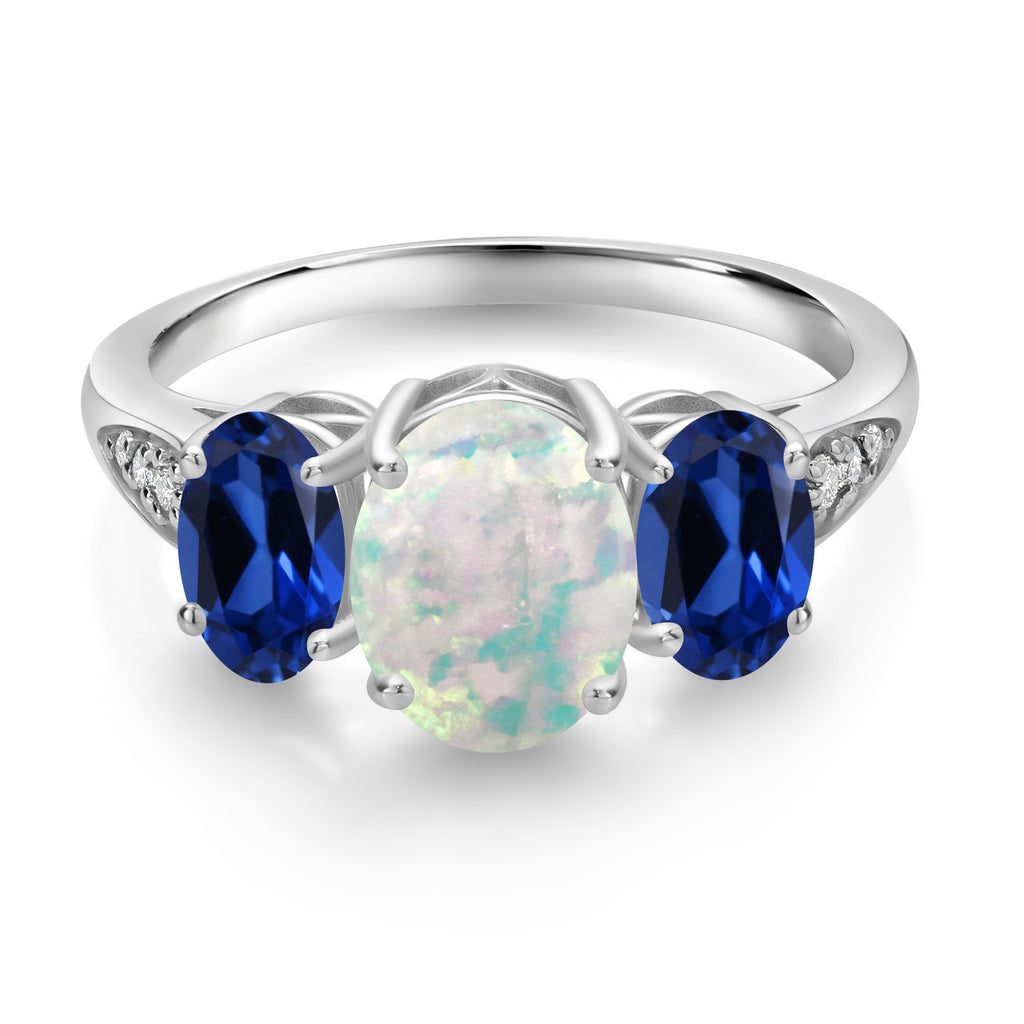 10K White Gold Gemstone Birthstone and Blue Created Sapphire 3-Stone Engagement Ring for Women with Lab Grown Diamond Accents | Oval 8X6MM & 6X4MM | Three Stone Wedding Anniversary Promise Ring