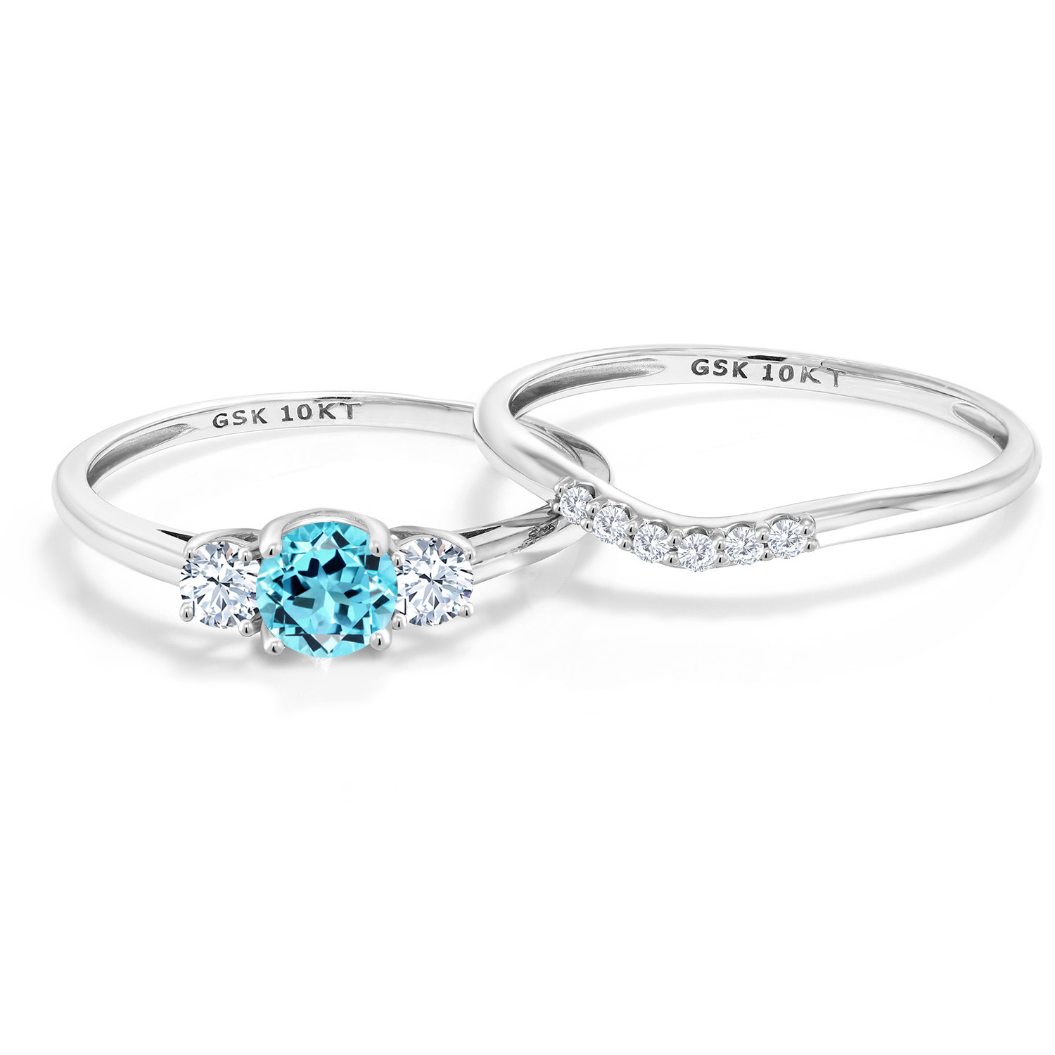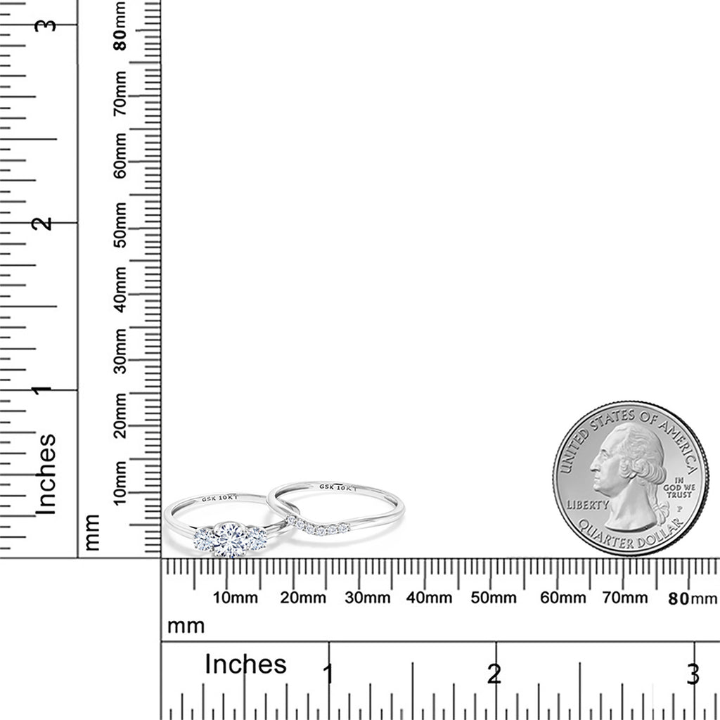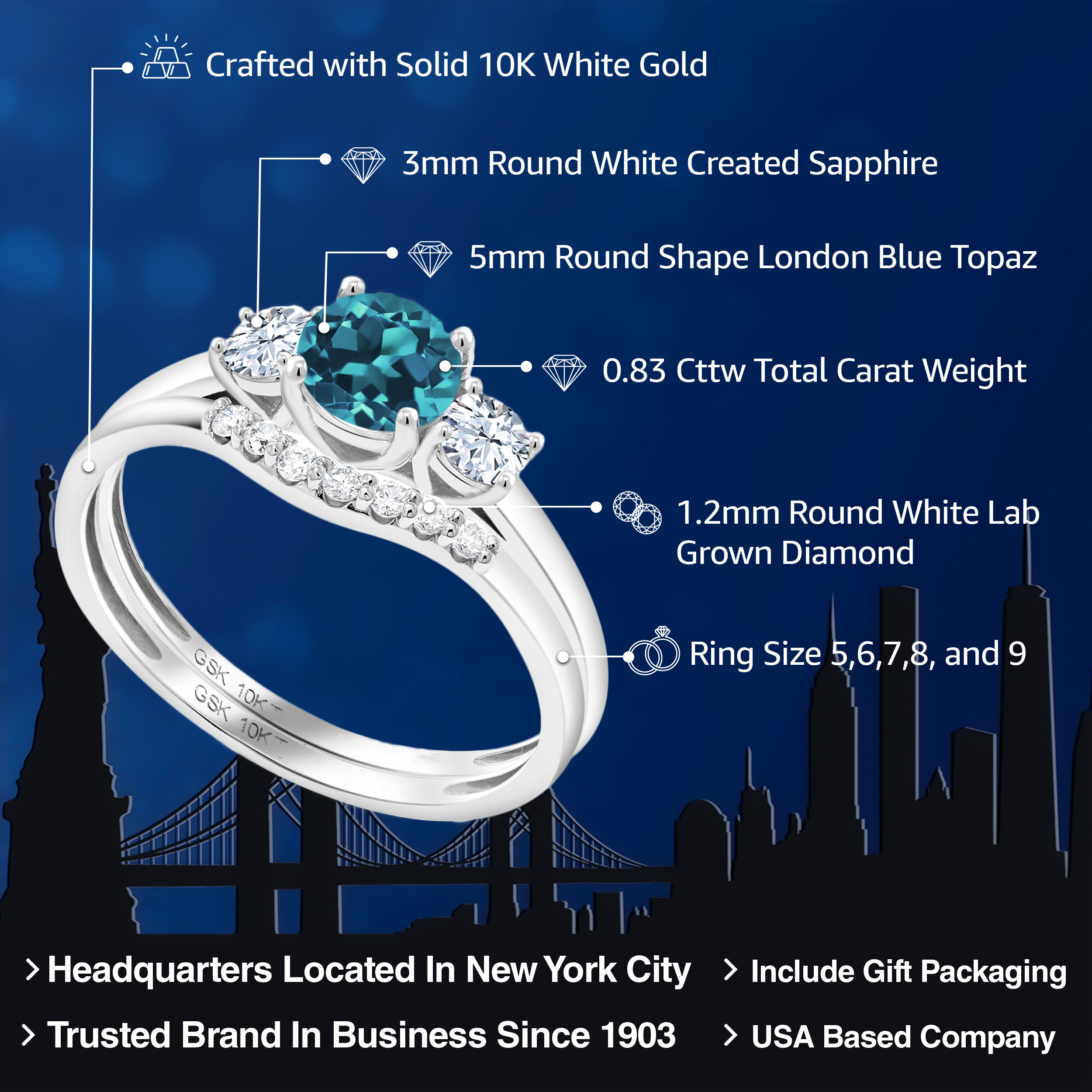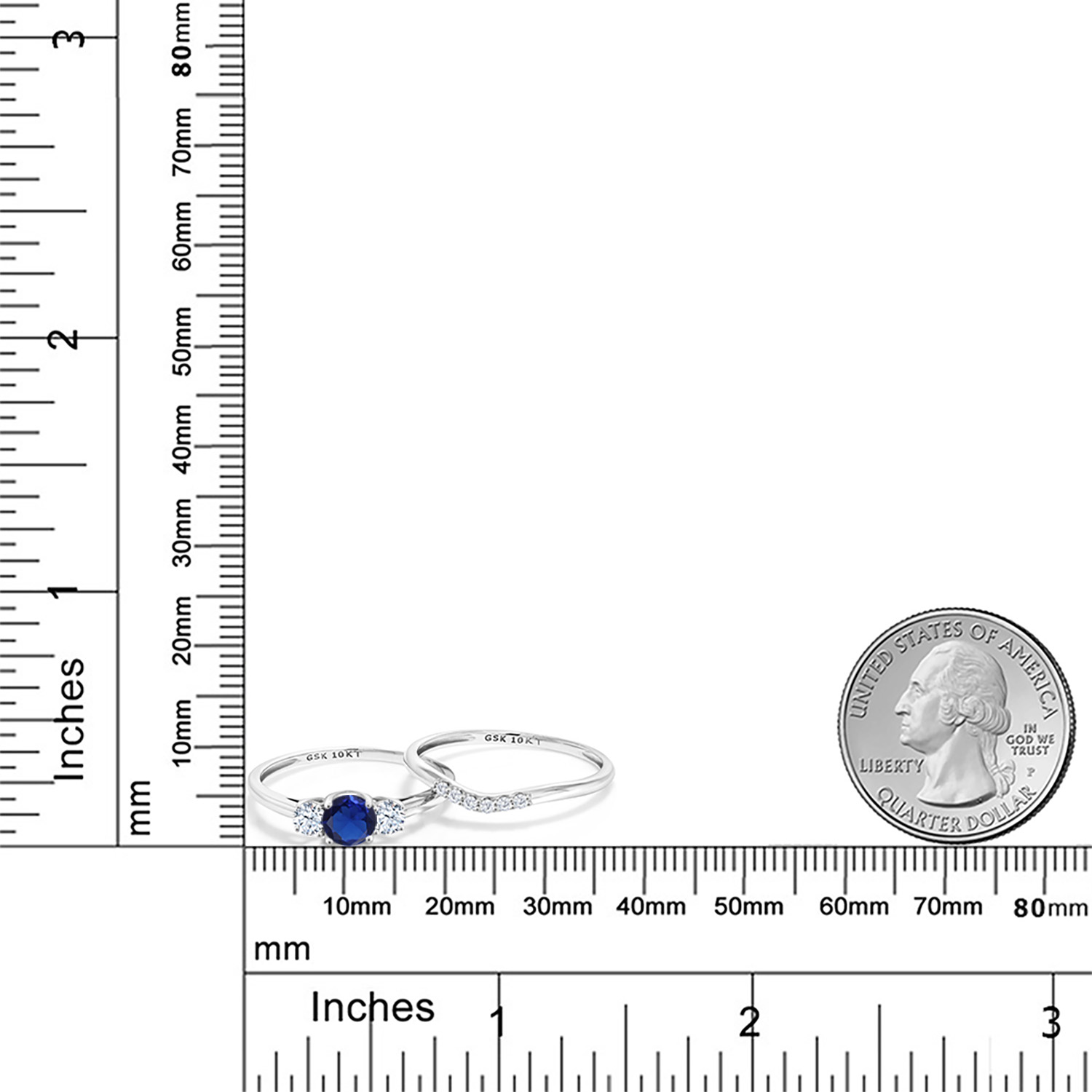 3-Stone Bridal Engagement Wedding Ring Set For Women | 10K White Gold Gemstone Birthstone White Created Sapphire and Lab Grown Diamond | Round 5MM and 3MM | Available in Size 5,6,7,8,9
