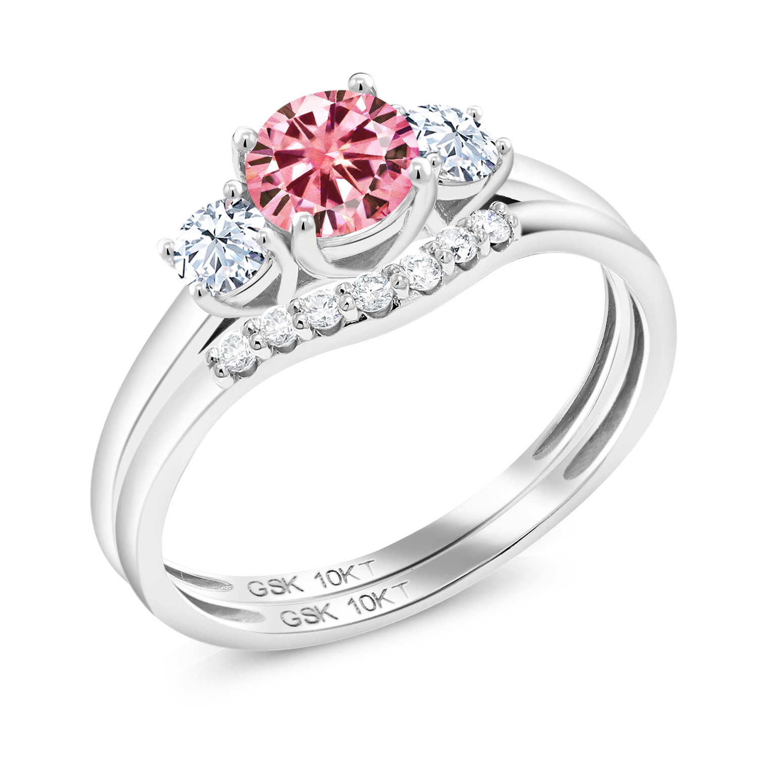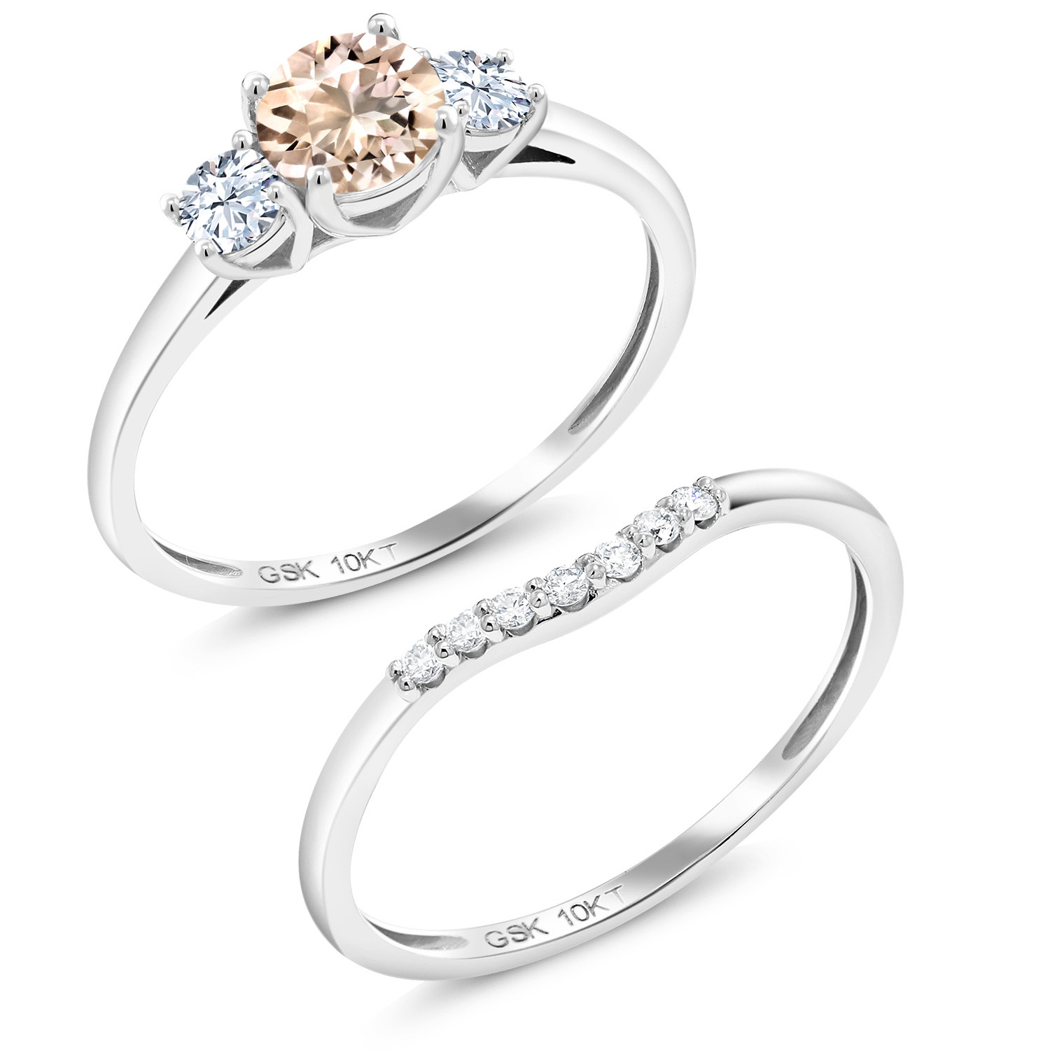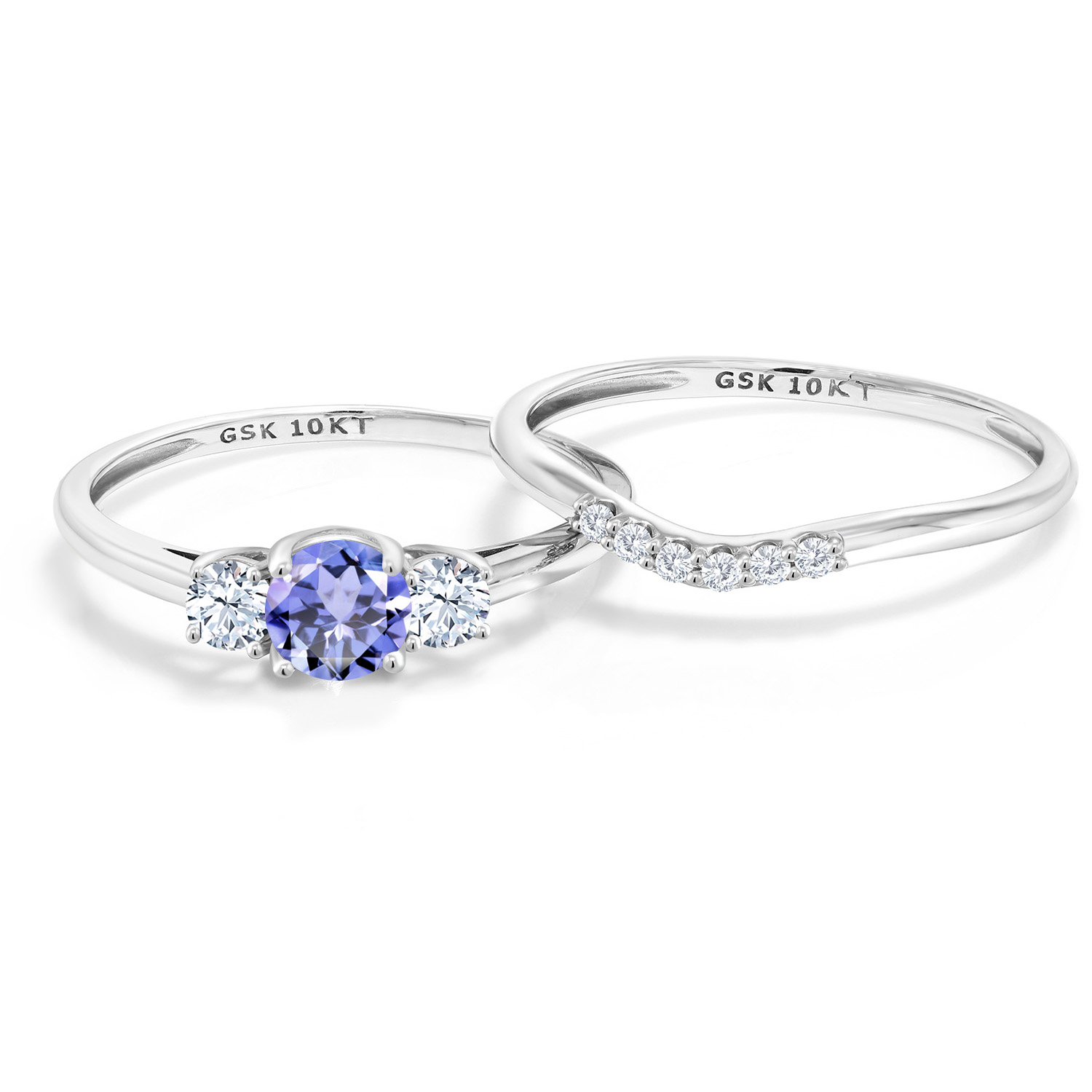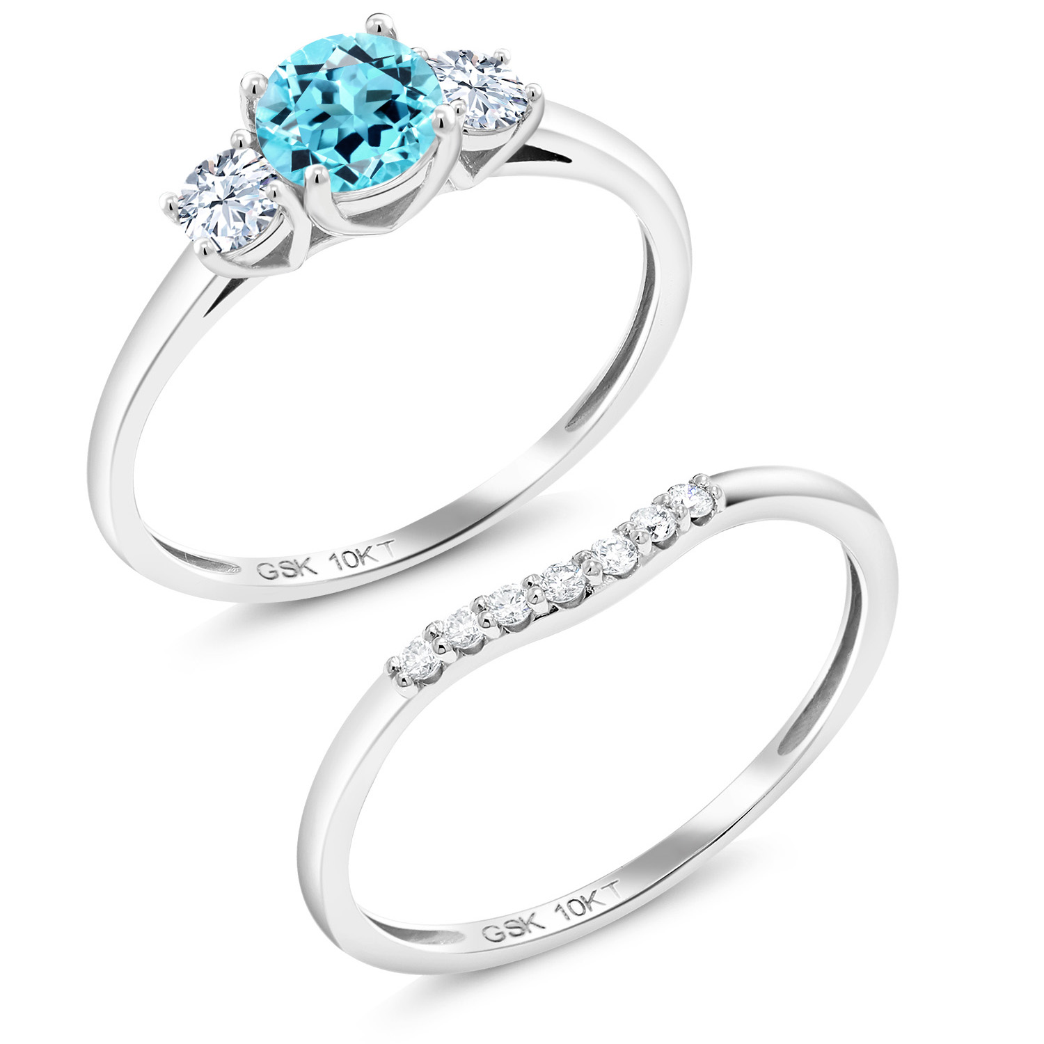 3-Stone Bridal Engagement Wedding Ring Set For Women | 10K White Gold Gemstone Birthstone White Created Sapphire and Lab Grown Diamond | Round 5MM and 3MM | Available in Size 5,6,7,8,9