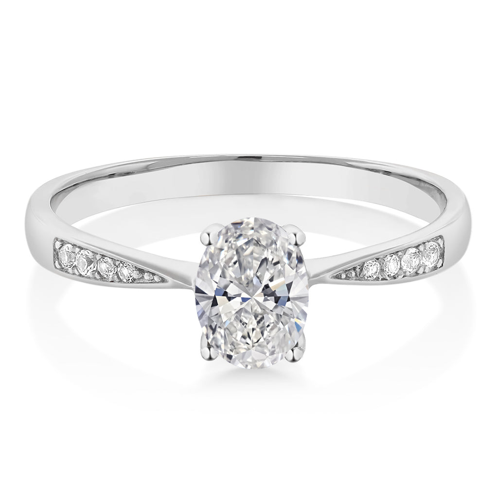 WHITE DIAMOND SIDE ACCENTS: Six sparkling white round diamonds are elegantly embedded along the tapered shoulders, accenting the center gemstone with just the right amount of shimmer. These natural diamonds are securely prong-set for enduring brilliance. The subtle graduation of the stones toward the center adds balance and a touch of sophistication, enhancing the engagement ring's overall silhouette.
