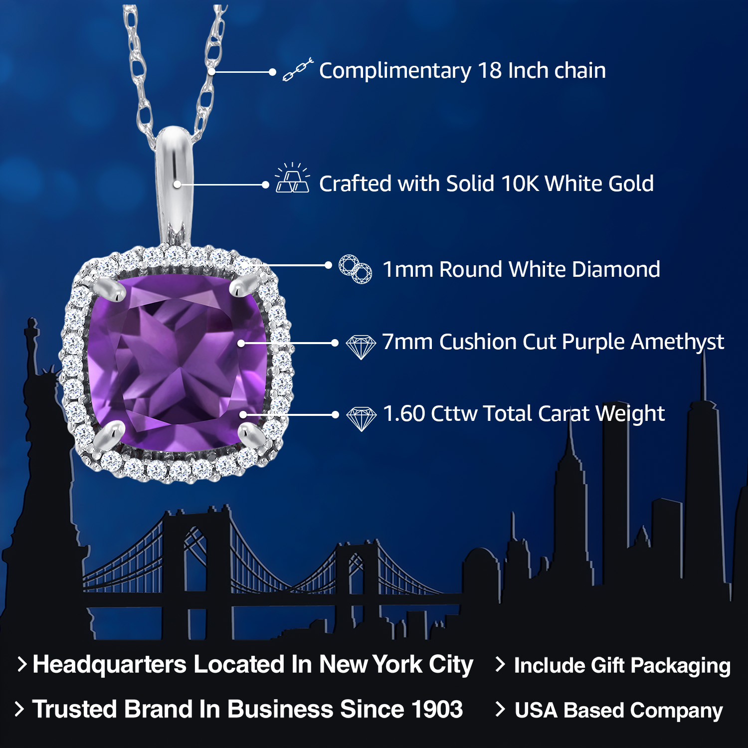 EXQUISITE GEMSTONE HALO DESIGN: This stunning pendant necklace features a captivating cushion-cut 7mm gemstone of your choice surrounded by a halo of shimmering white diamonds, creating a breathtaking display of elegance and sophistication.