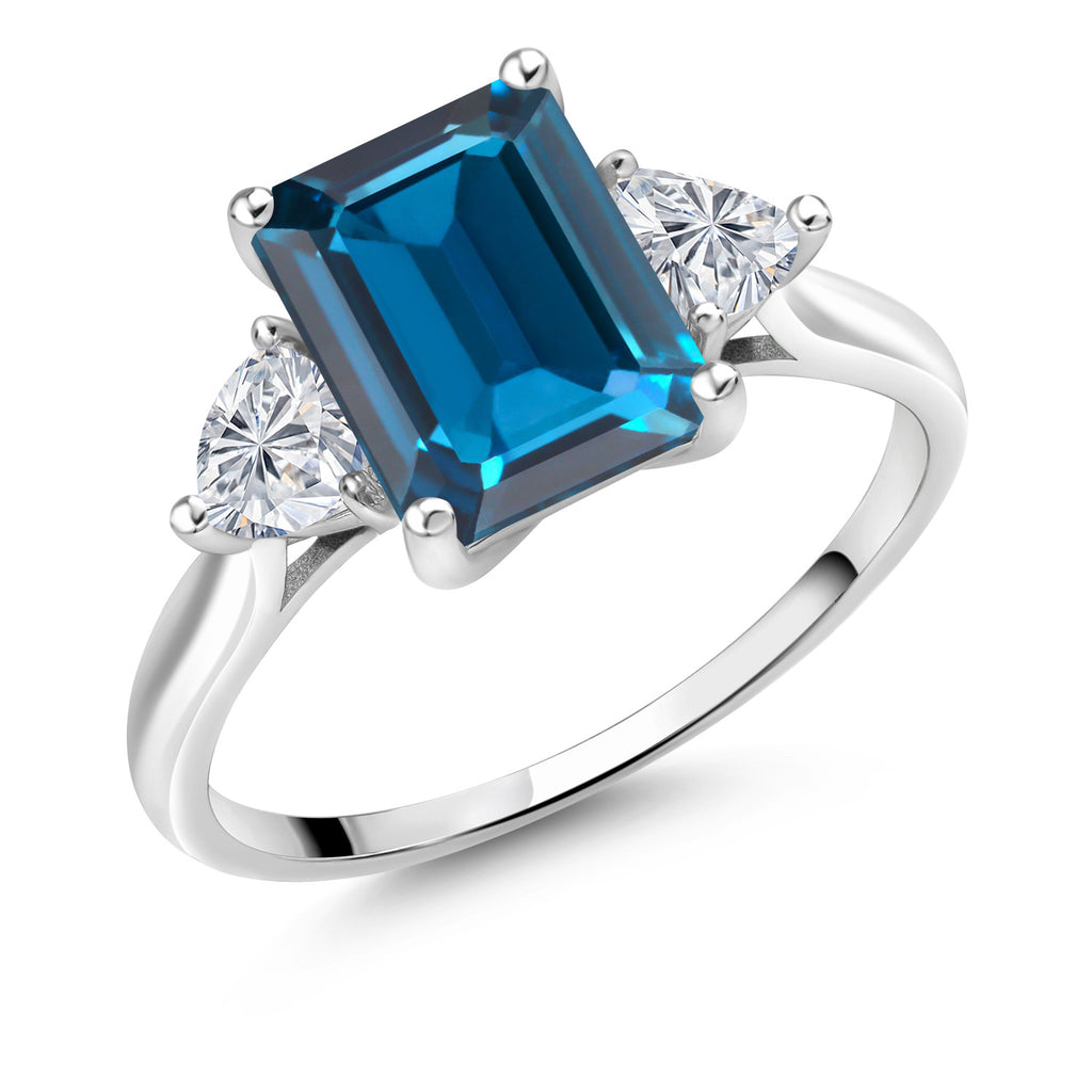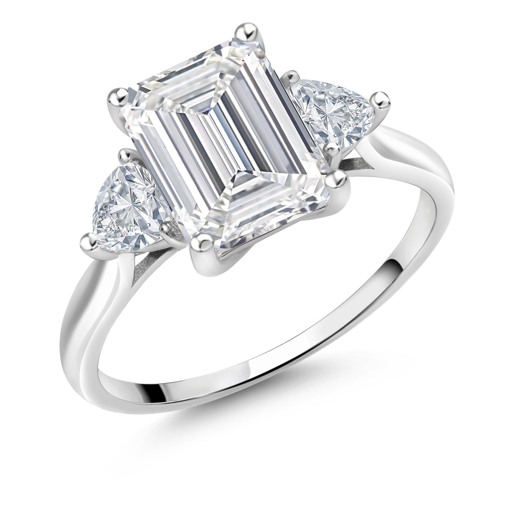10K White Gold Gemstone Birthstone and White Moissanite 3-Stone Engagement Ring for Women | Emerald Cut 9X7MM and Trillion 4MM | Fine Jewelry for Wedding Anniversary Promise | Sizes 5, 6, 7, 8, 9
