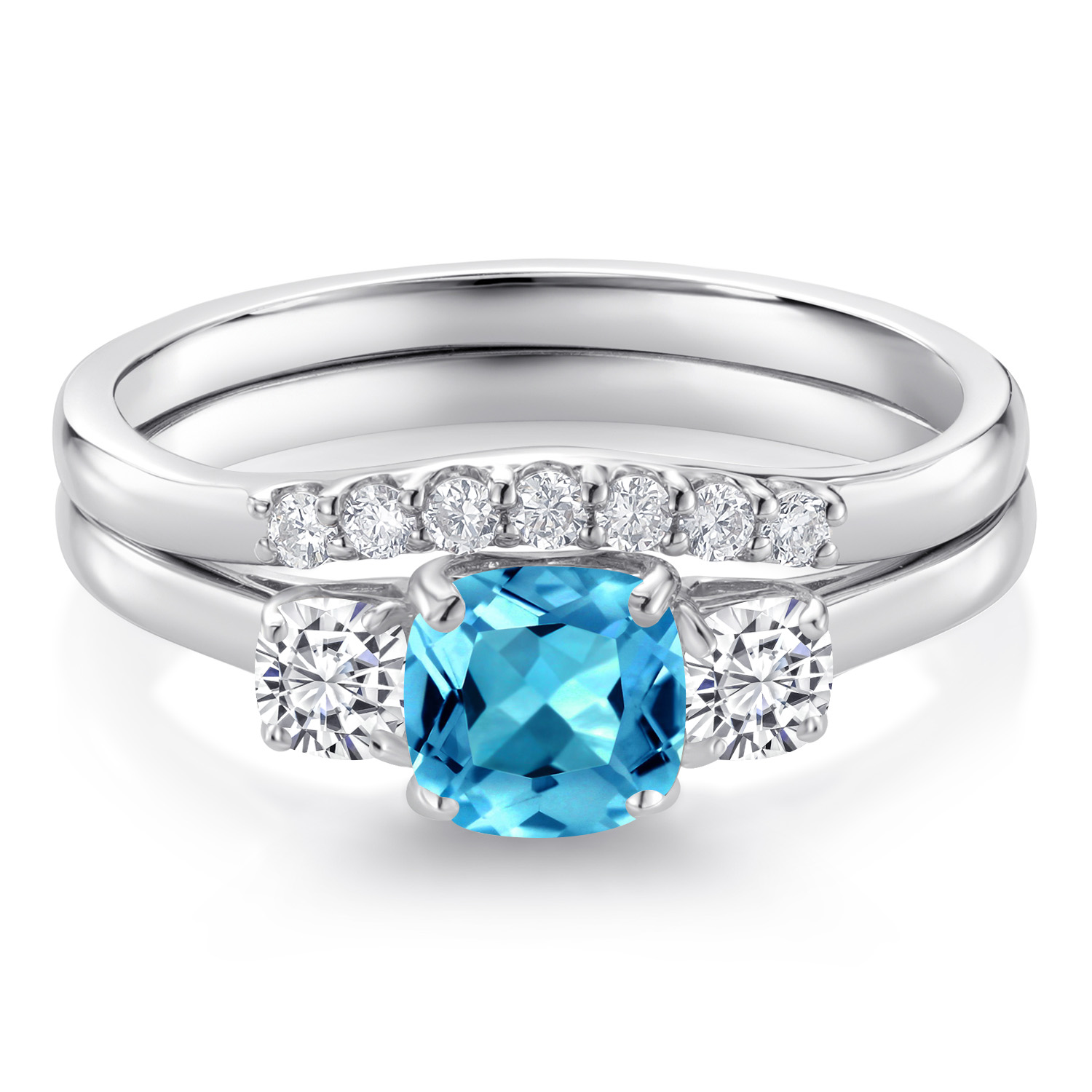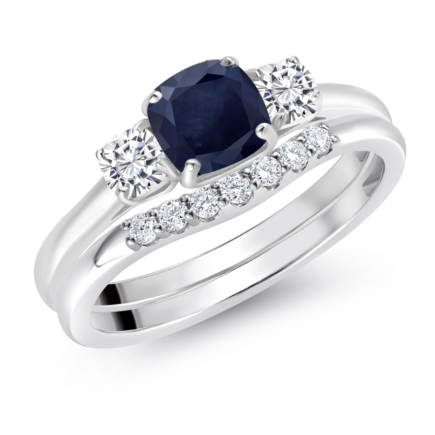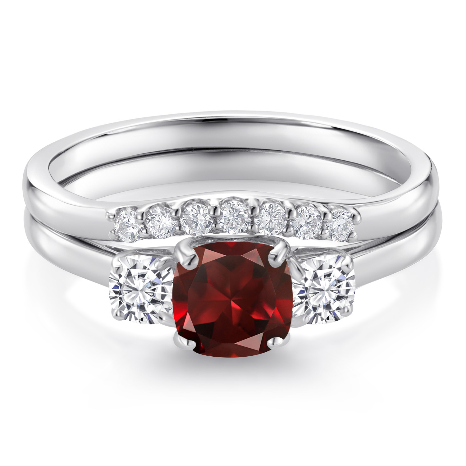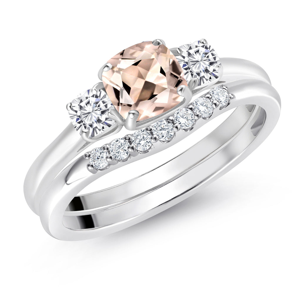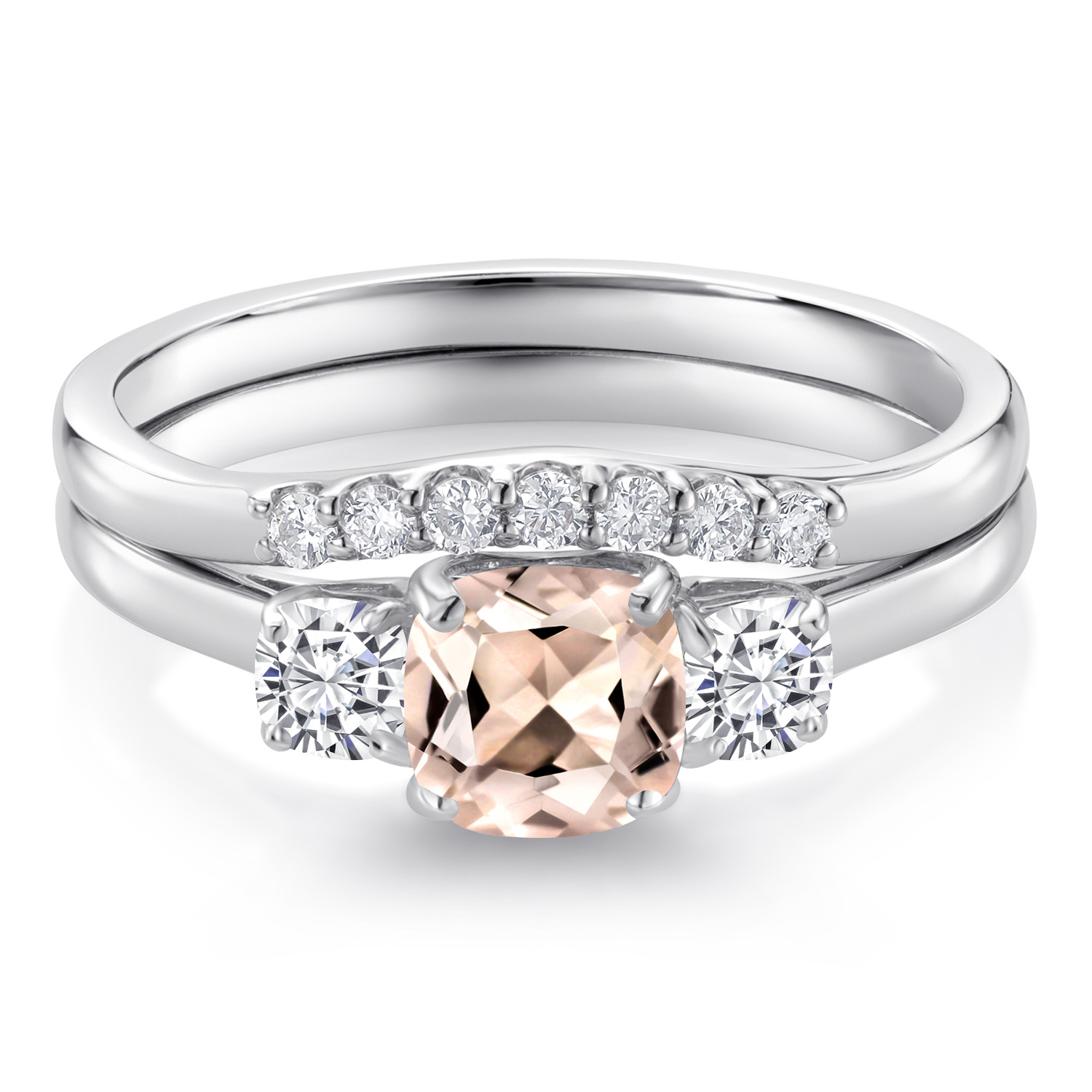 10K White Gold Gemstone Birthstone White Moissanite and Lab Grown Diamond 3 Stone Bridal Engagement Wedding Ring Set For Women | 5MM and 3MM Cushion Cut | Available In Size 5-9