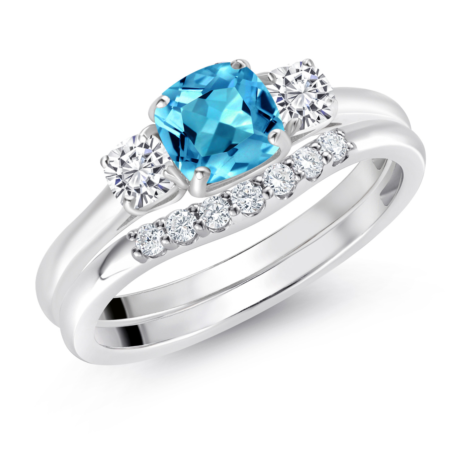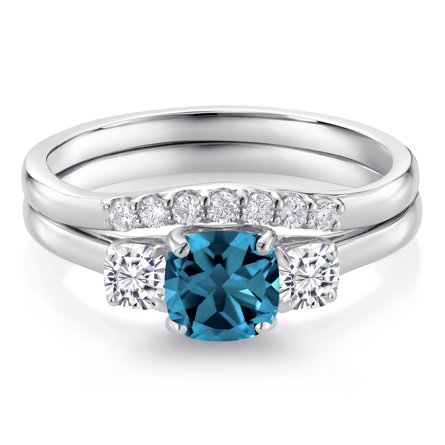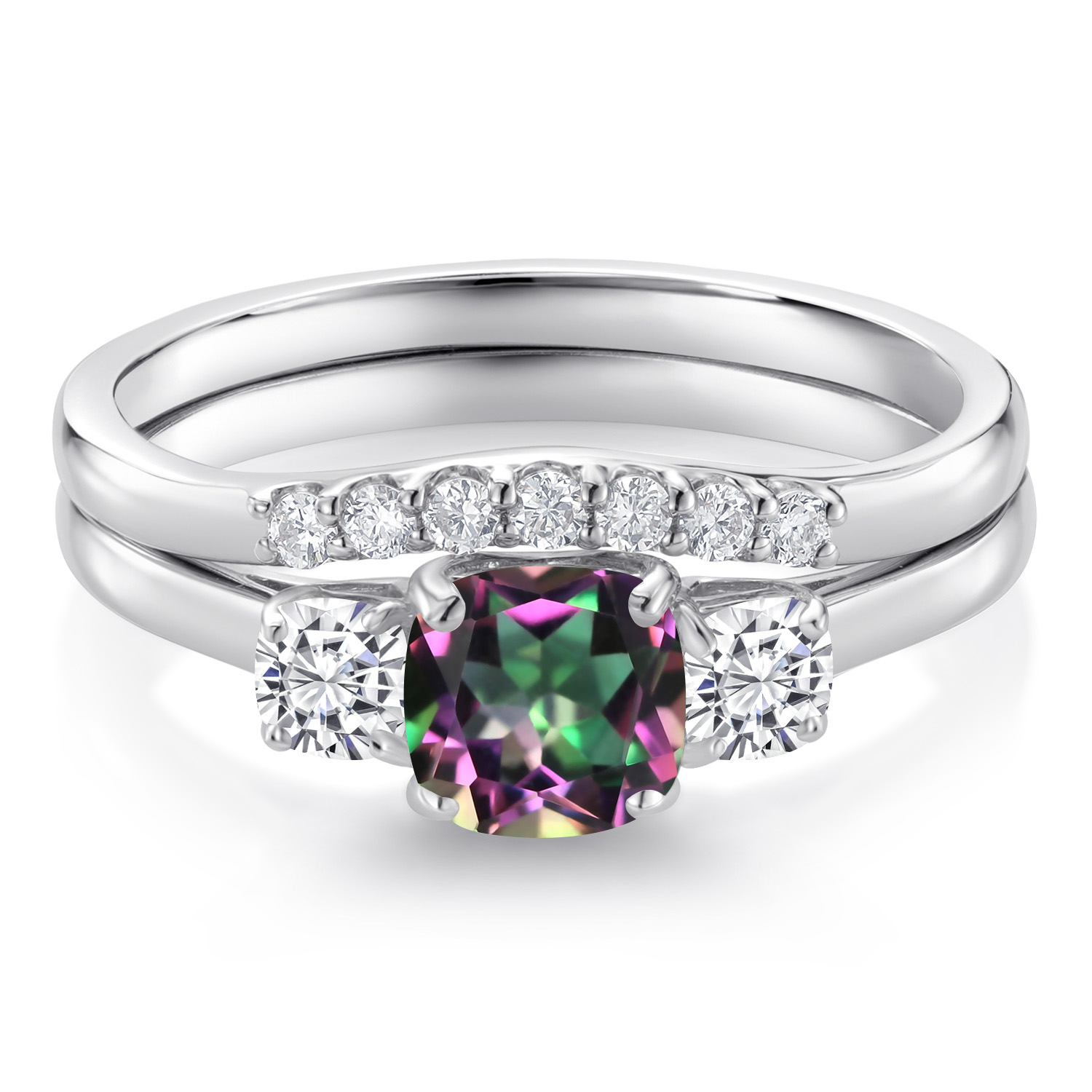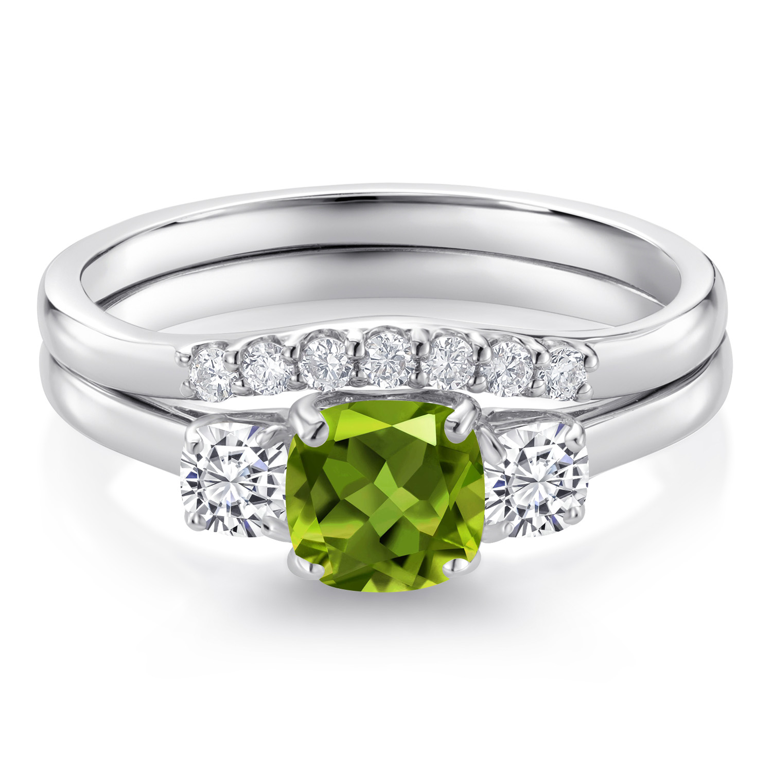 10K White Gold Gemstone Birthstone White Moissanite and Lab Grown Diamond 3 Stone Bridal Engagement Wedding Ring Set For Women | 5MM and 3MM Cushion Cut | Available In Size 5-9