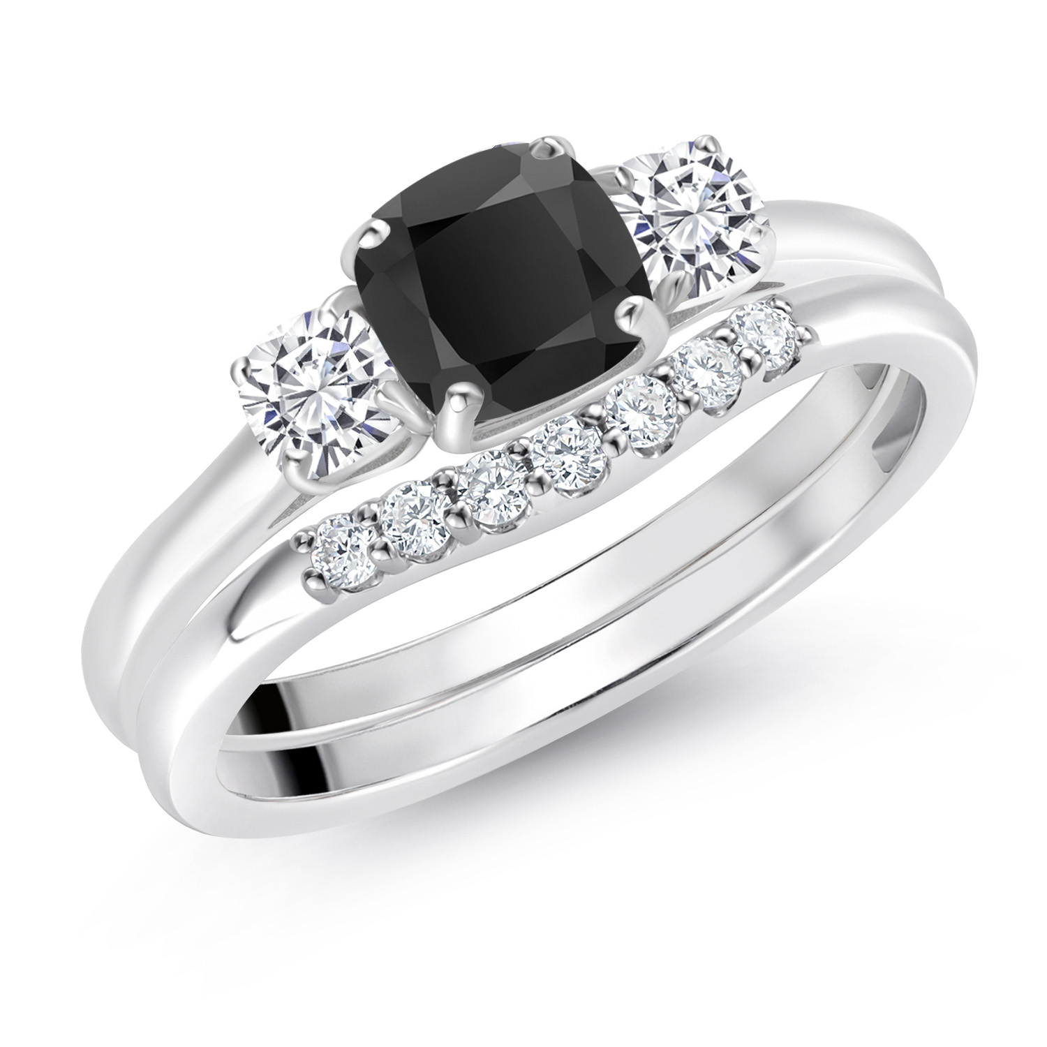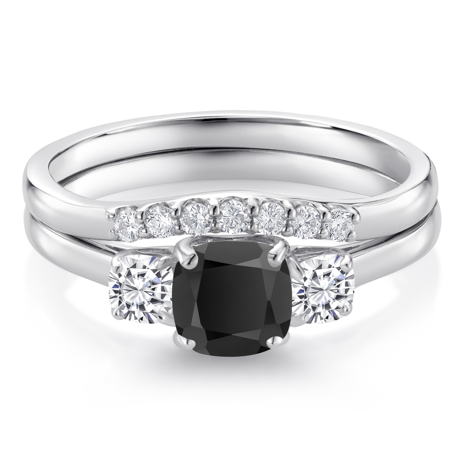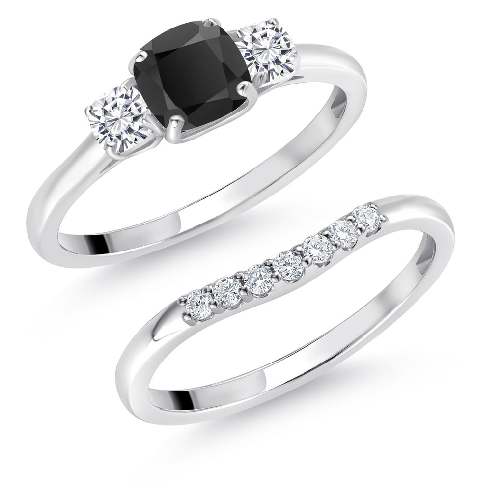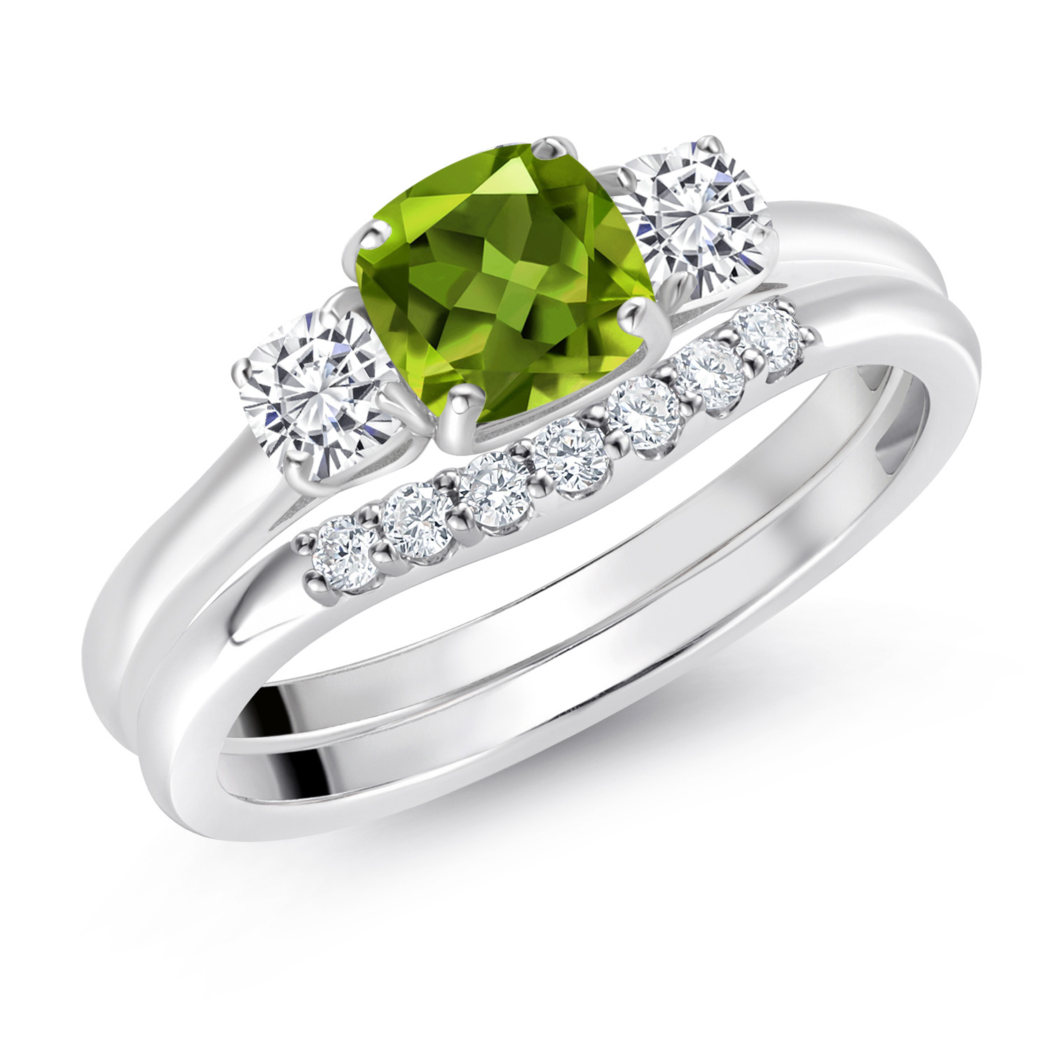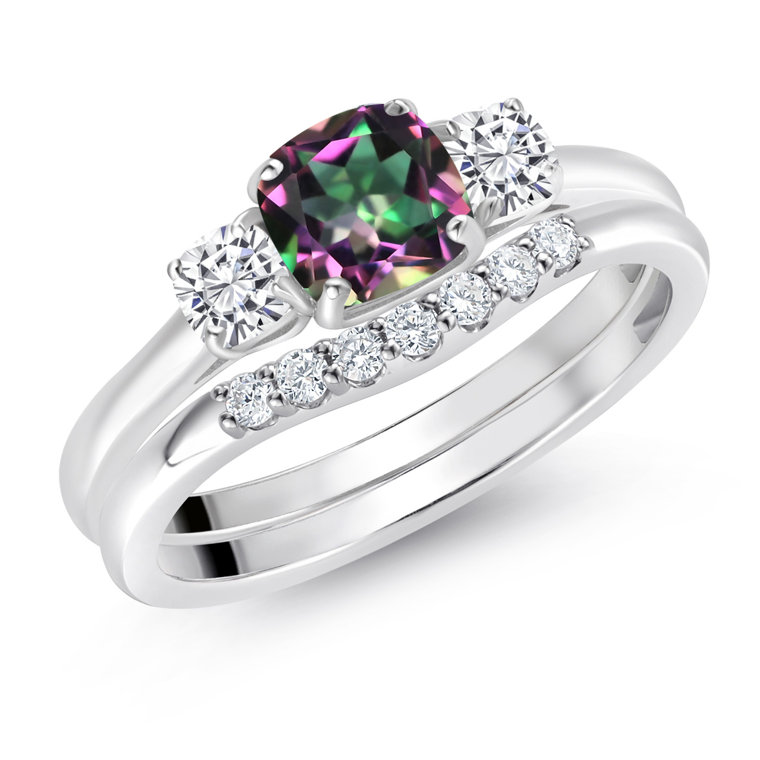 10K White Gold Gemstone Birthstone White Moissanite and Lab Grown Diamond 3 Stone Bridal Engagement Wedding Ring Set For Women | 5MM and 3MM Cushion Cut | Available In Size 5-9
