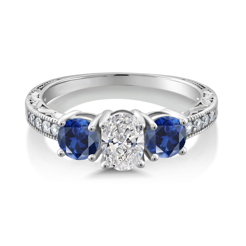 10K White Gold IGI Certified Lab Grown Diamond and Blue Created Sapphire 3 Stone Engagement Ring For Women | 2.28 Cttw | Center Diamond Oval 1 Ct | E-F Color | VS1-VS2 Clarity