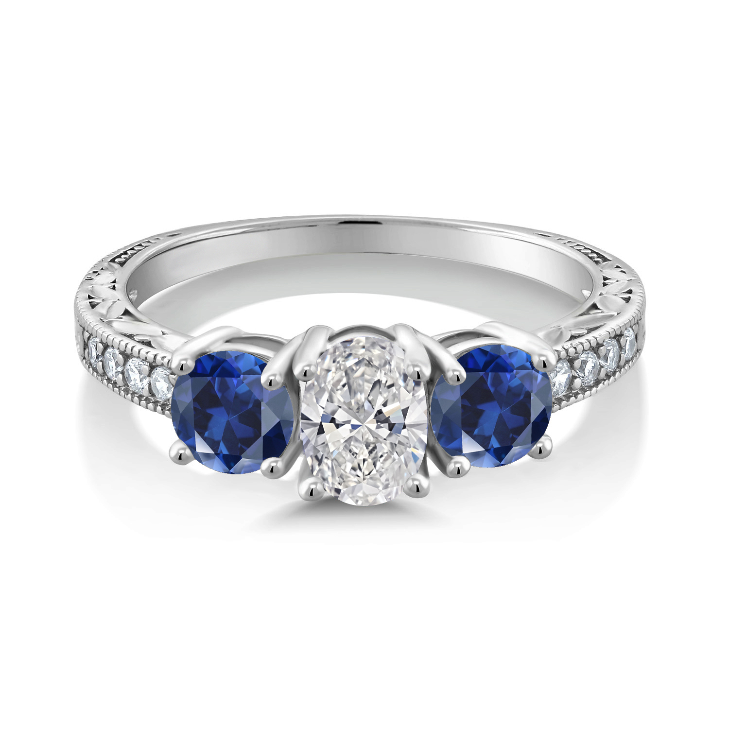 EXQUISITE CRAFTSMANSHIP AND DESIGN: This stunning 3-stone engagement ring features a total of 2.28 Cttw, with a 1 Ct oval center diamond flanked by two vibrant blue created sapphires. Set in luxurious 10K White Gold, this ring showcases a perfect blend of classic elegance and modern sophistication.