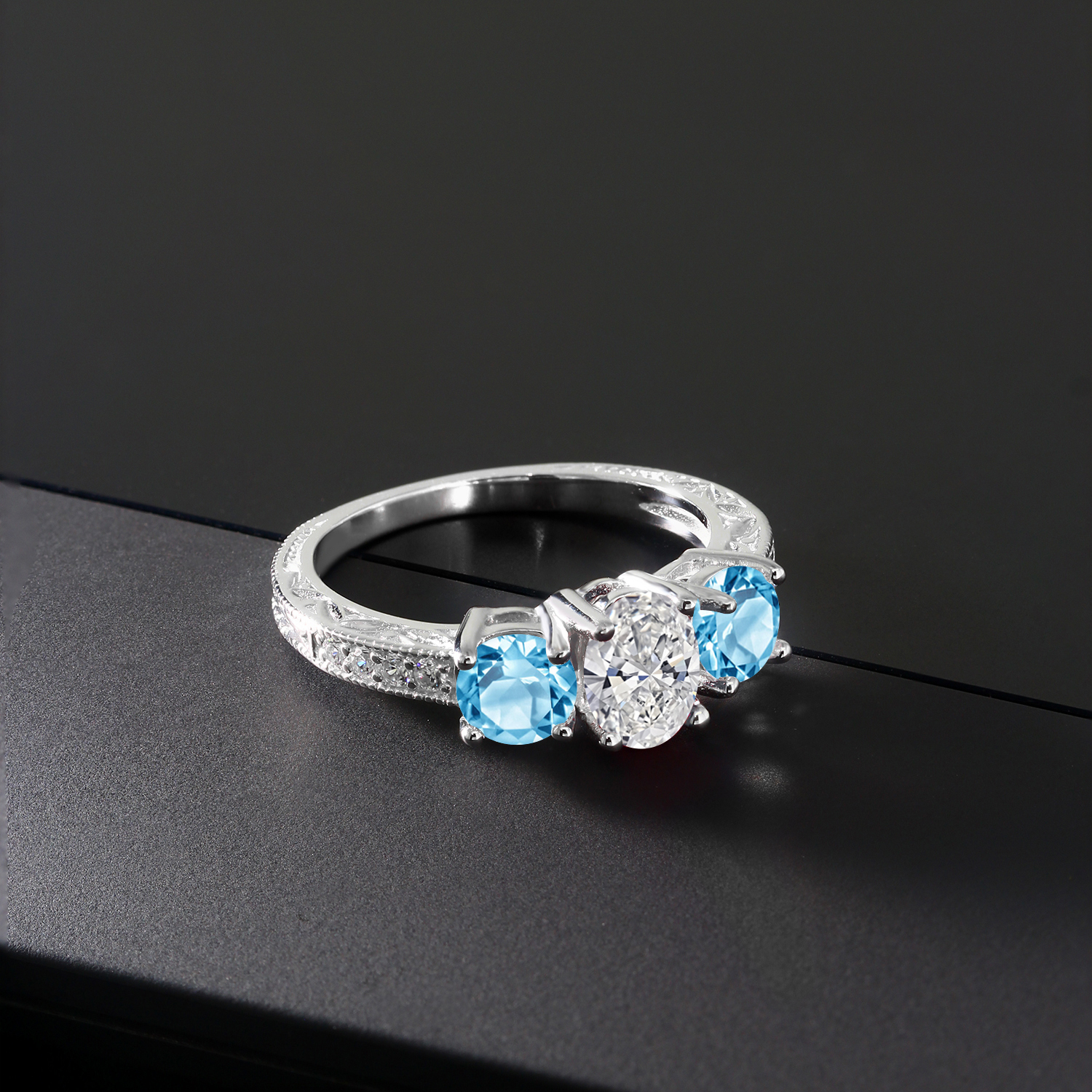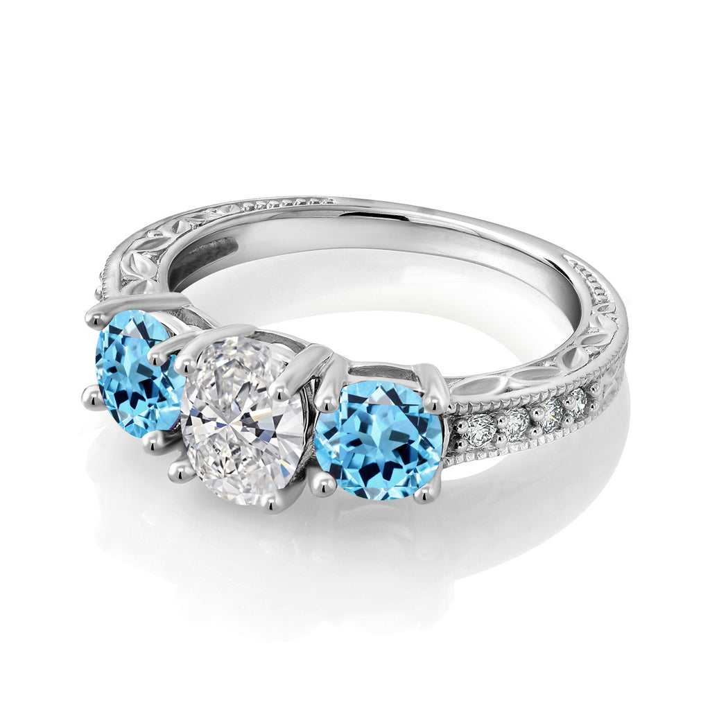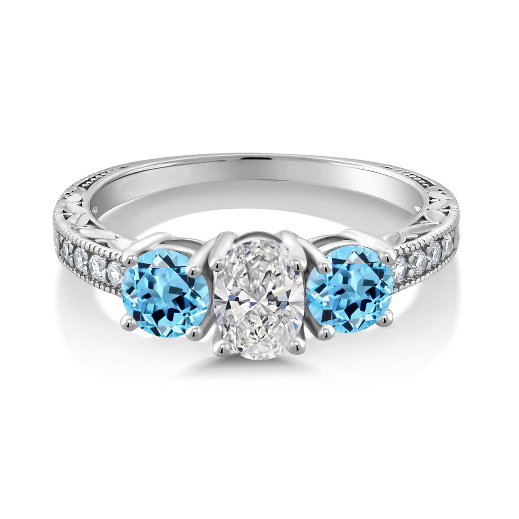 MEASUREMENTS: 8x6mm Oval E - F Lab Grown Diamond, 5x5mm Round Irradiated Swiss Blue Topaz1.5, x, 1.5, mm Round E - F Lab Grown Diamond. Total Carat Weight is 2.38 cttw