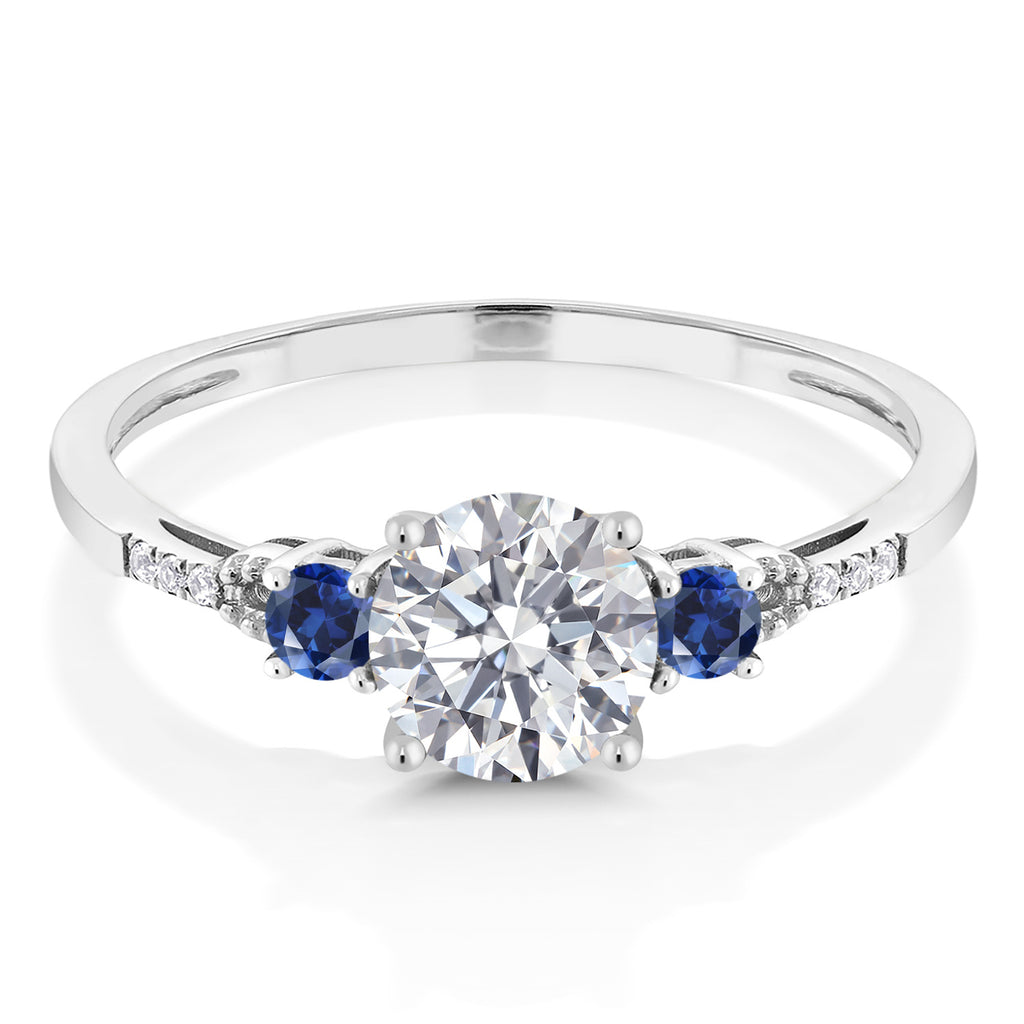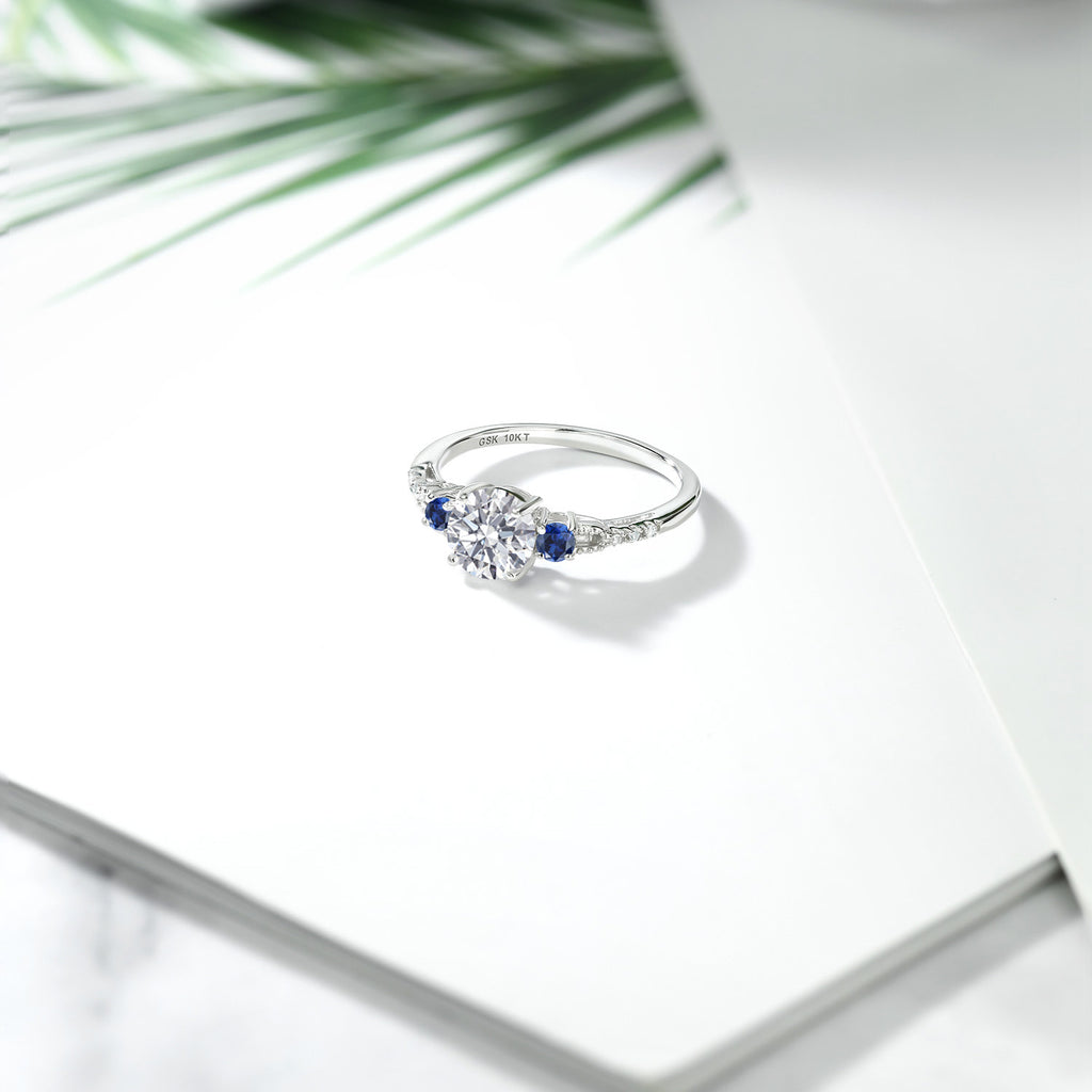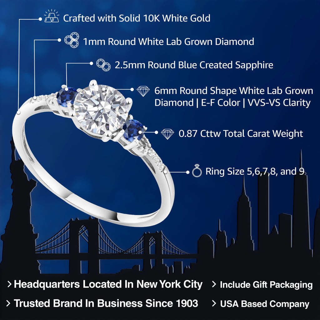 10K White Gold Lab Grown Diamond and Blue Created Sapphire Engagement Ring For Women | 0.87 Cttw | Round 6MM | Gemstone Birthstone | Wedding Engagement Anniversary Promise Ring