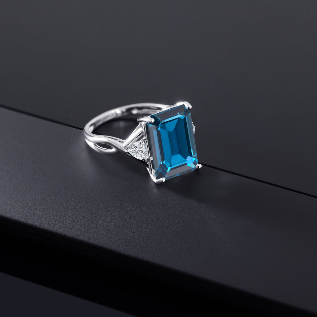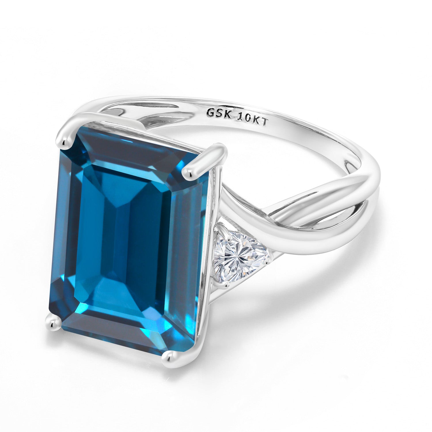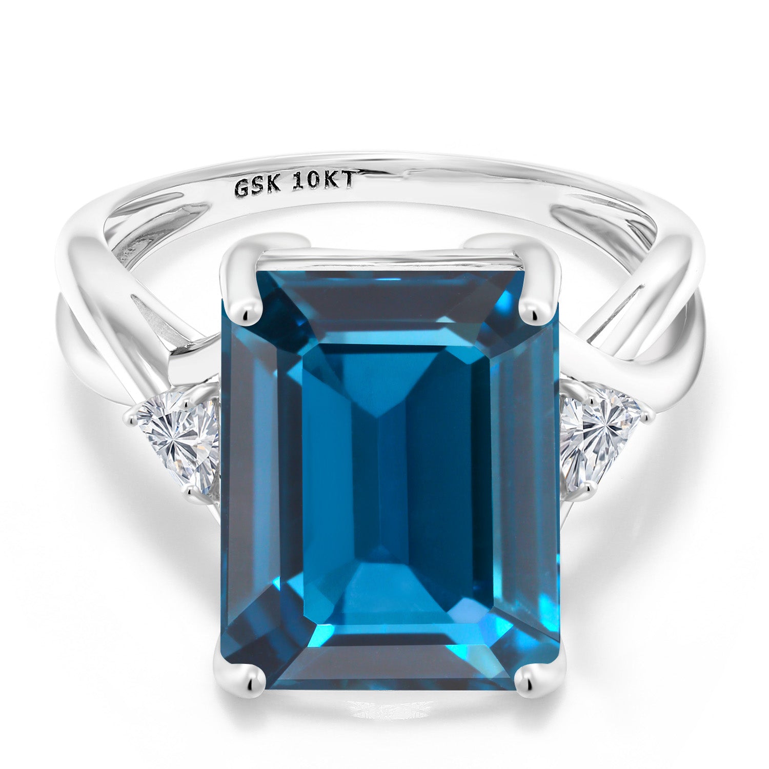 STUNNING CRAFTSMANSHIP AND CAPTIVATING DESIGN: This breathtaking engagement ring showcases a 14X10MM emerald-cut London blue topaz, accented by 4MM trillion-cut lab grown diamonds, totaling 9.94 Cttw. Set in 10K White Gold, this ring blends timeless elegance with a bold, eye-catching design that radiates sophistication.