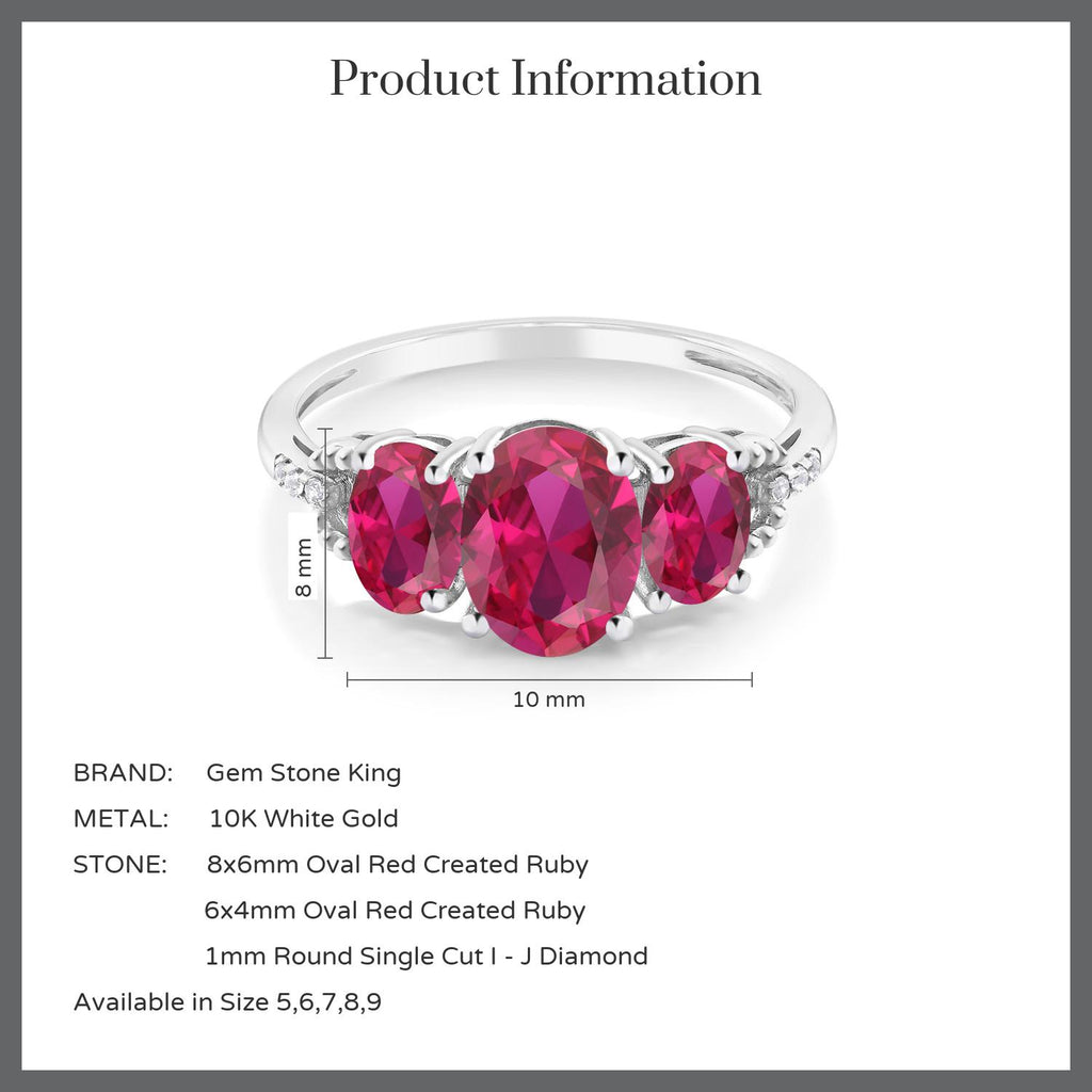 10K White Gold Oval Red Created Ruby and Diamond Accent 3-Stone Engagement Ring For Women | 2.20 Cttw | Wedding Engagement Anniversary Promise Ring For Women