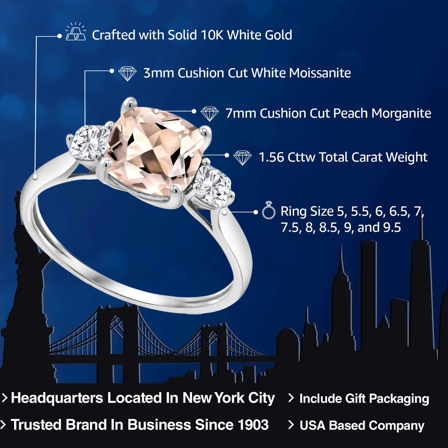 ELEGANT 3 STONE DESIGN: This engagement ring features a sophisticated 3 stone design with a central 7mm cushion-cut peach morganite flanked by moissanite accents. This design symbolizes the past, present, and future of your relationship.