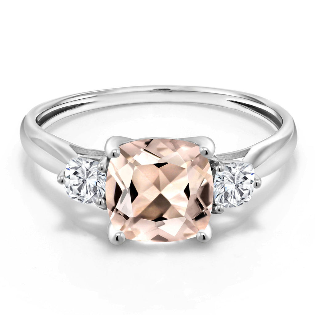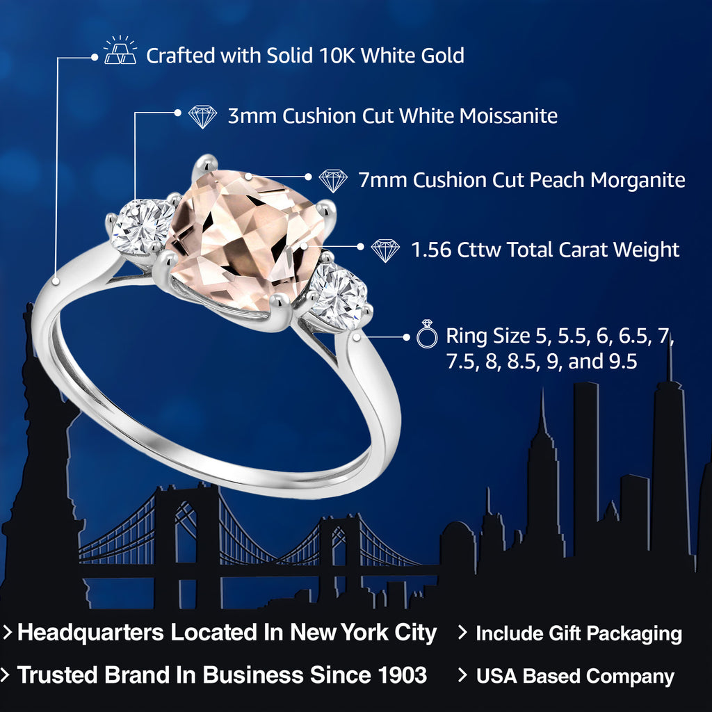 10K White Gold Peach Morganite and Moissanite 3-Stone Engagement Ring For Women | 1.56 Cttw | Cushion 7MM | Gemstone Birthstone | Three Stone Wedding Anniversary Promise Ring