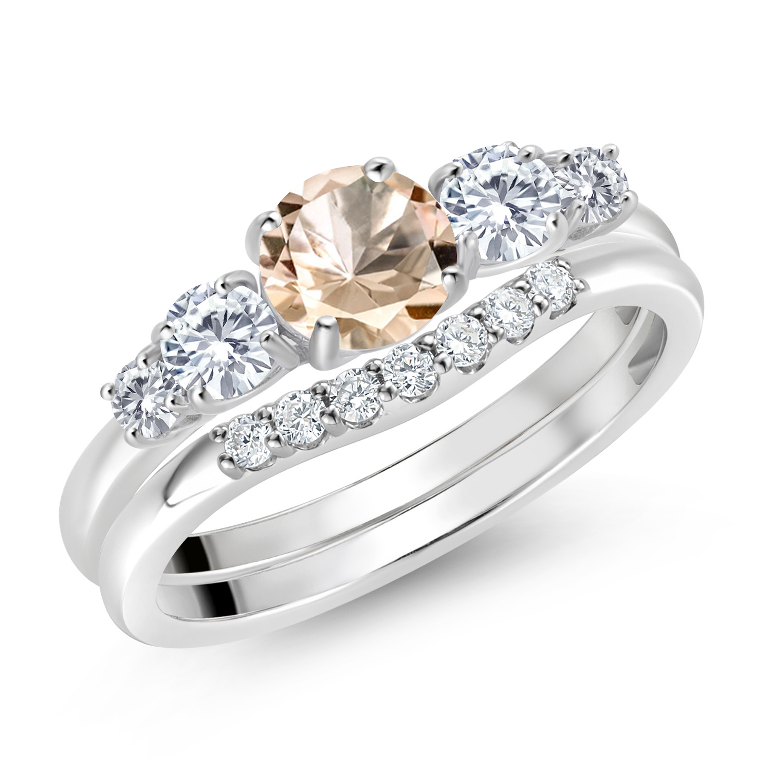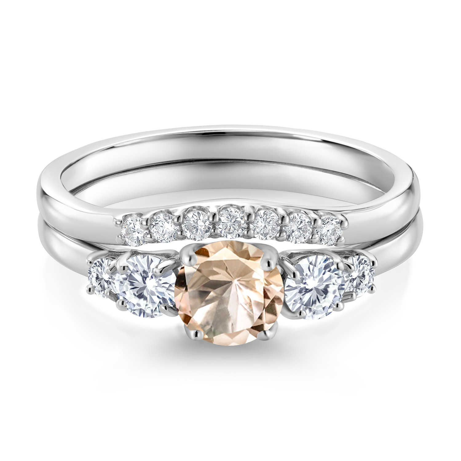 PEACH MORGANITE AND LAB-GROWN DIAMOND GEMSTONES: Featuring a 5MM round peach morganite accented by sparkling 3MM and 1.4MM round DEF Color and VVS-VS Clarity lab-grown diamonds, this 5-stone bridal set totals 0.71 carats. The morganite’s soft blush hue symbolizes love and harmony, while the diamonds add brilliance, creating a refined and meaningful design.