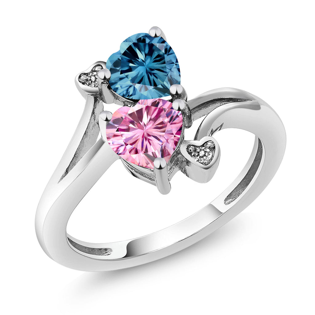 MEASUREMENTS: 6x6mm Heart Shape Coated Persian Blue Moissanite, 6x6mm Heart Shape Coated Pink Moissanite1.5, x, 1.5, mm Round White Diamond. Total Carat Weight is 1.63 cttw