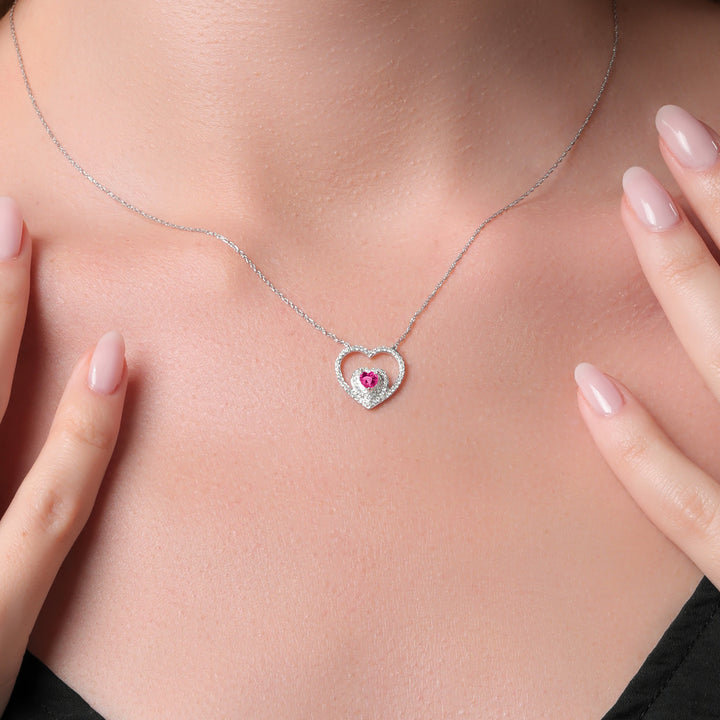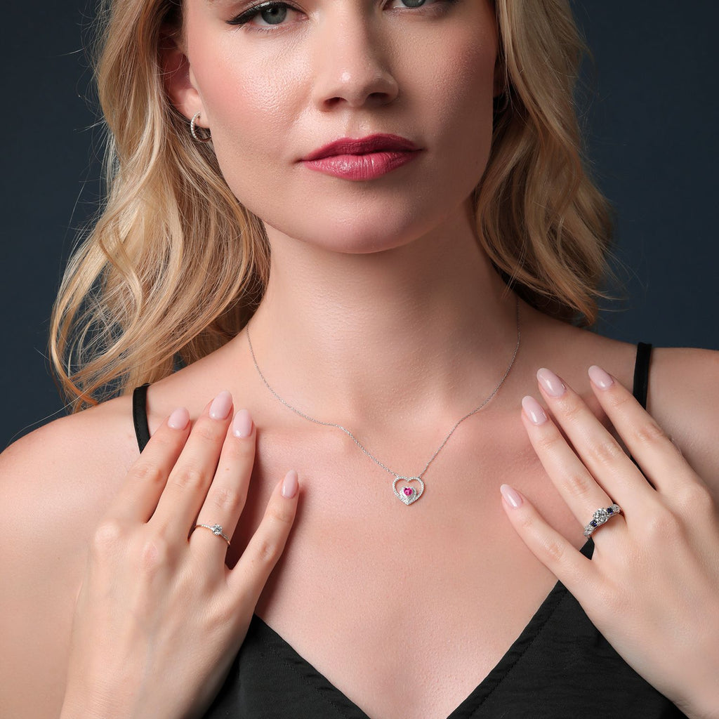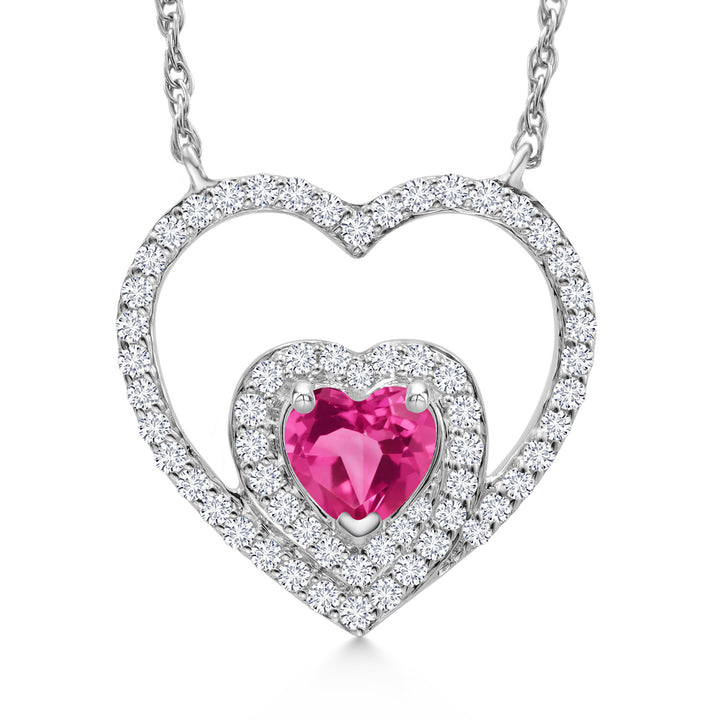 MEASUREMENTS: 4x4mm Heart Shape Heat-Treated Pink Created Sapphire, 1x1mm Round E - F Lab Grown Diamond. Total Carat Weight is 0.81 cttw