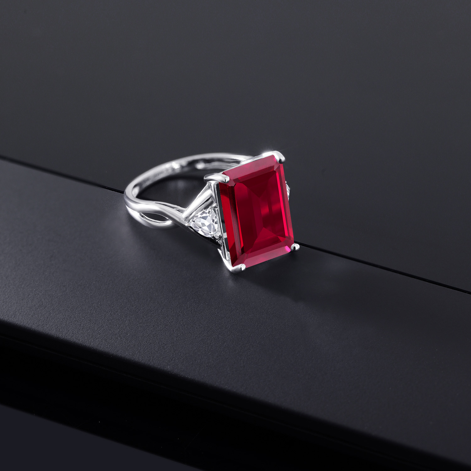 MEASUREMENTS: 14x10mm Emerald Cut Heat-Treated Red Created Ruby, 4x4mm Trillion Heat-Treated White Created Sapphire. Total Carat Weight is 5.64 cttw