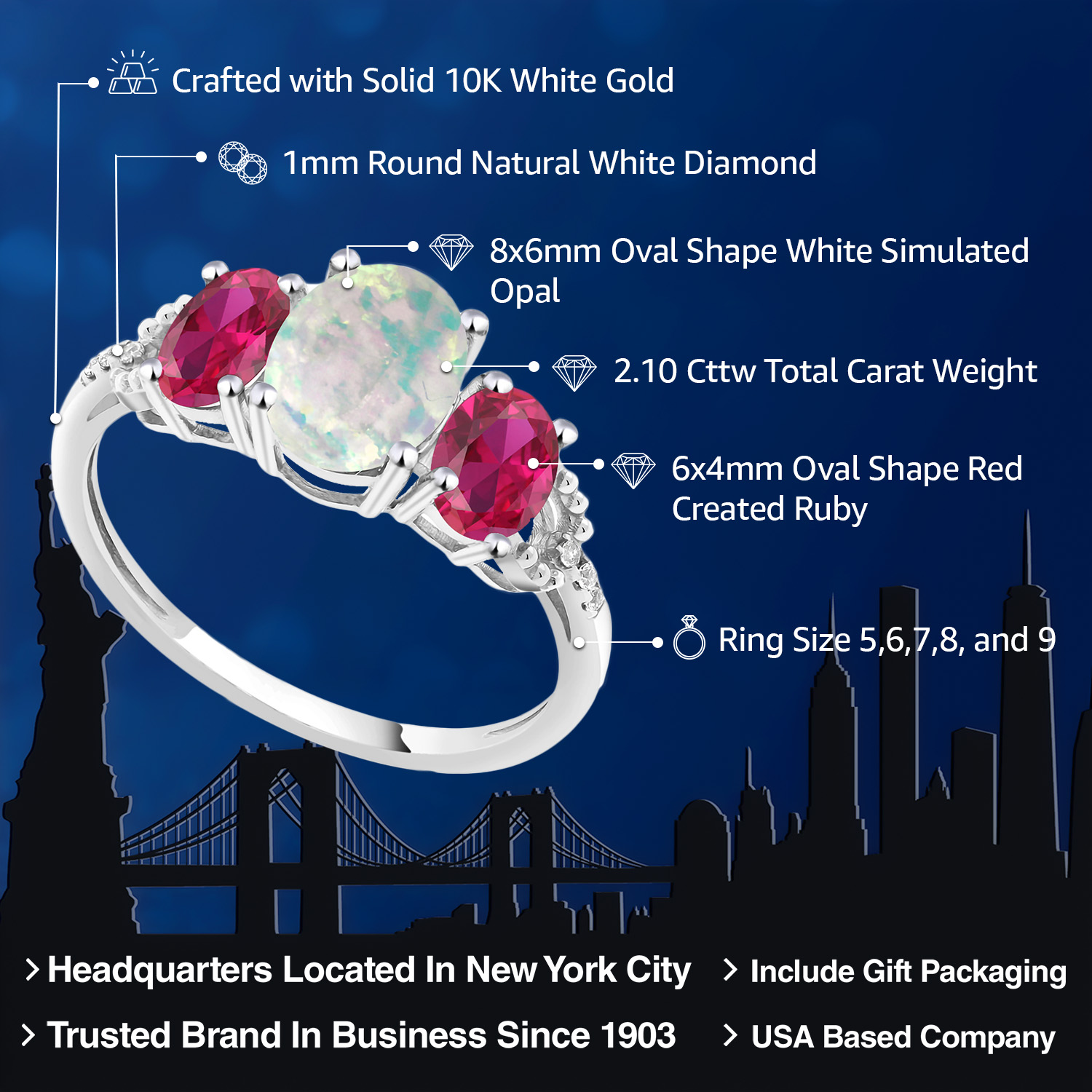 STUNNING GEMSTONE TRIO: This engagement ring features a captivating combination of a 8X6MM simulated opal center stone, flanked by two 6X4MM red created rubies, creating a striking and unique three-stone design.