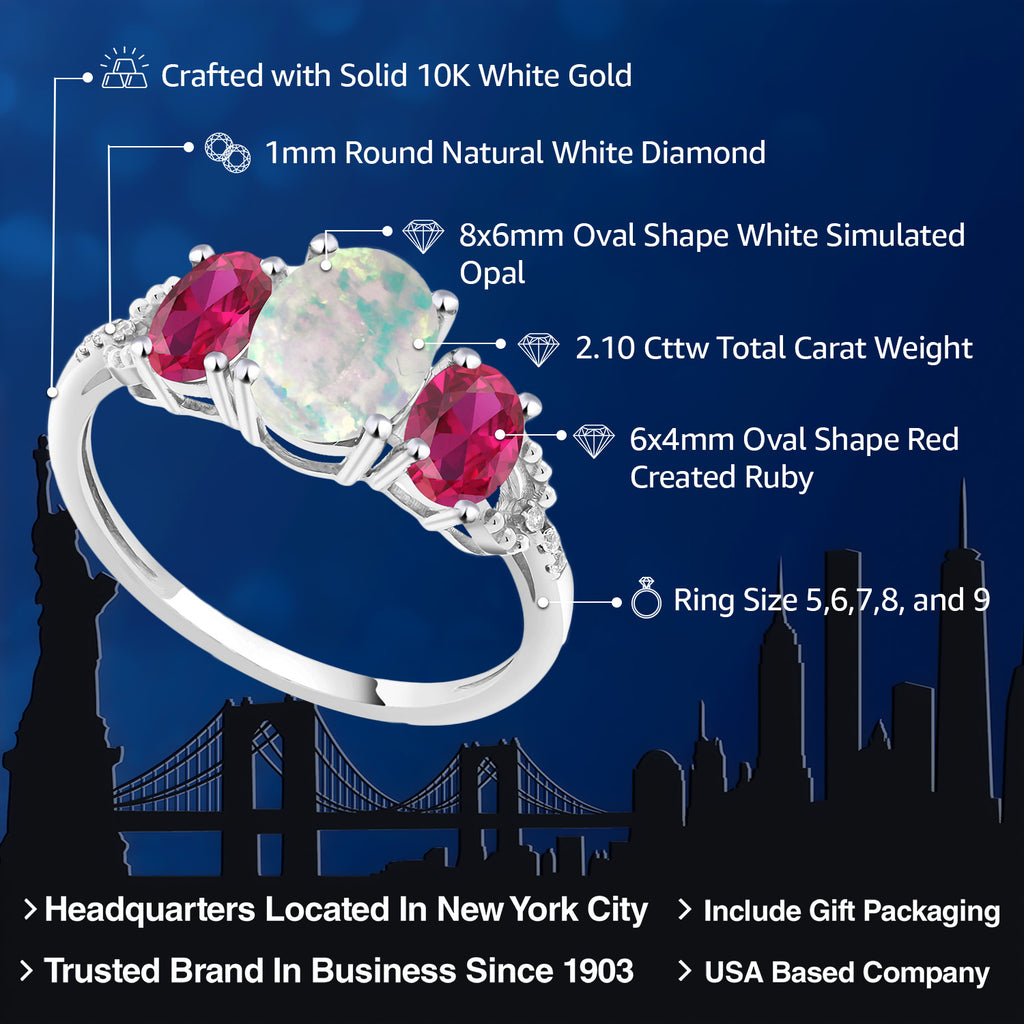 10K White Gold Simulated Opal Red Created Ruby and Diamond Accent 3-Stone Engagement Ring | 2.10 Cttw | Three Stone Wedding Anniversary Promise Ring For Women