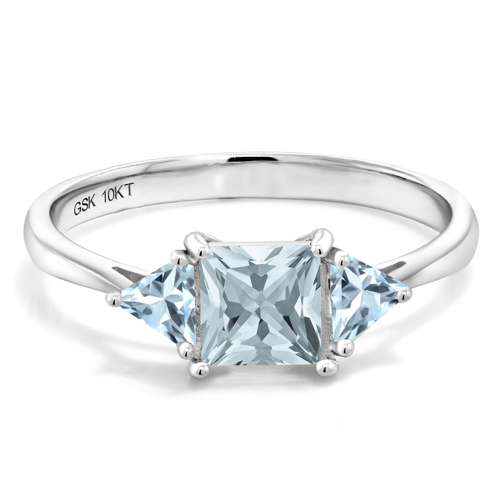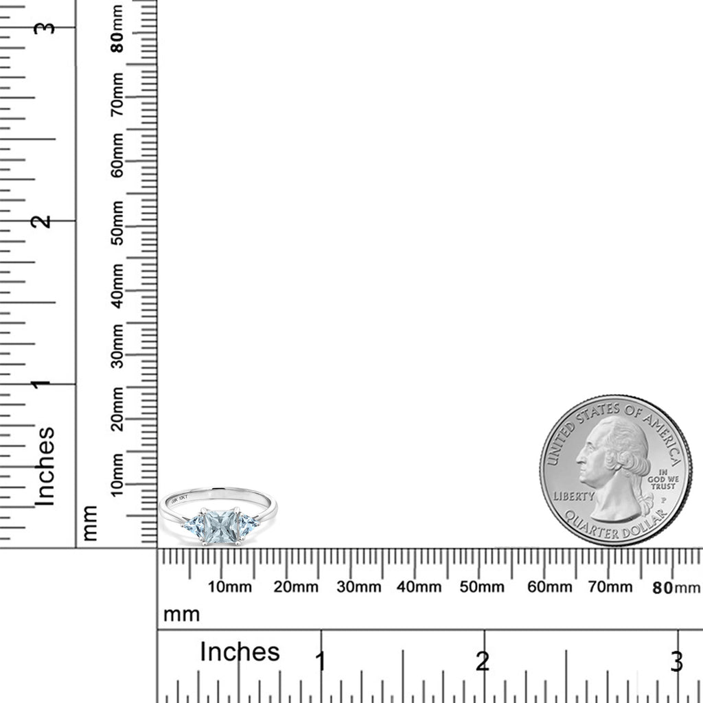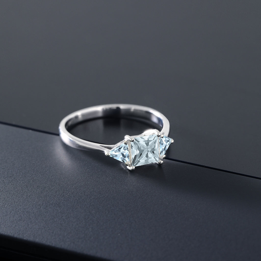 ELEGANT SKY BLUE AQUAMARINE DESIGN: This refined 3-stone engagement ring showcases a 5MM princess-cut Sky Blue Aquamarine flanked by two 3.5MM trillion-cut stones, totaling 0.84 carats. The March birthstone symbolizes serenity, clarity, and eternal love.