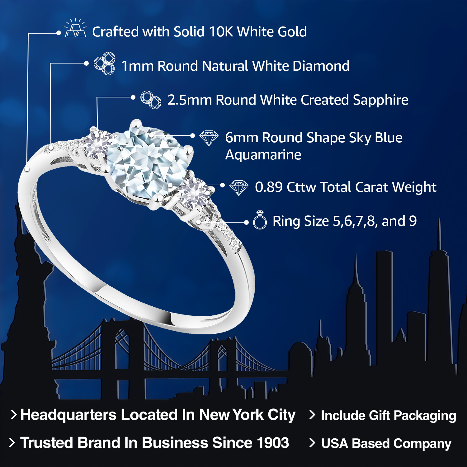 CAPTIVATING SKY BLUE AQUAMARINE CENTERPIECE: This exquisite ring features a 0.89 Cttw, 6MM round sky blue aquamarine, the March birthstone known for its stunning oceanic hues. The aquamarine is perfectly complemented by the ring's 10K white gold setting, making it a symbol of serenity and clarity, ideal for an engagement ring.