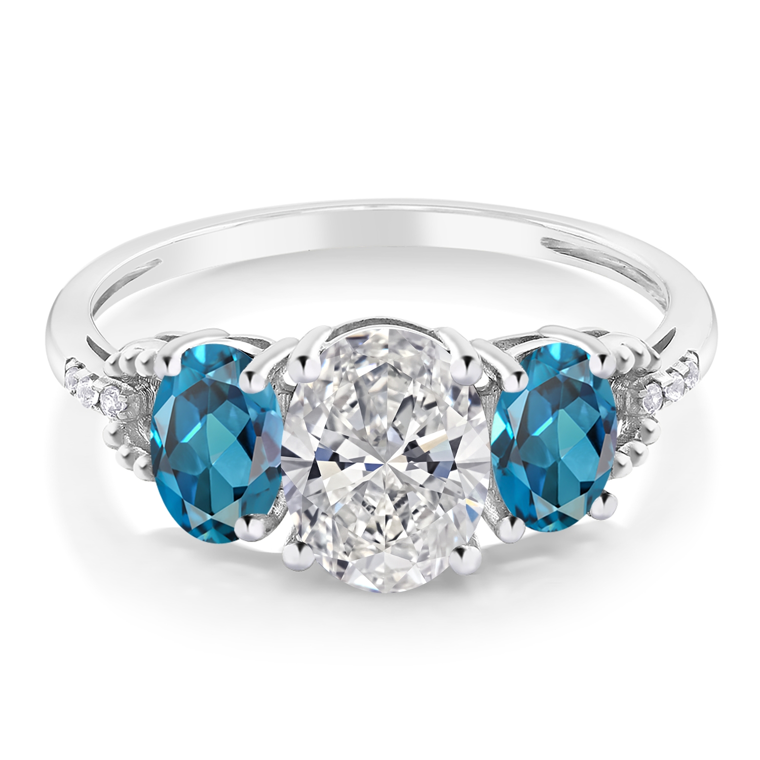 MEASUREMENTS: 9x7mm Oval E - F Lab Grown Diamond, 6x4mm Oval Irradiated London Blue Topaz1, x, 1, mm Round White Diamond. Total Carat Weight is 2.76 cttw