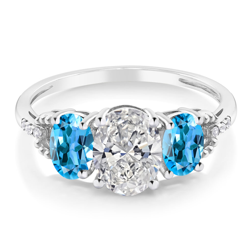 MEASUREMENTS: 9x7mm Oval E - F Lab Grown Diamond, 6x4mm Oval Irradiated Swiss Blue Topaz1, x, 1, mm Round White Diamond. Total Carat Weight is 2.66 cttw