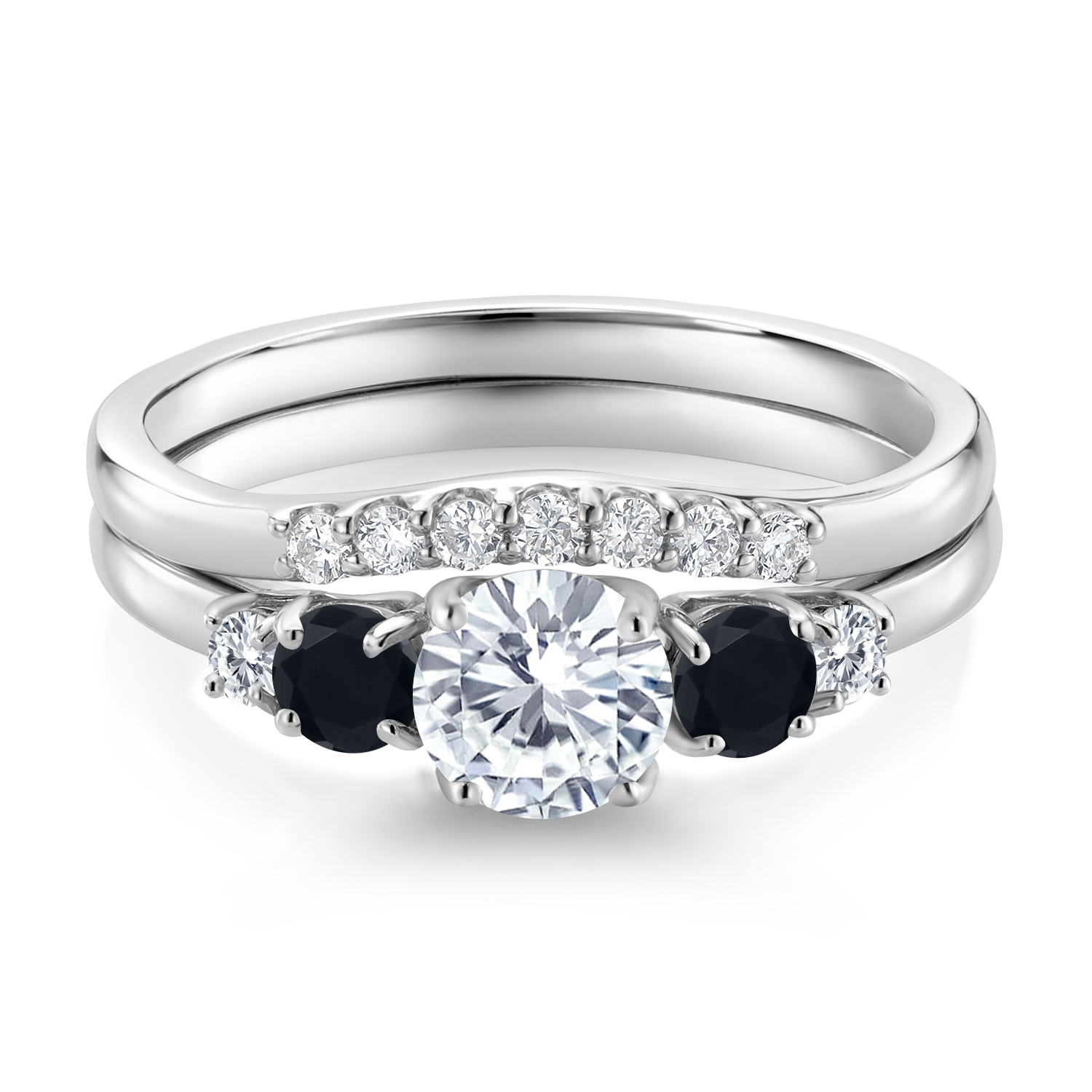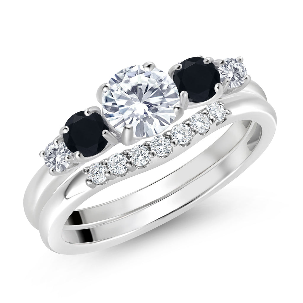 10K White Gold White Lab Grown Diamond and Black Onyx 5-Stone Bridal Engagement Wedding Ring Set For Women | 0.81 Cttw | Round: 5MM and 3MM | Wedding Anniversary Promise Ring