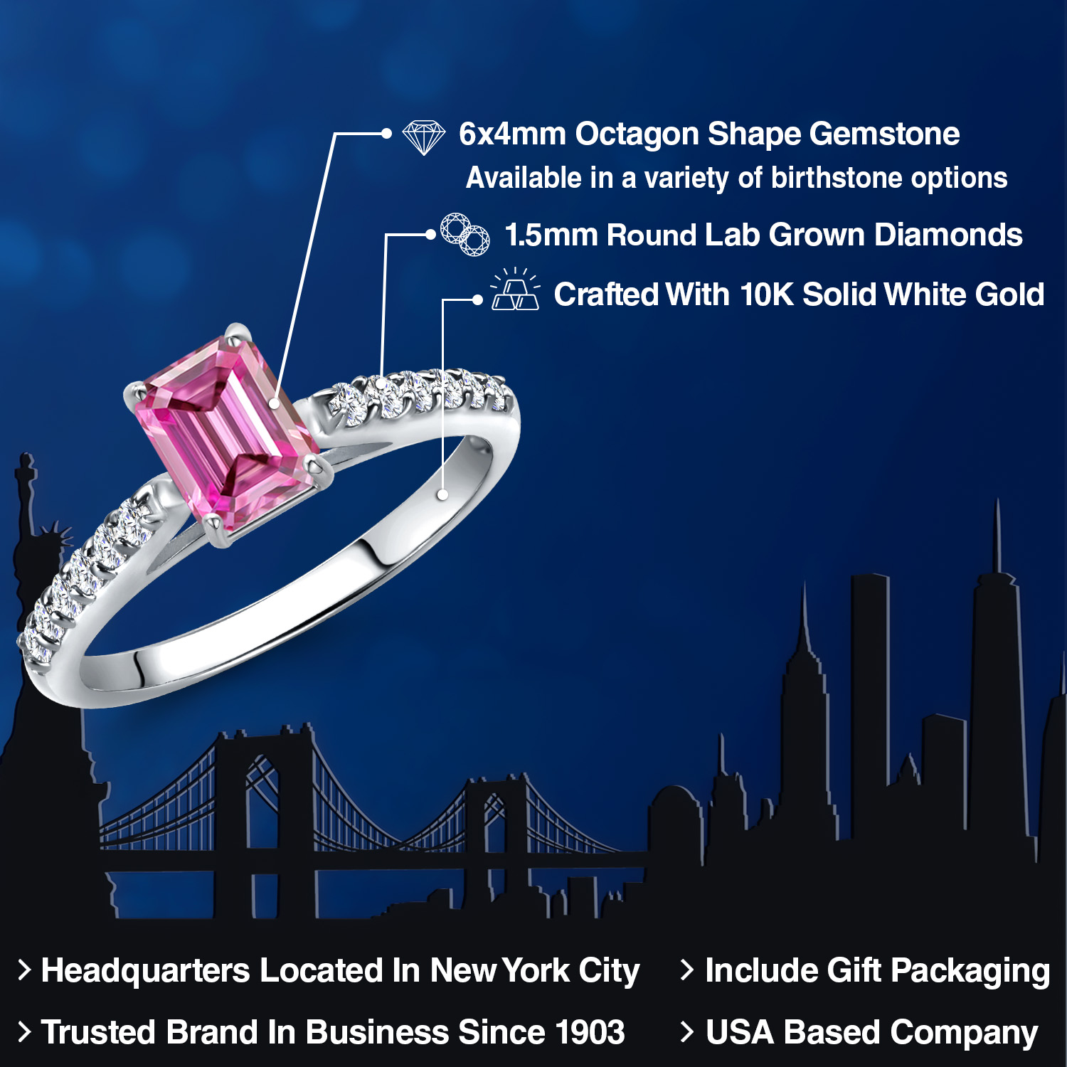 ARTFUL CRAFTSMANSHIP WITH LAB GROWN DIAMONDS: This ring features a captivating design with lab grown diamonds set as side stones, offering an ethical and dazzling complement to the central gemstone. The precision of craftsmanship is evident in every detail, from the secure prong setting that holds the stones to the smooth, polished band. This piece embodies meticulous artistry, ensuring a lifetime of beauty and brilliance.