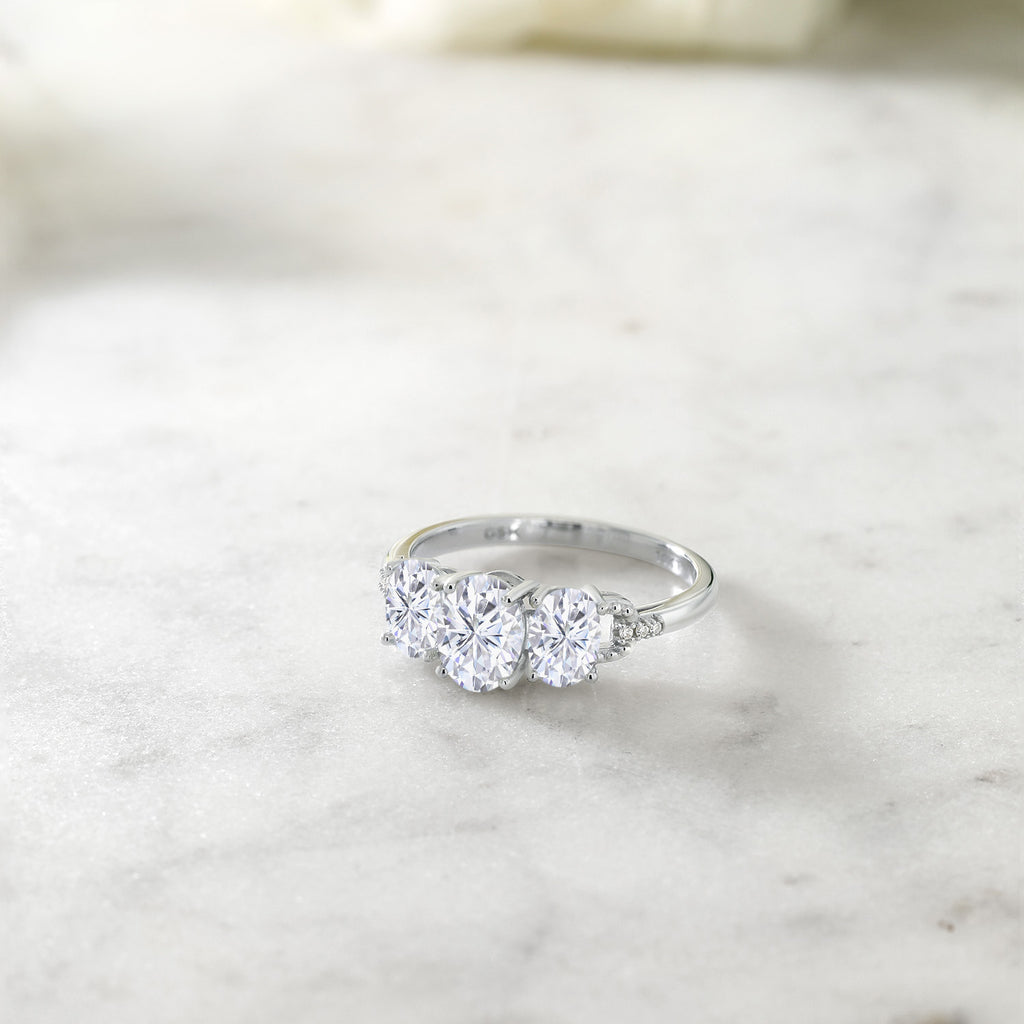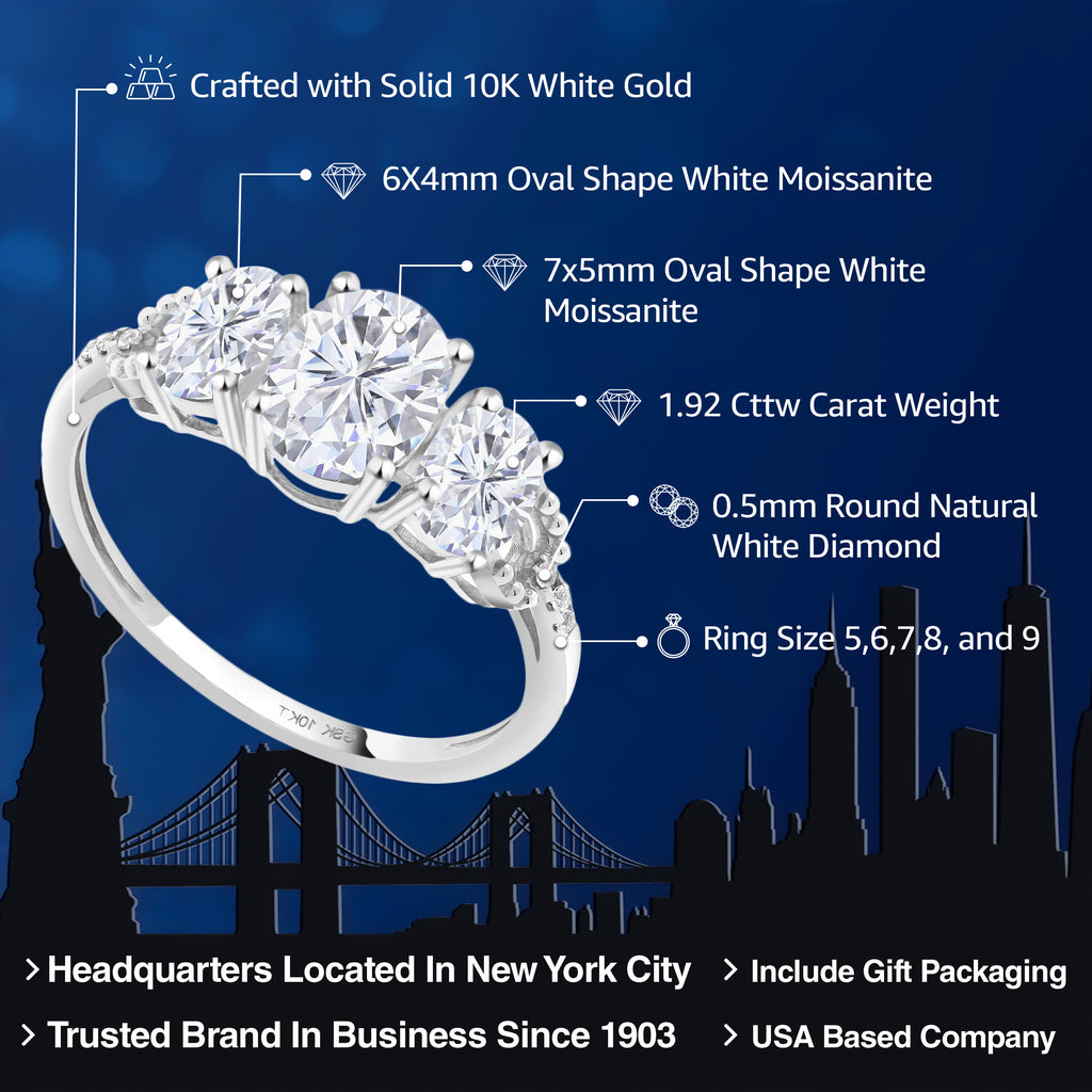 10K White Gold White Moissanite and White Diamond 3-Stone Engagement Ring | 1.92 Cttw | Oval 7X5MM and 6X4MM | Three Stone Wedding Anniversary Promise Ring For Women