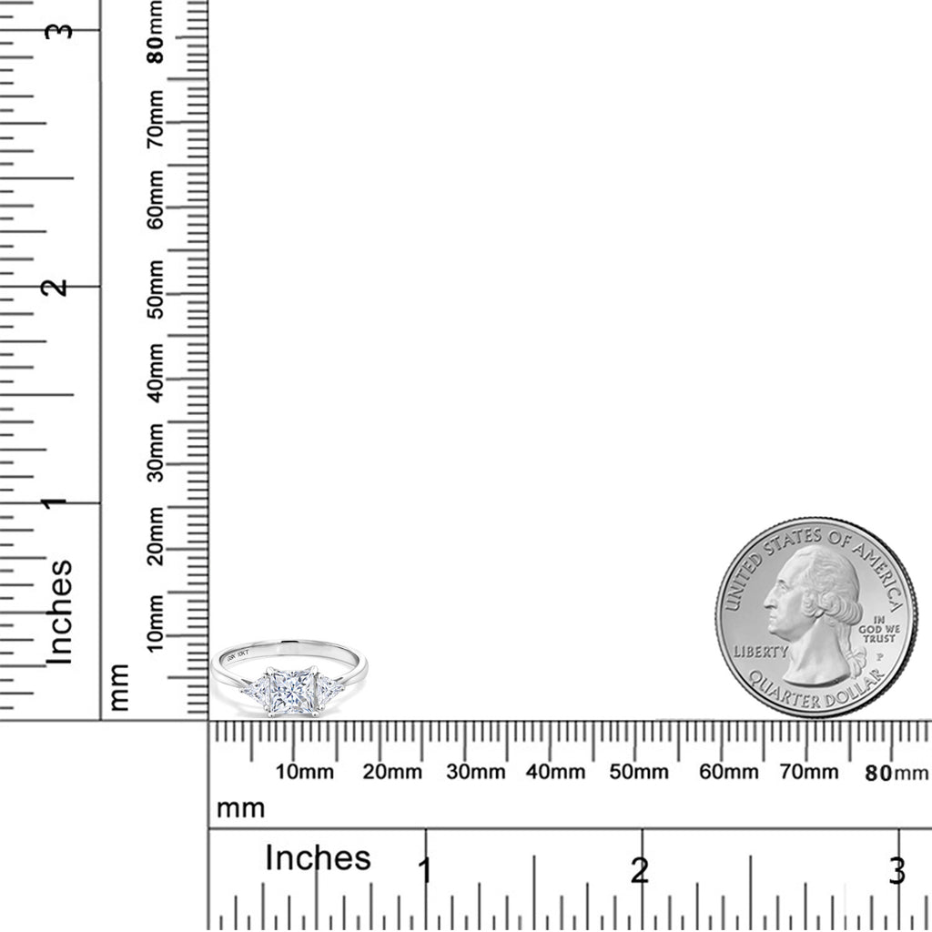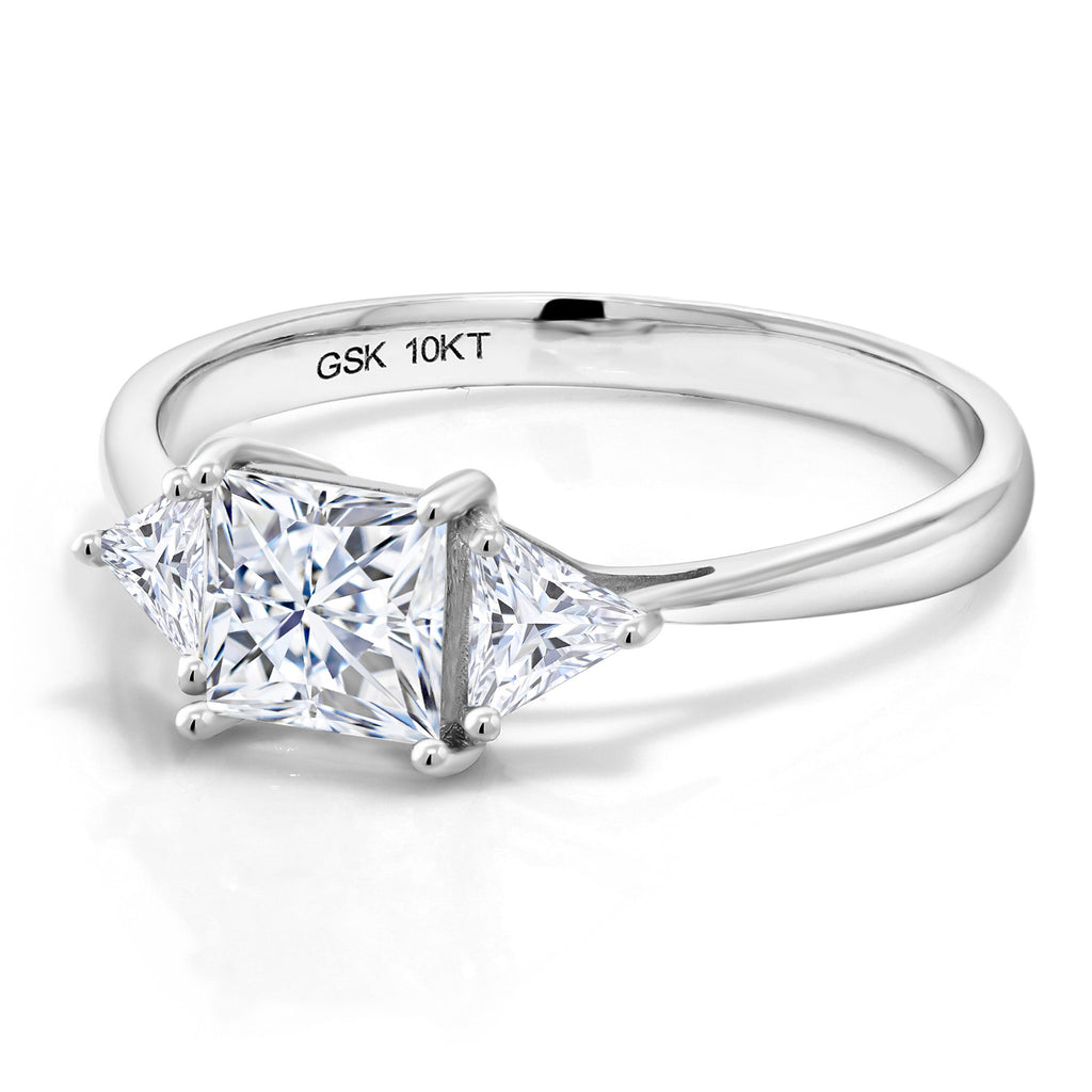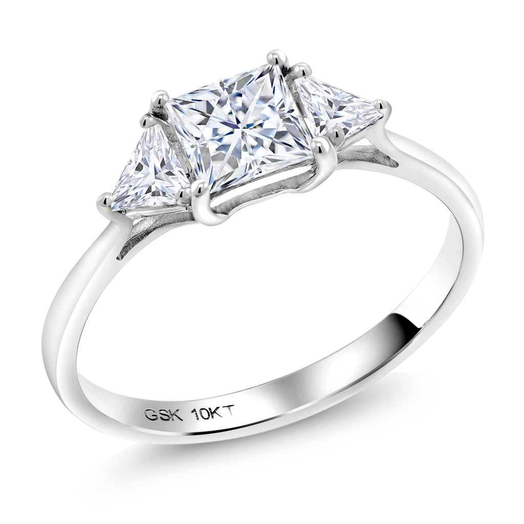 10K White Gold White Moissanite Engagement Ring | 1.12 Cttw | Princess Center 5MM | Trillion 3.5MM | Three Stone Wedding Anniversary Promise Ring For Women