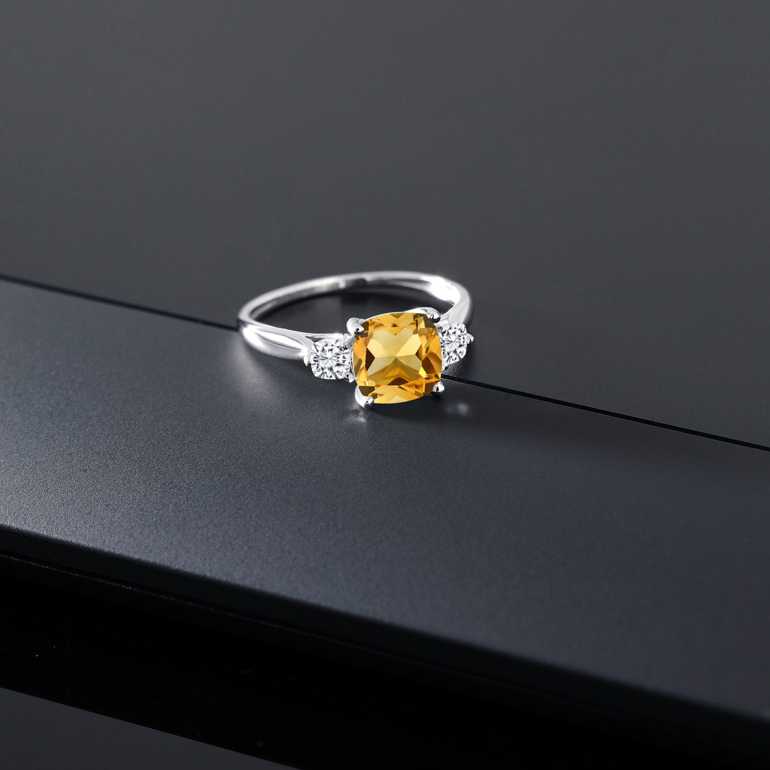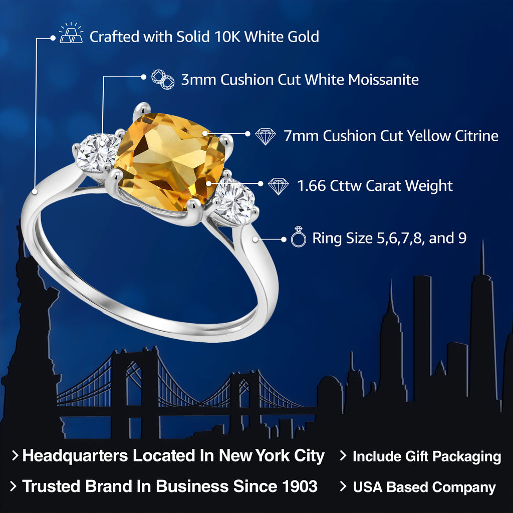 10K White Gold Yellow Citrine and White Moissanite 3 Stone Engagement Ring For Women | 1.66 Cttw, Cushion 7MM | Three Stone Wedding Anniversary Promise Ring For Women
