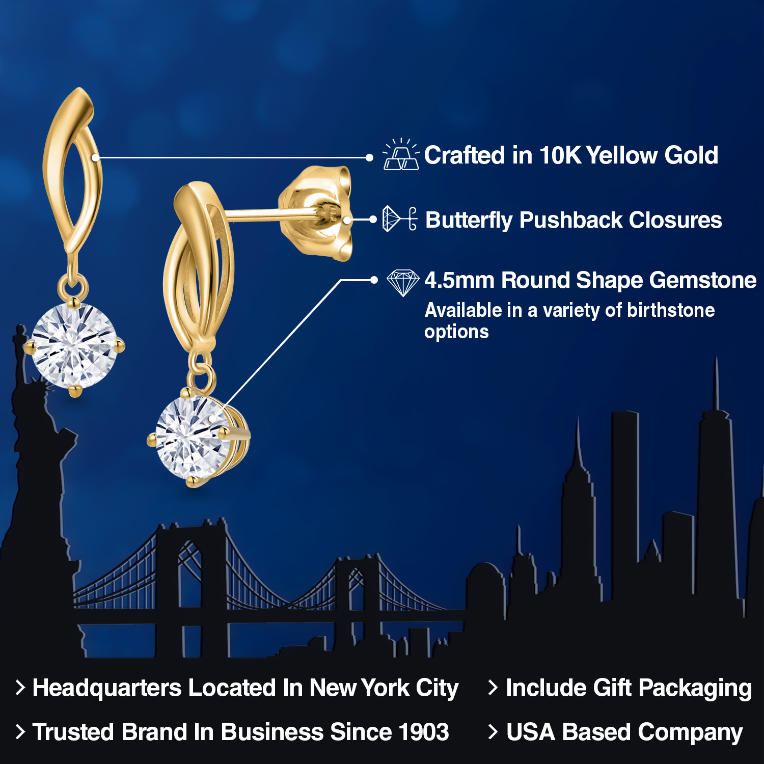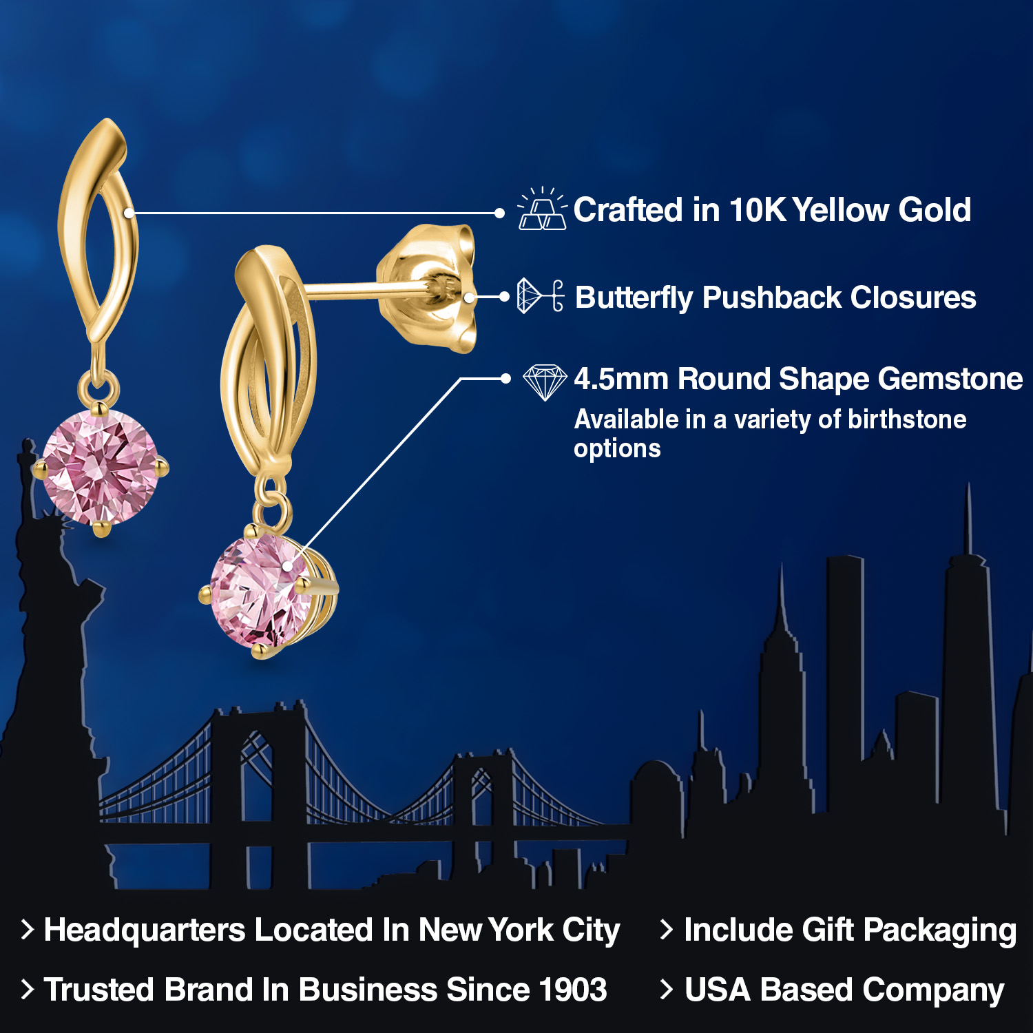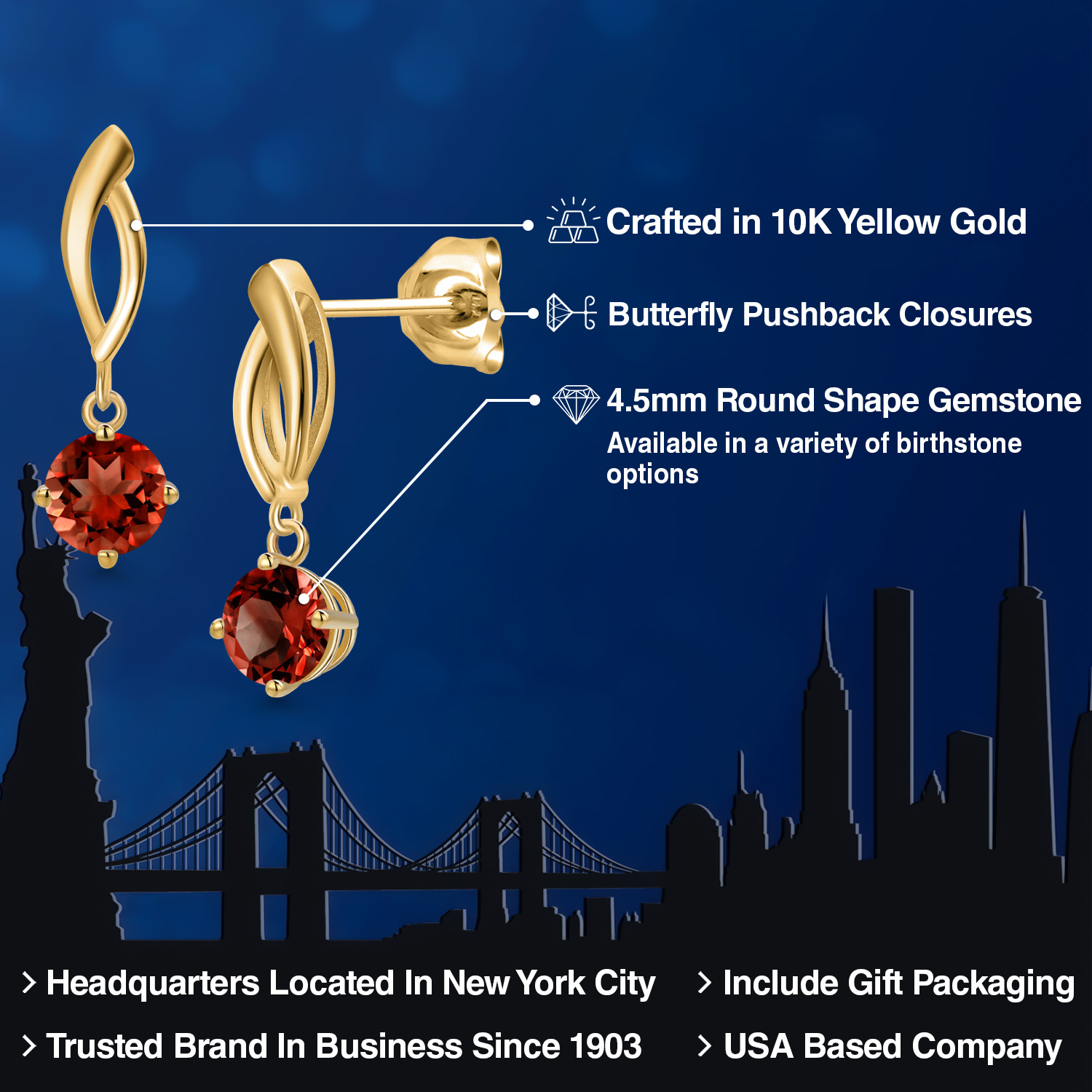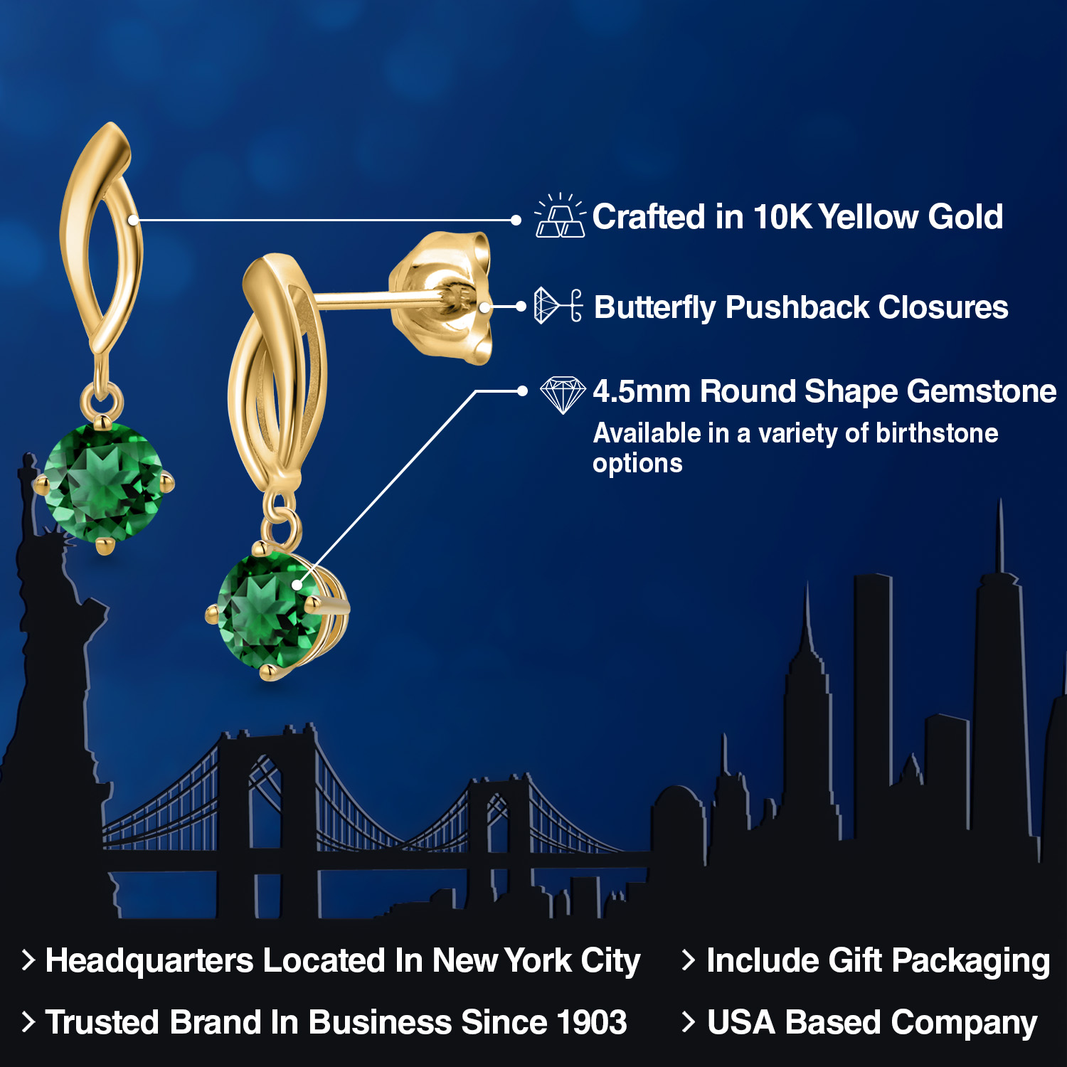 RADIANT 4.5MM ROUND-CUT GEMSTONES: Designed to captivate, each earring is adorned with a 4.5MM round gemstone, carefully chosen for its brilliance and vibrant color. With a variety of birthstone options to select from, these earrings allow you to add a deeply personal and meaningful touch to your style.