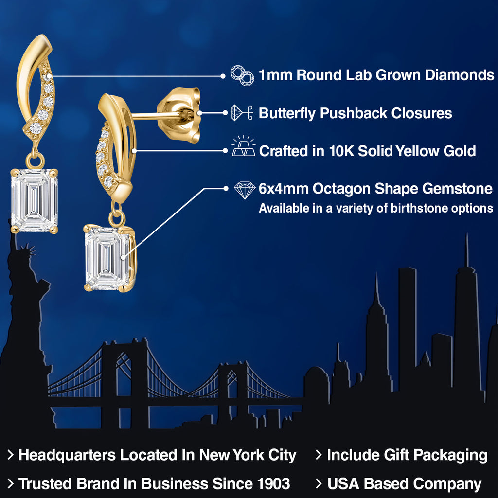 ELEGANT INFINITY DESIGN: These 10K yellow gold dangle earrings feature a graceful infinity motif, accented with 6X4MM emerald-cut gemstone birthstones and sparkling White Lab Grown Diamonds, creating a timeless and sophisticated look.