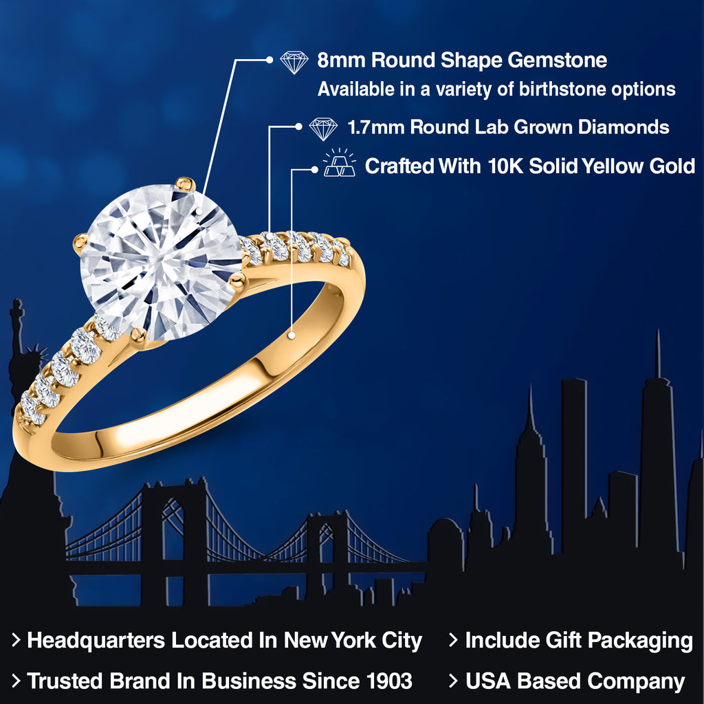 10K Yellow Gold 8MM Round Gemstone Birthstone and White Lab Grown Diamond Engagement Ring | Wedding Anniversary Promise Ring For Women | Available 5, 6, 7, 8, 9