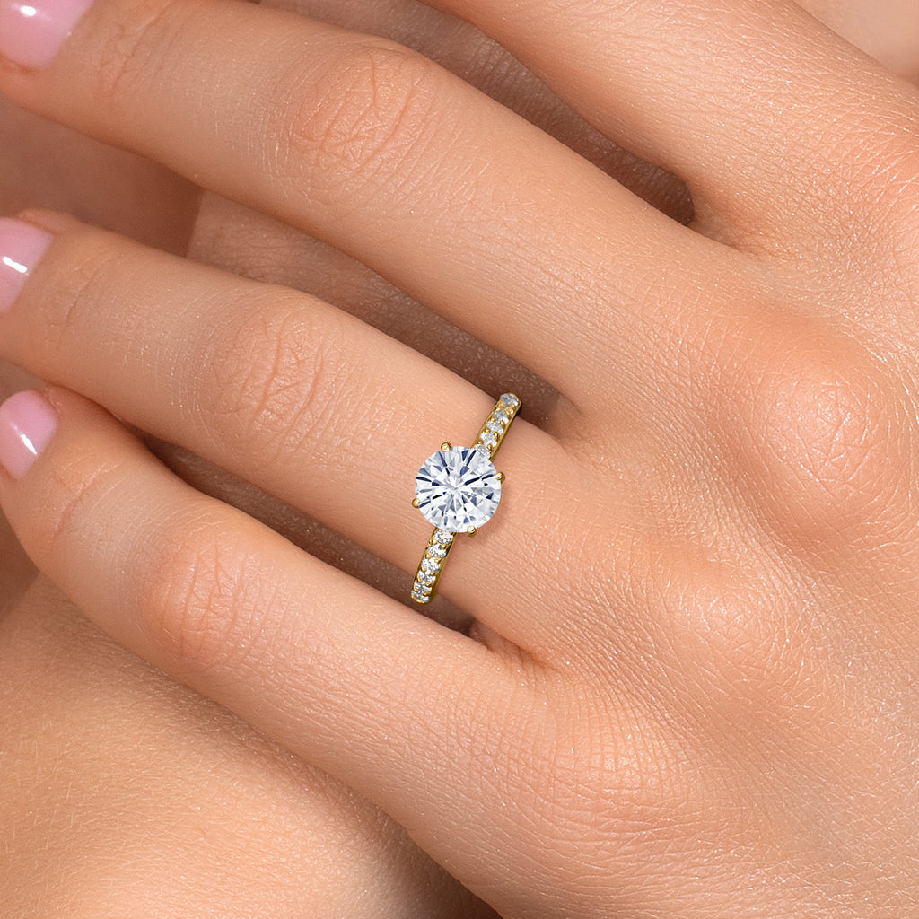 ETHICALLY SOURCED ACCENT DIAMONDS: The band is adorned with sparkling 1.7MM round lab-grown diamonds, each boasting VVS-VS clarity and a pristine E-F color grade. These superior-quality diamonds add a layer of sophistication and ethical brilliance, beautifully accentuating the centerpiece. Their radiant sparkle provides a perfect balance of elegance and sustainability.