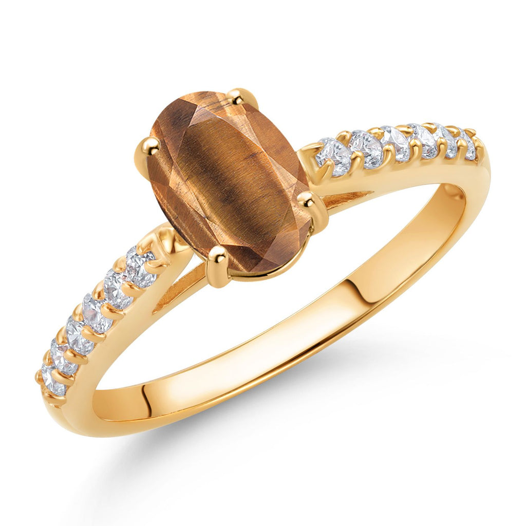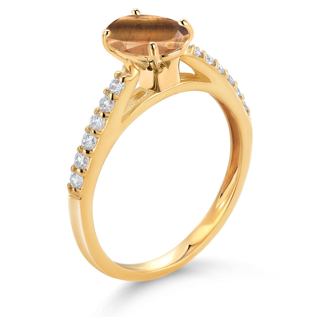 MEASUREMENTS: 8x6mm Oval Brown Tiger Eye, 1.5x1.5mm Round E - F Lab Grown Diamond. Total Carat Weight is 1.43 cttw
