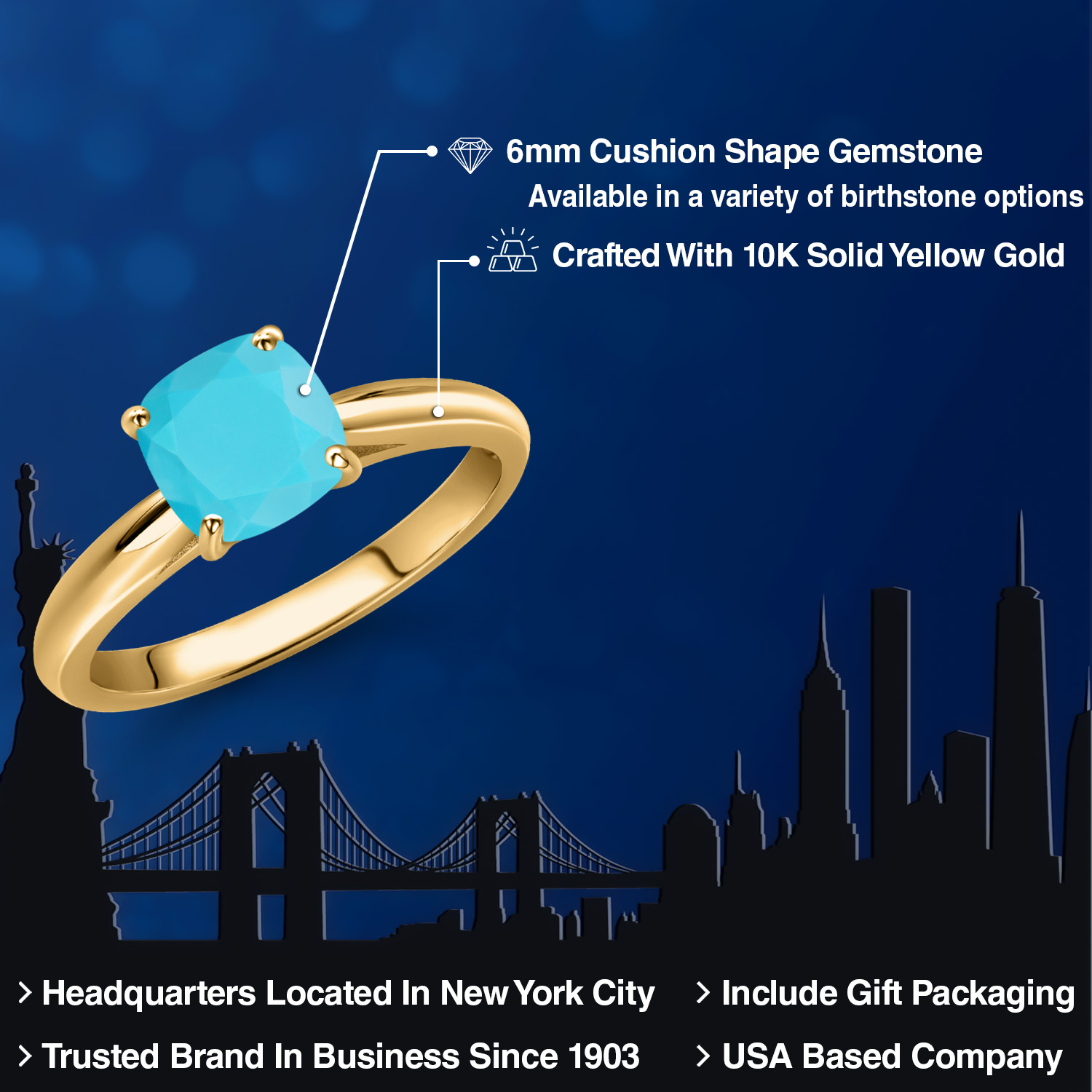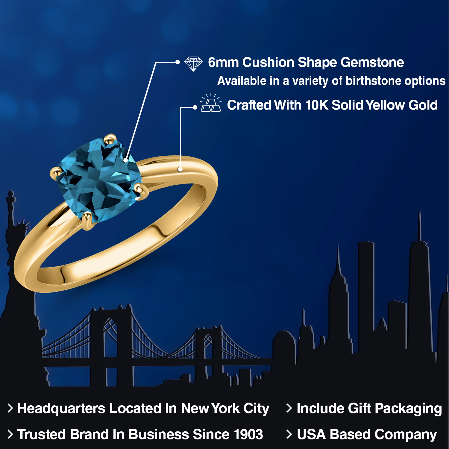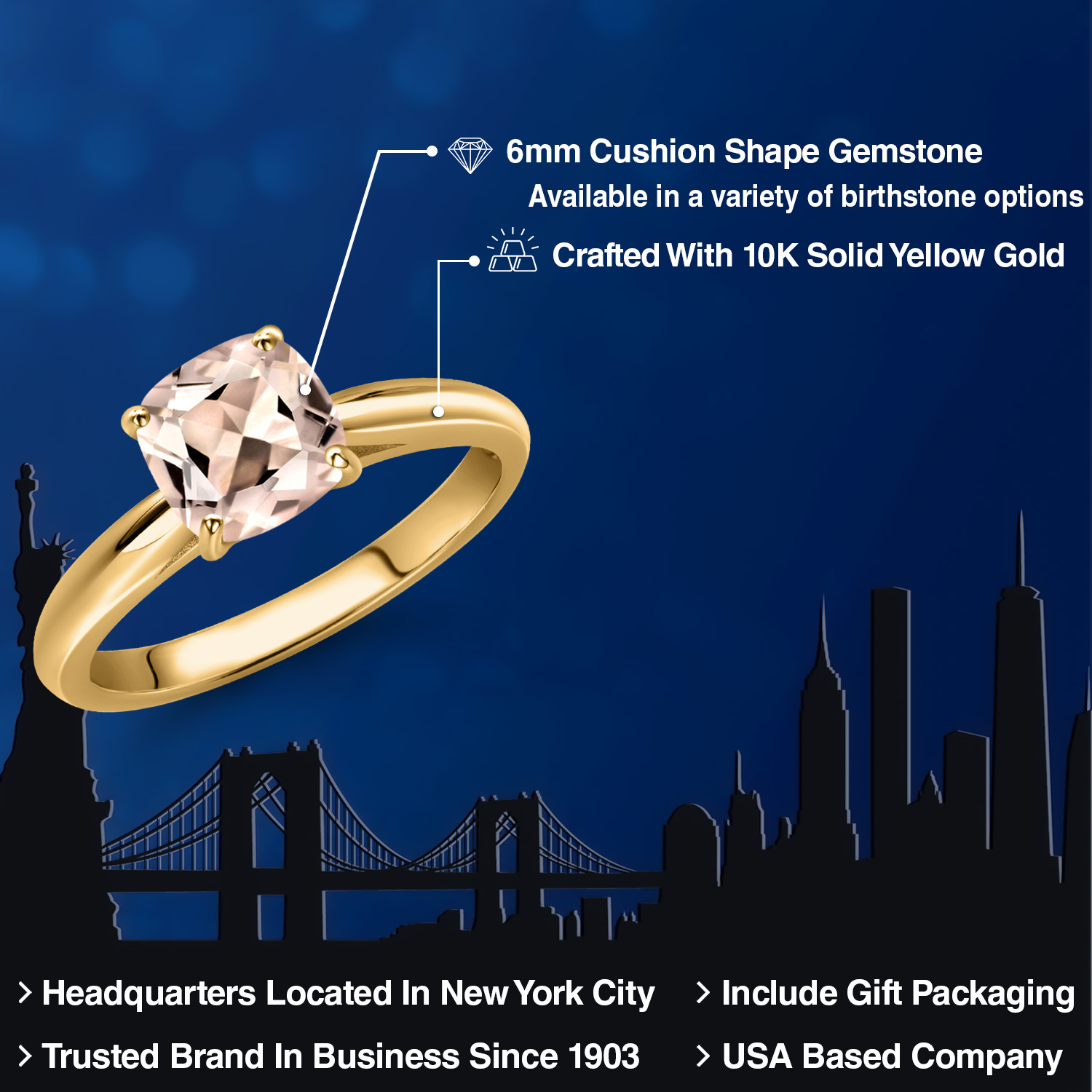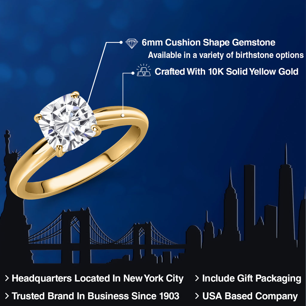 CAPTIVATING CUSHION CUT GEMSTONE: This elegant 10K yellow gold engagement ring showcases a stunning 6MM cushion-shaped gemstone, celebrated for its unique blend of classic elegance and modern sophistication. Available in a variety of birthstones, each gem radiates vibrant color and exceptional clarity, making it a perfect choice for commemorating special moments. The cushion cut enhances light reflection, resulting in a dazzling display of brilliance and fire that captivates the heart.