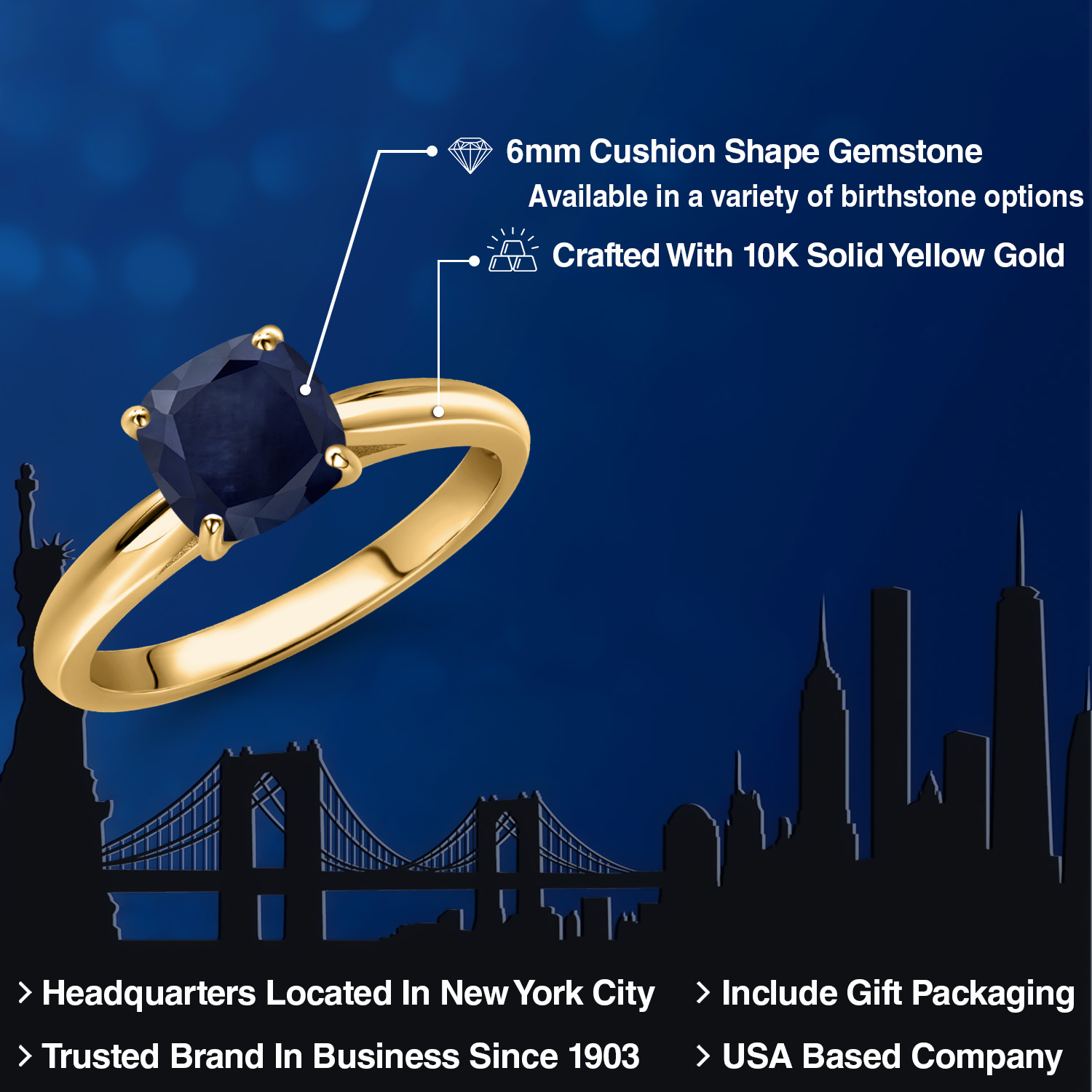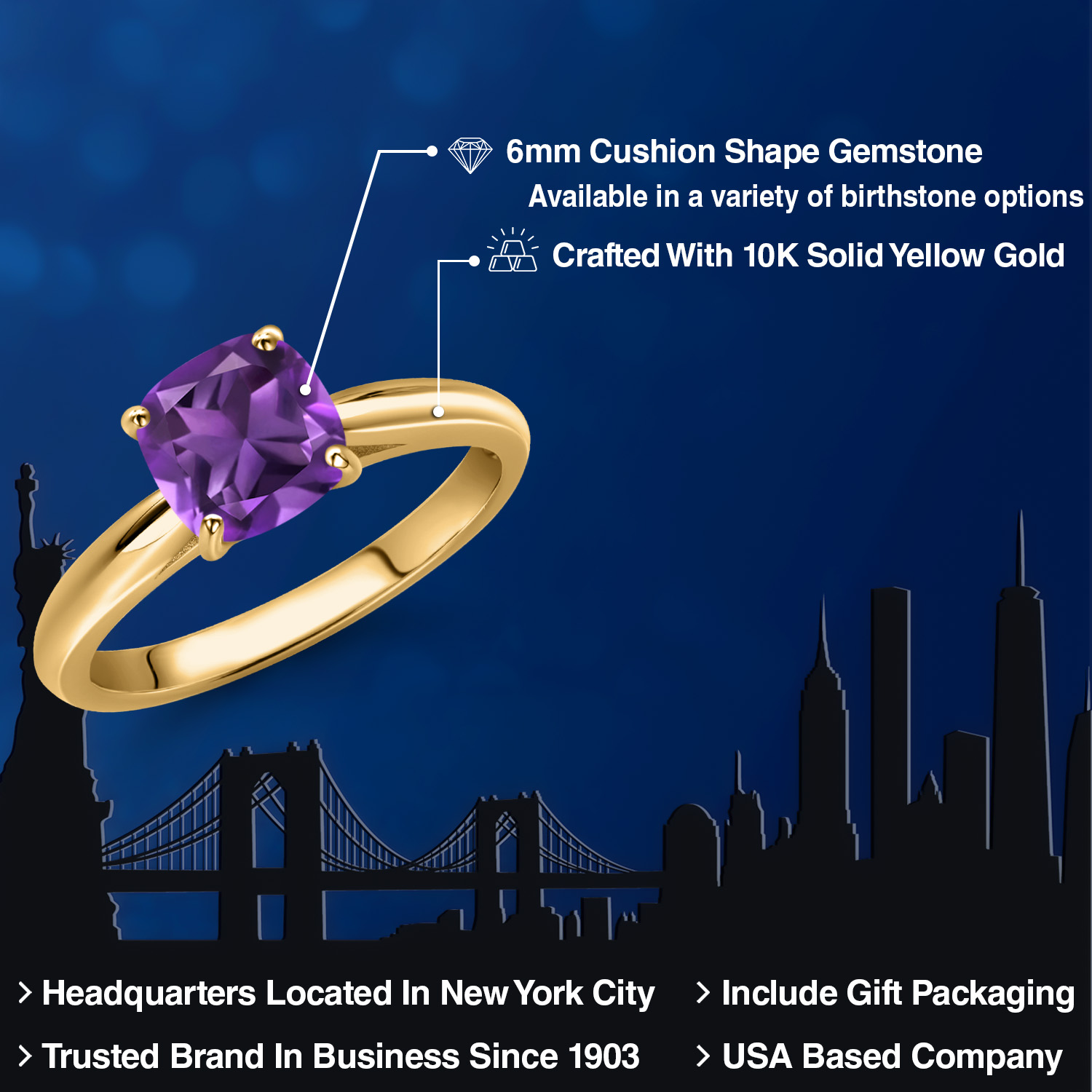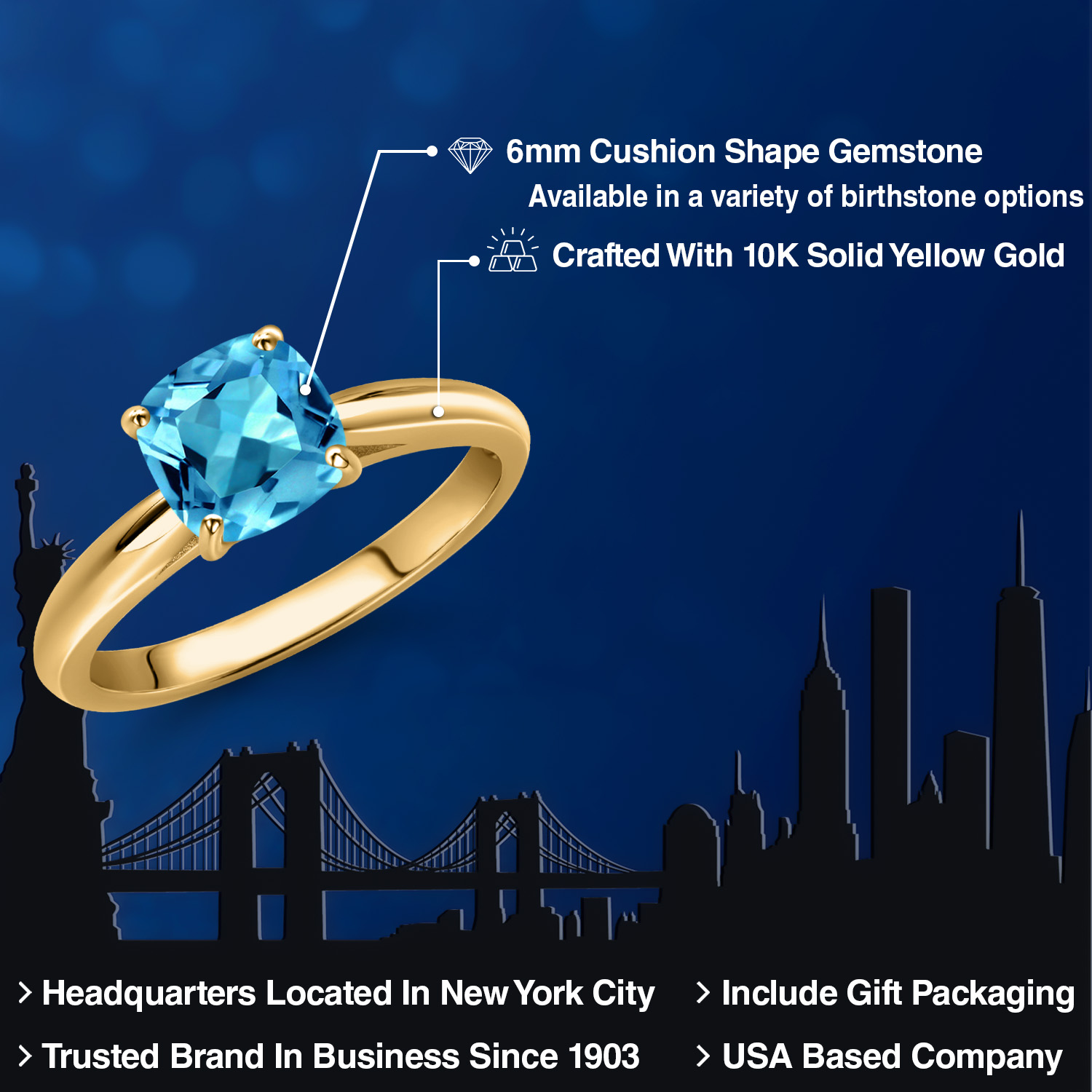 CAPTIVATING CUSHION CUT GEMSTONE: This elegant 10K yellow gold engagement ring showcases a stunning 6MM cushion-shaped gemstone, celebrated for its unique blend of classic elegance and modern sophistication. Available in a variety of birthstones, each gem radiates vibrant color and exceptional clarity, making it a perfect choice for commemorating special moments. The cushion cut enhances light reflection, resulting in a dazzling display of brilliance and fire that captivates the heart.