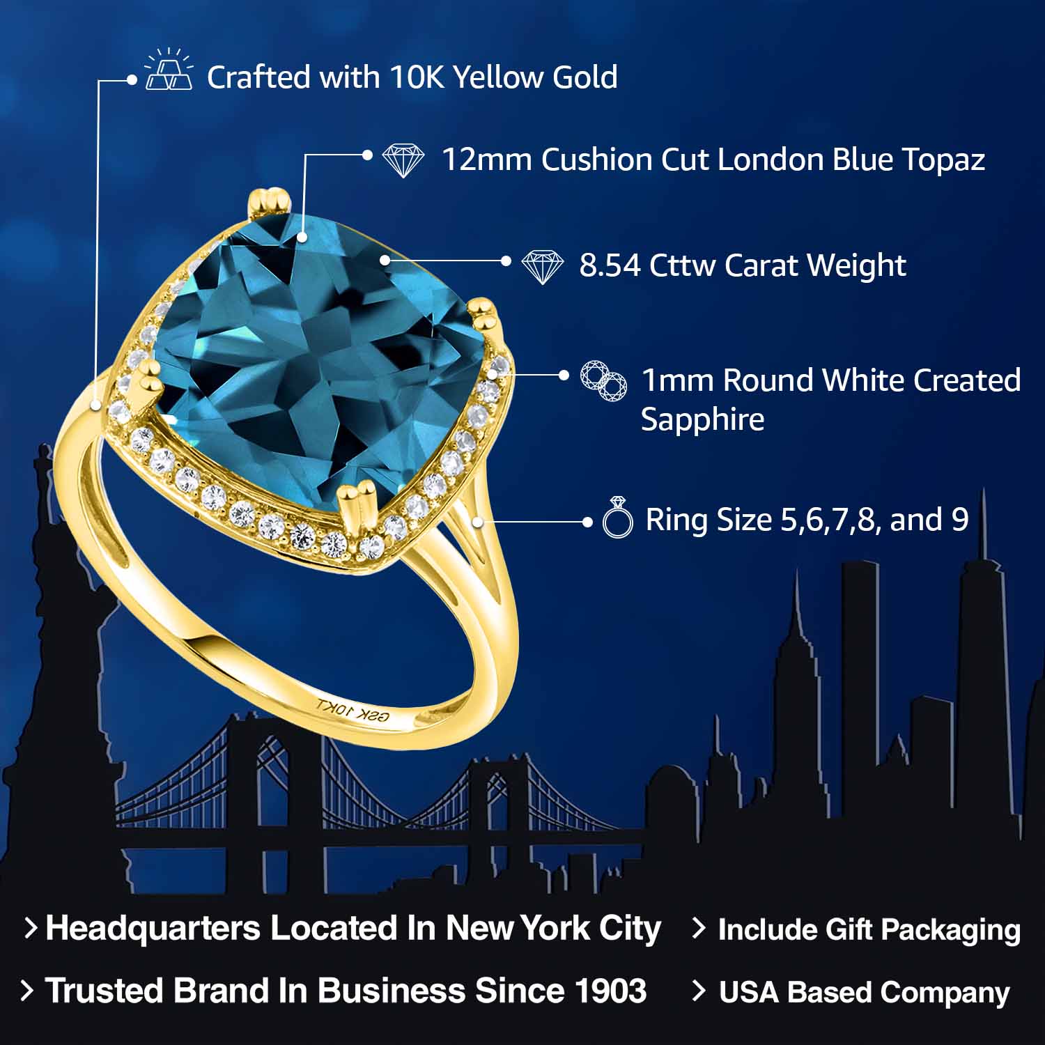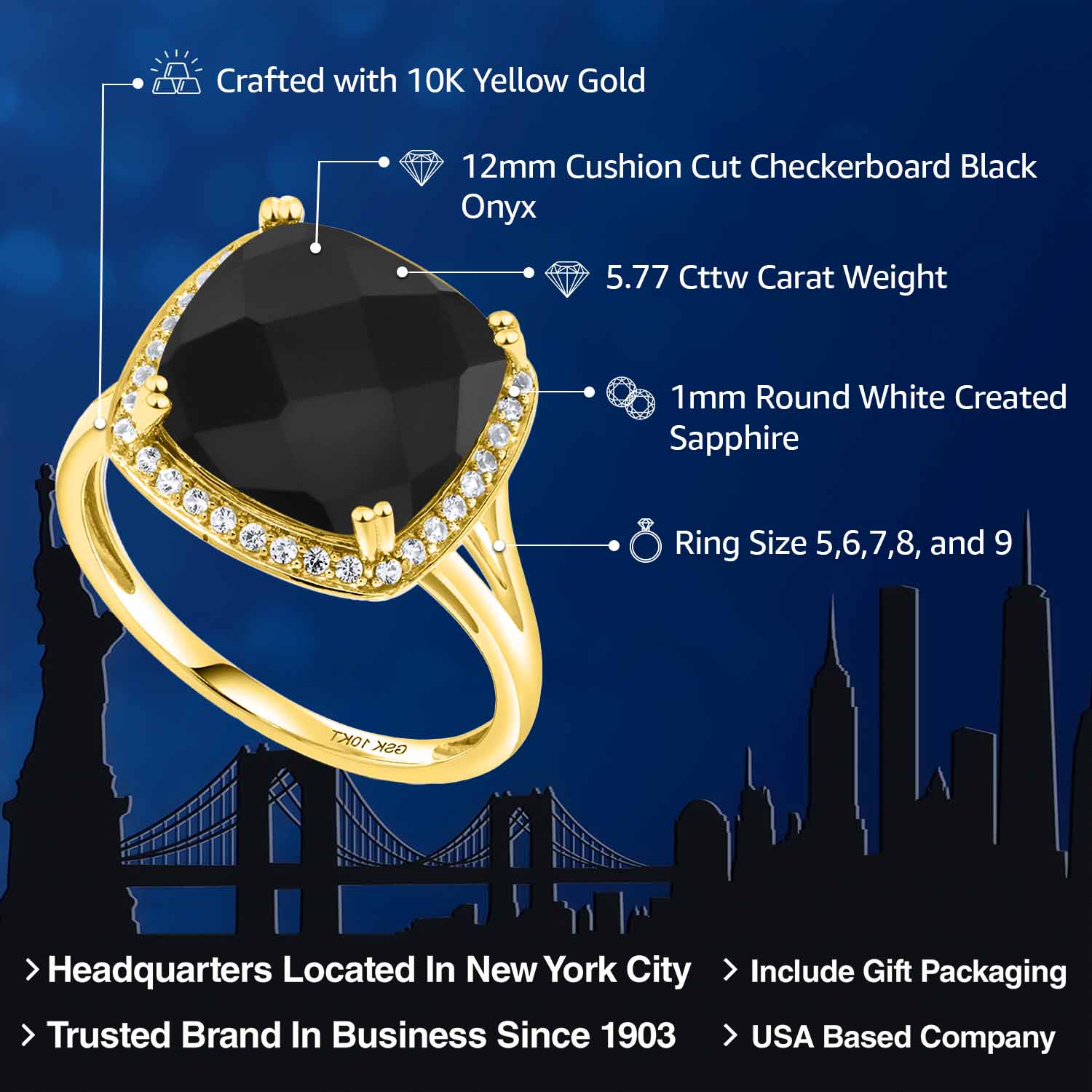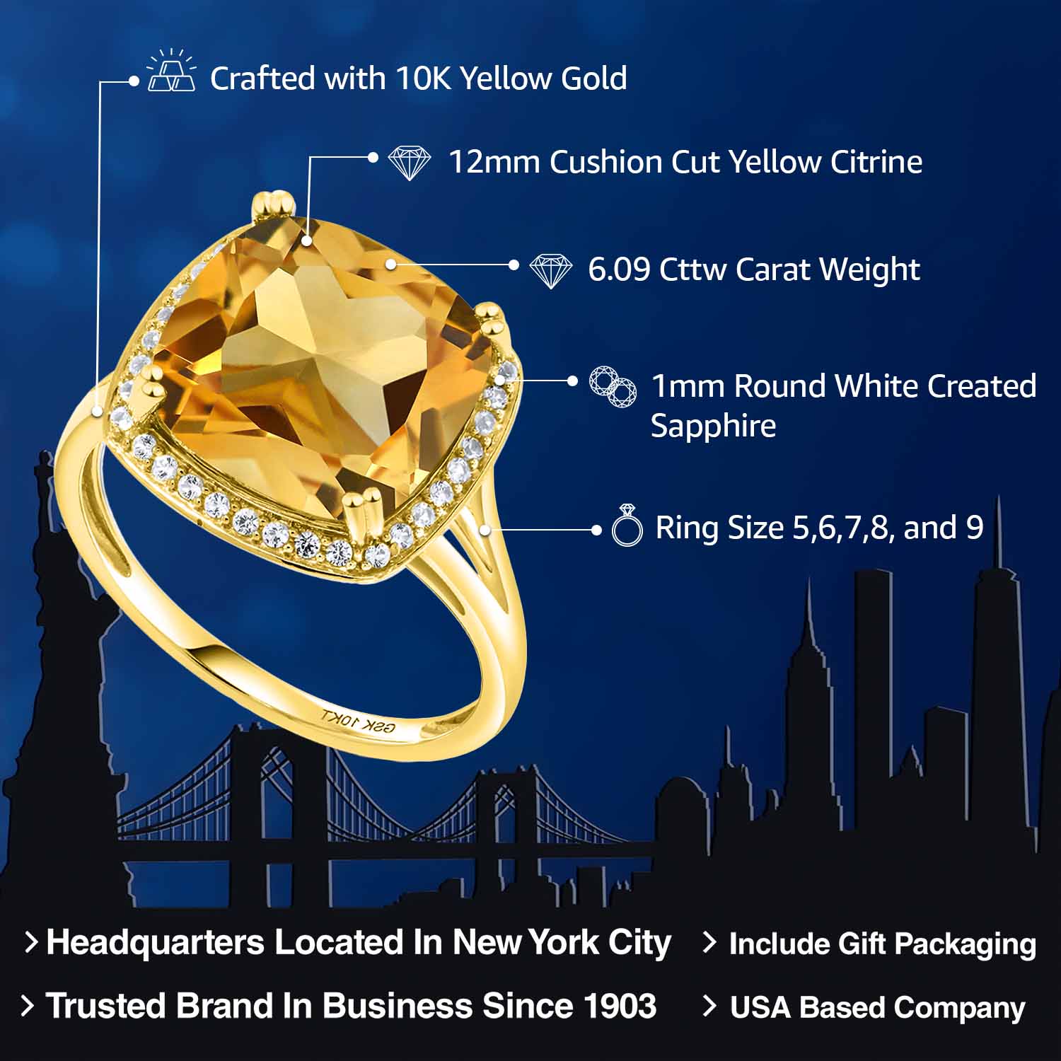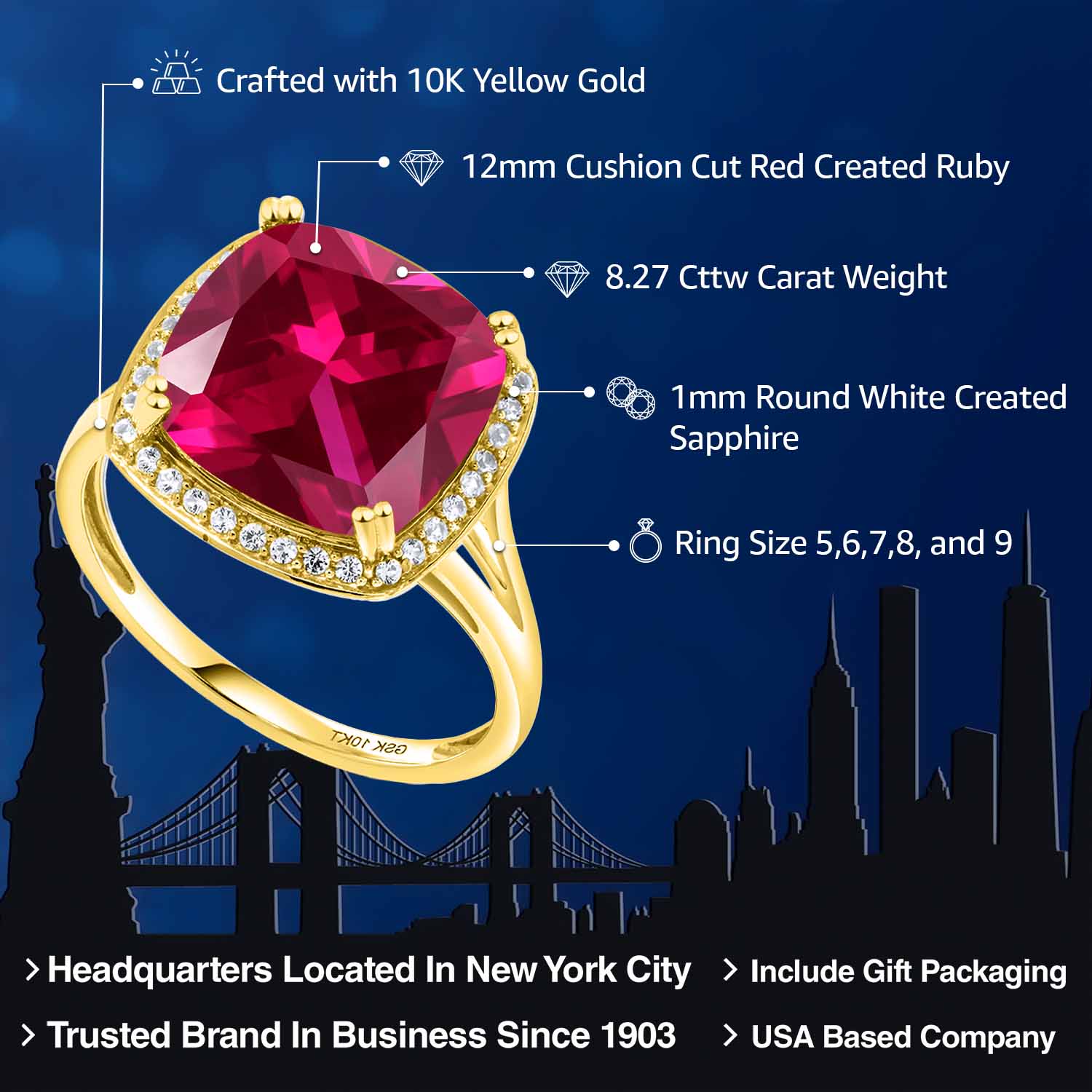 5-8 Cttw 10K Yellow Gold Gemstone Birthstone and White Created Sapphire Ring For Women | Cushion 12MM | Wedding Anniversary Promise Ring For Women | Available In Size 5, 6, 7, 8, 9