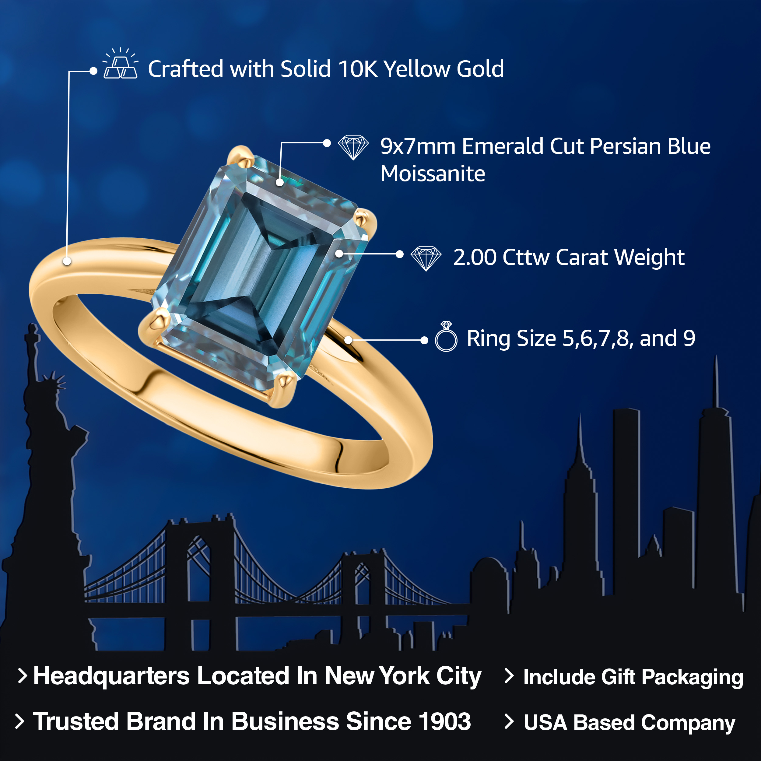 TIMELESS SOLITAIRE DESIGN: This elegant engagement ring features a stunning 9x7mm emerald-cut gemstone, set in luxurious 10K yellow gold. The classic solitaire design highlights the beauty and brilliance of the gemstone, making it a perfect symbol of your everlasting love.