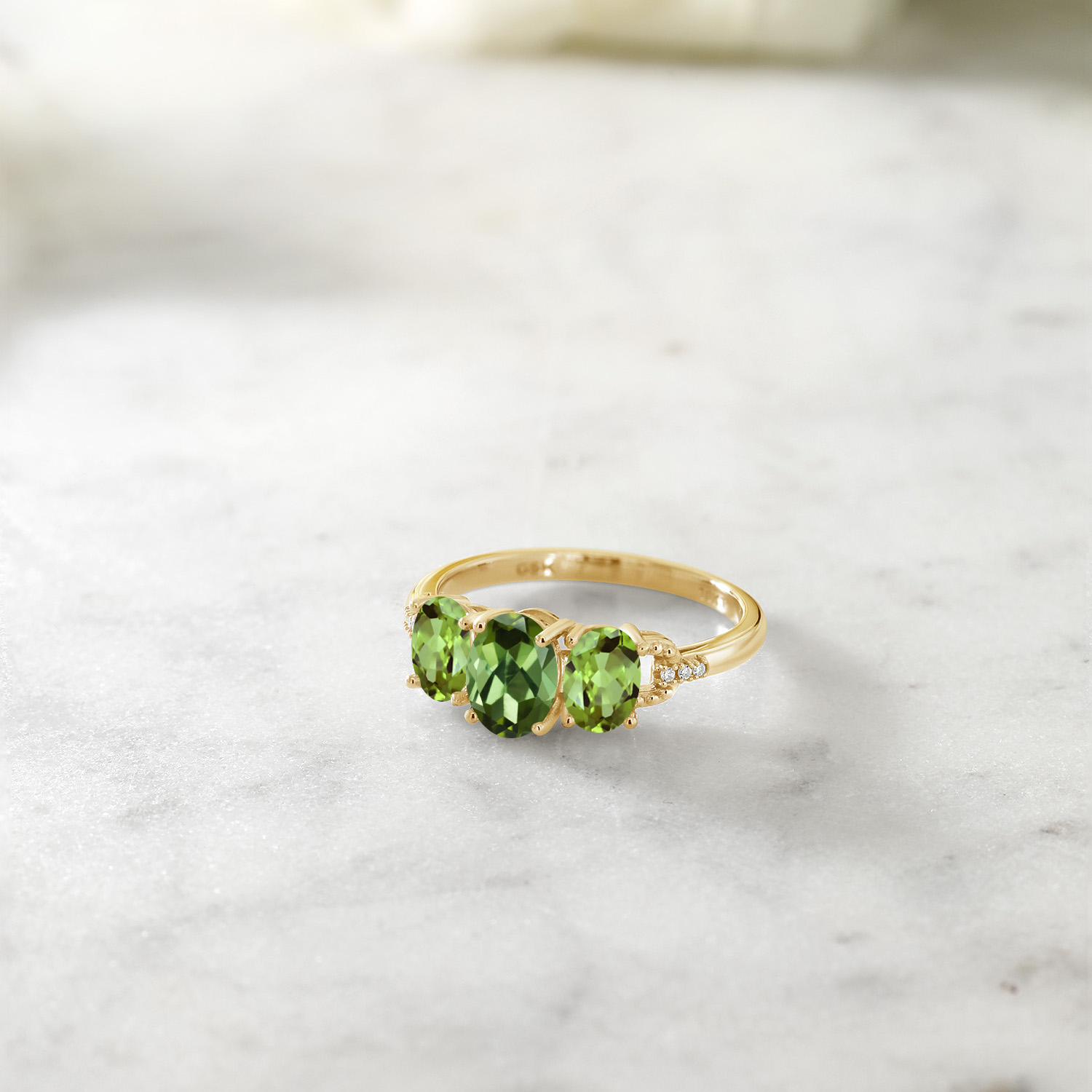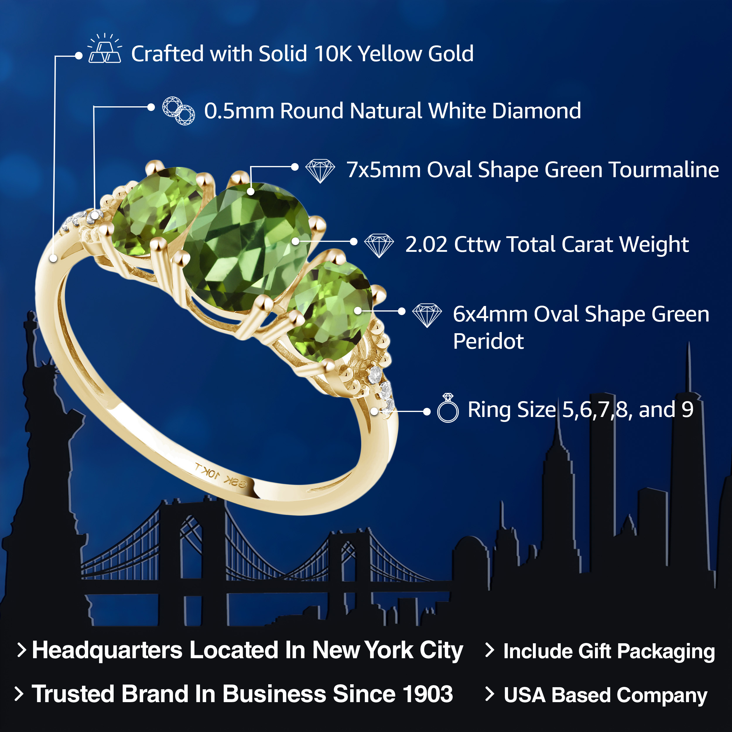 SOLID 10K YELLOW GOLD SETTING: Expertly crafted in genuine 10K yellow gold, the polished band enhances the natural sparkle of the diamonds while bringing warmth to the green tones of tourmaline and peridot. This precious metal ensures lasting durability, shine, and hypoallergenic comfort for years of wear.