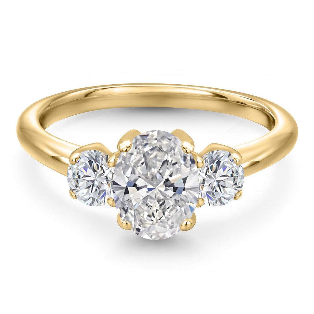 THREE-STONE BRILLIANCE: The ring showcases a captivating three-stone design, featuring a central oval diamond flanked by two round 4MM lab-grown diamonds. Each stone is meticulously set to maximize brilliance and fire, highlighting exceptional craftsmanship. The harmonious blend of shapes and sizes creates a balanced, eye-catching design that symbolizes past, present, and future, making it a meaningful choice for engagements, anniversaries, or promises.