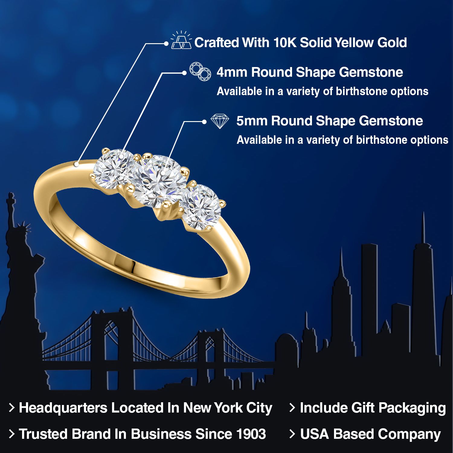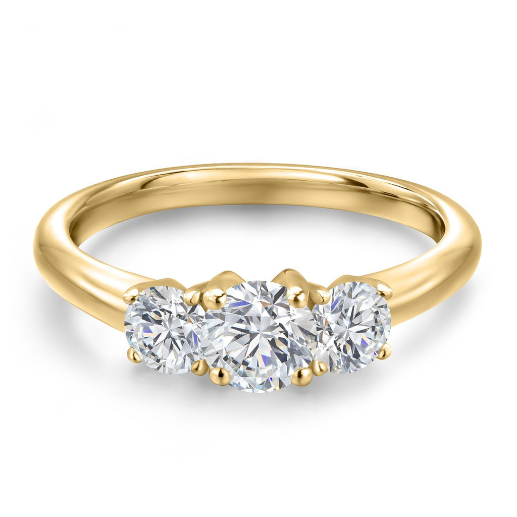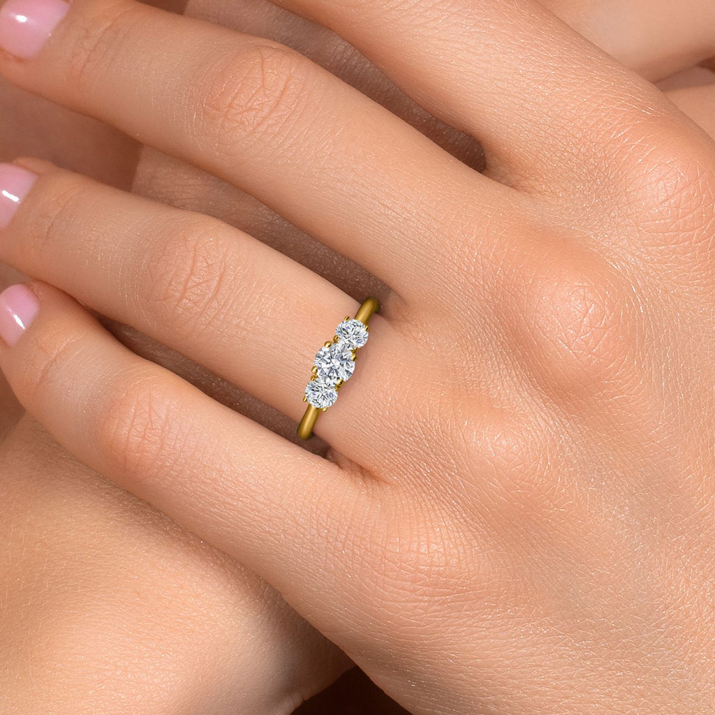 1.04 CTTW ROUND-CUT LAB GROWN DIAMOND BRILLIANCE: This exquisite engagement ring features a central 5mm round-cut lab-grown diamond, flanked by two 4mm round-cut lab-grown diamonds, totaling 1.04 carats. The diamonds boast DEF color and VVS-VS clarity, offering exceptional brilliance and fire. As April birthstones, they symbolize strength and eternal love, making this ring a meaningful choice for a lifelong commitment.