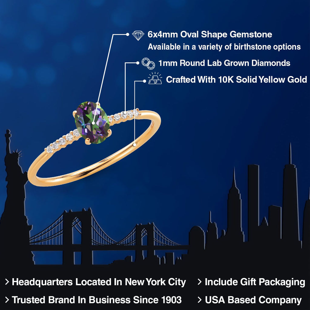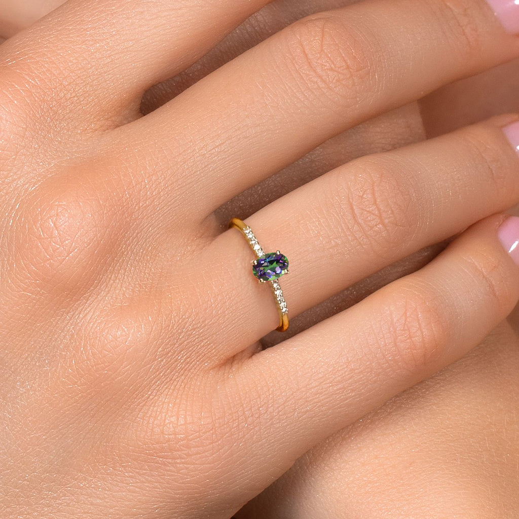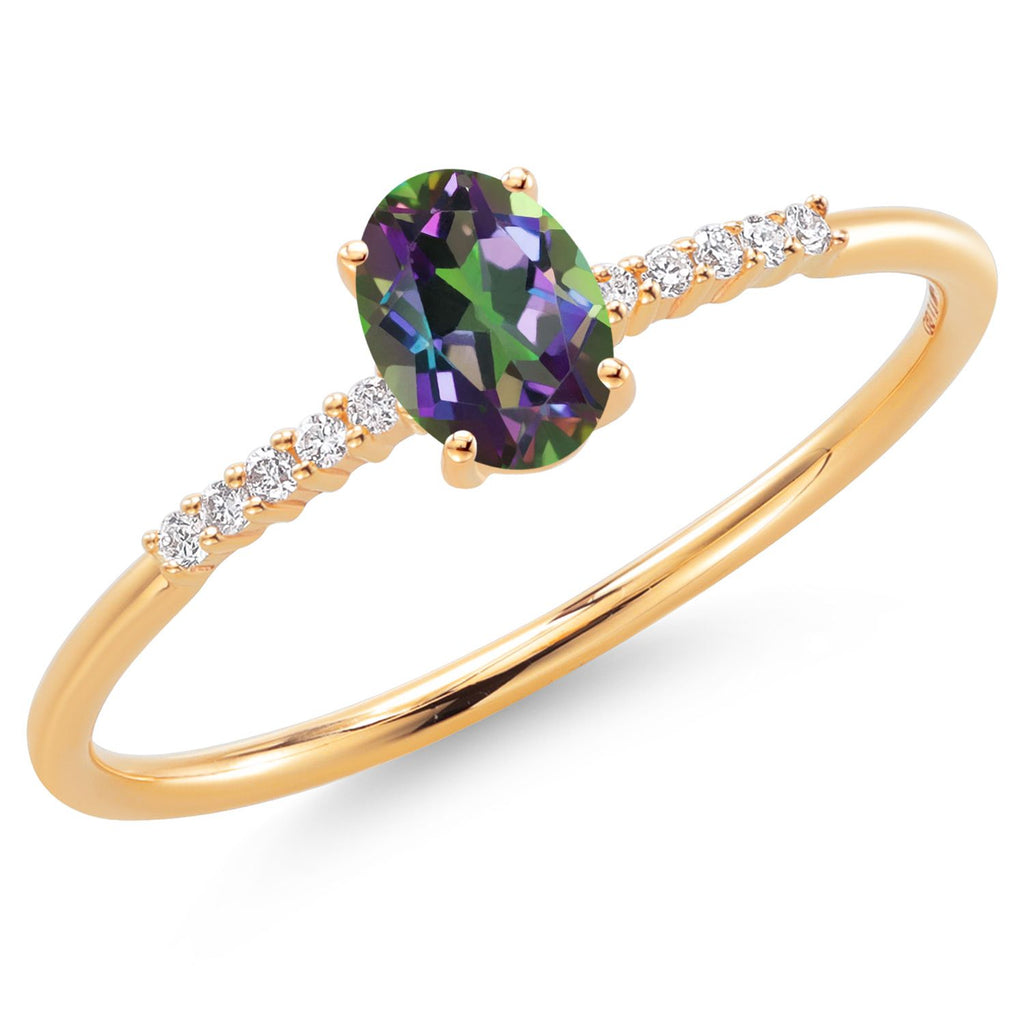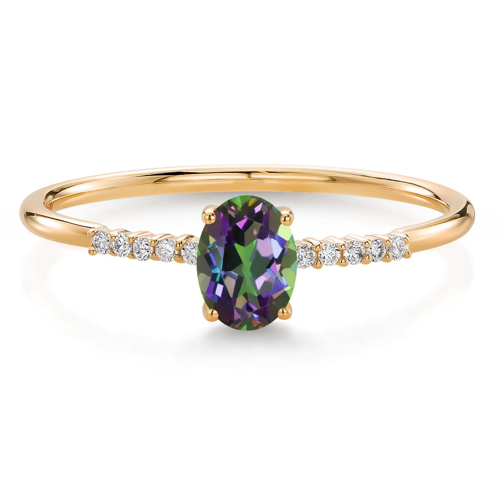 MEASUREMENTS: 6x4mm Oval Coated Green Mystic Topaz, 1x1mm Round E - F Lab Grown Diamond. Total Carat Weight is 0.65 cttw