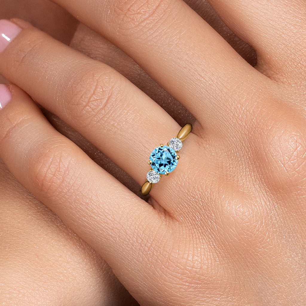 ROUND SWISS BLUE TOPAZ AND LAB GROWN DIAMOND GEMSTONES: This elegant 3-stone engagement ring features a 6MM Swiss blue topaz center stone with sparkling lab grown diamond accents totaling 1.22 carats, symbolizing clarity, love, and devotion.